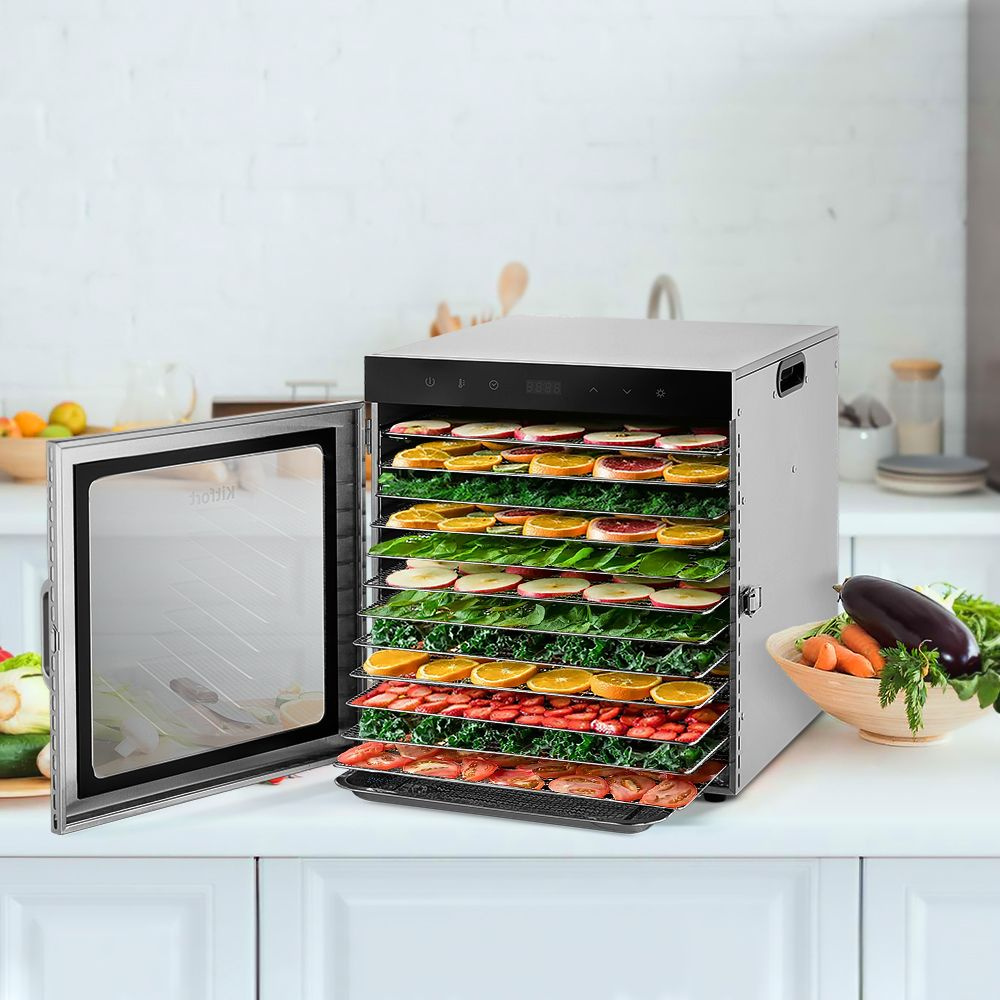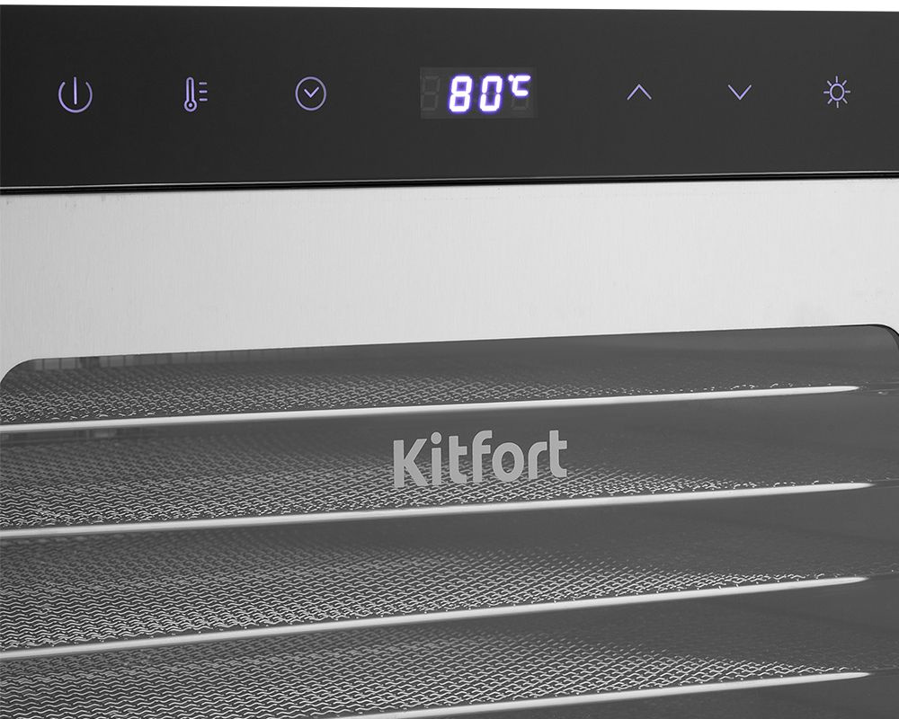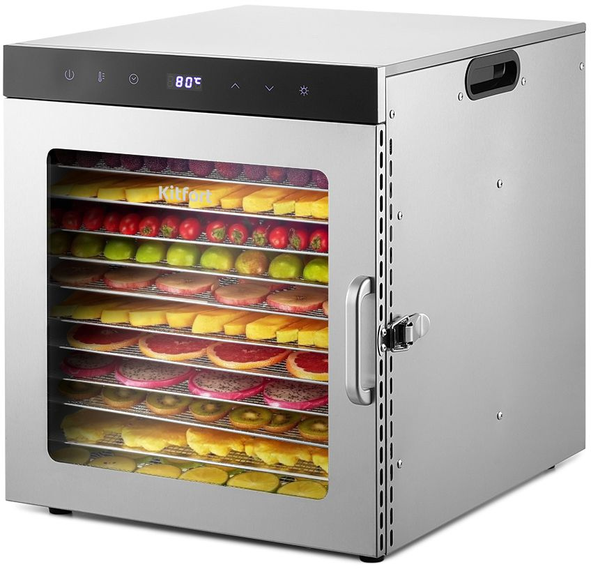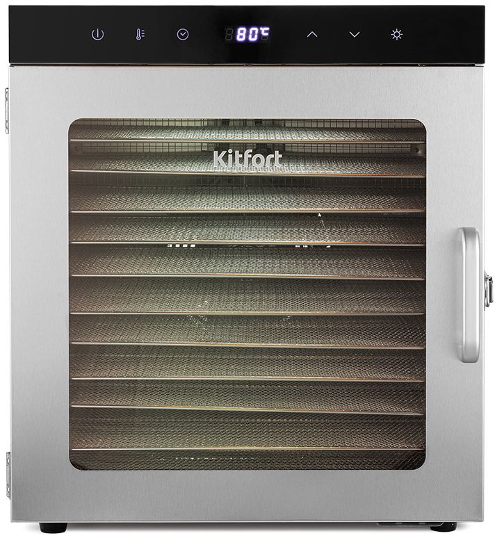 Вместительная сушилка для овощей и фруктов КТ-1951 на 12 поддонов и с прозрачной дверцей сохранит любимые фрукты и овощи полезными круглый год! Она насушит на всю зиму мясо, рыбу, помидоры, клубнику, персики, грибы, зелень, хлеб.
