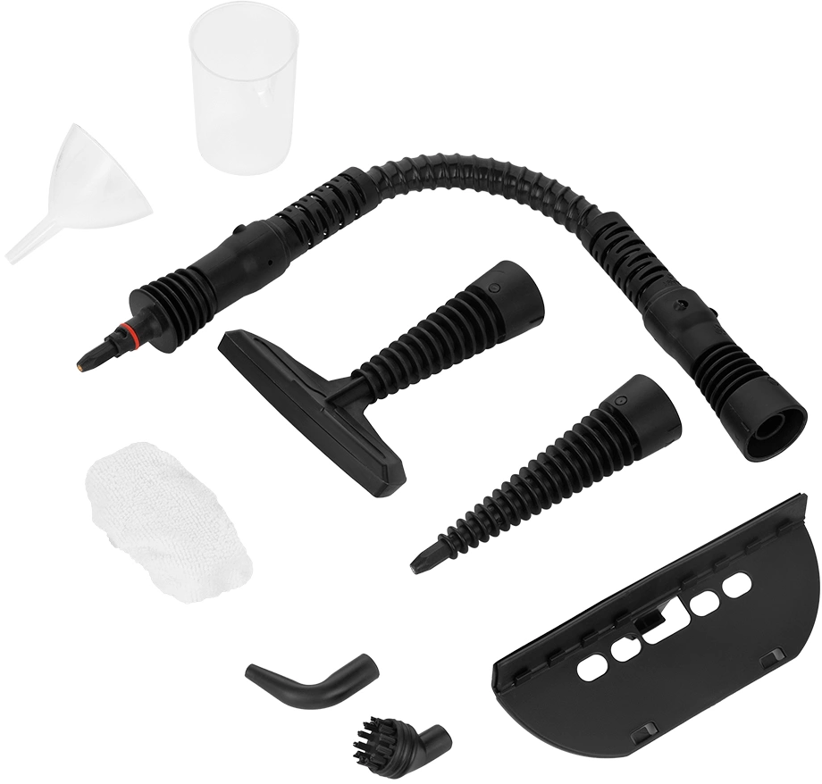 Струйная насадка, угловая насадка, круглая нейлоновая щетка, паровой шланг, насадка для отпаривания, тряпка для отпаривания, насадка с резиновым скребком.