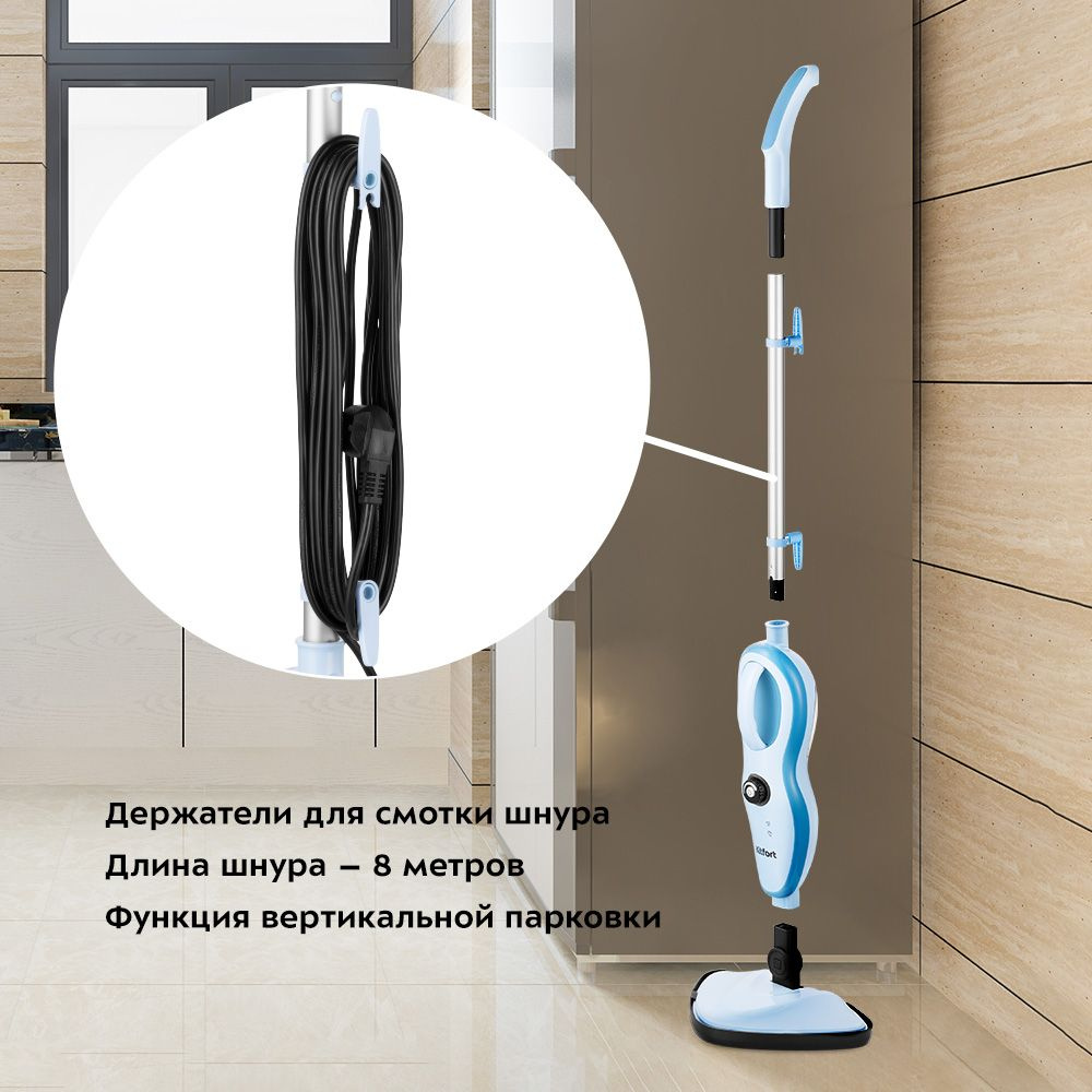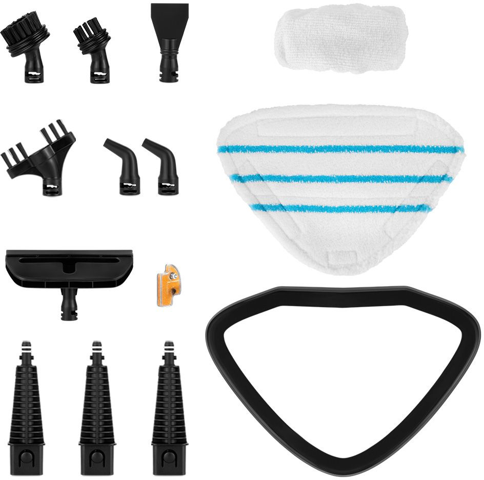 Улинительная ручка, щетка для пола, тряпка для пола - 2 шт., тряпка для отпаривания, рамка для ковра, угловая насадка, скребок, струйная насадка - 3 шт., насадка для отпаривания, малая и больш круглая нейлоновая щетка, плоская нейлоновая щетка.
