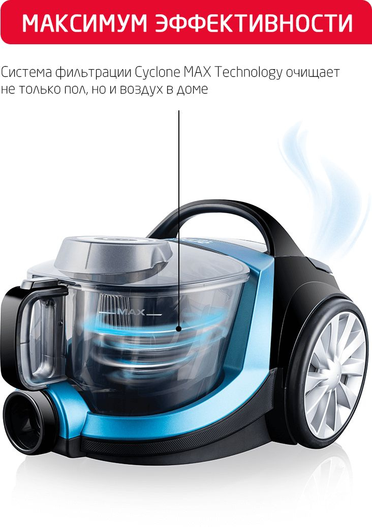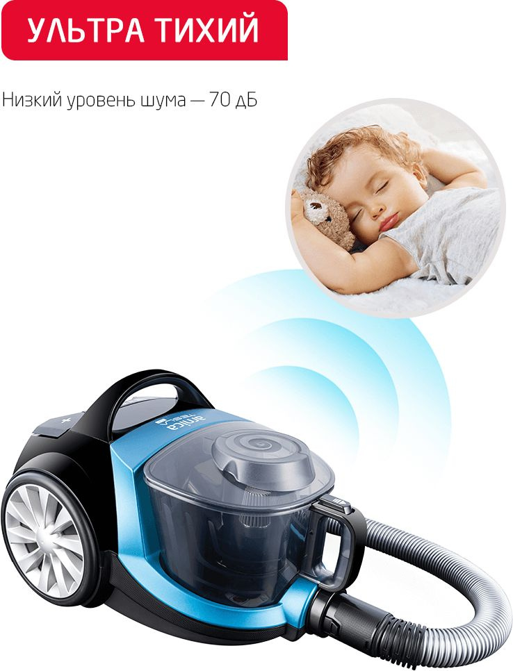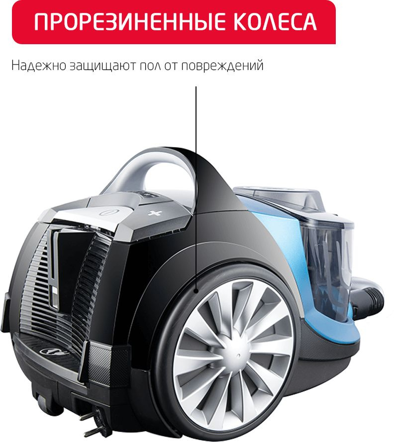 легко очищаемый пылесборник, место для хранения насадок, прорезиненные колеса, шланг