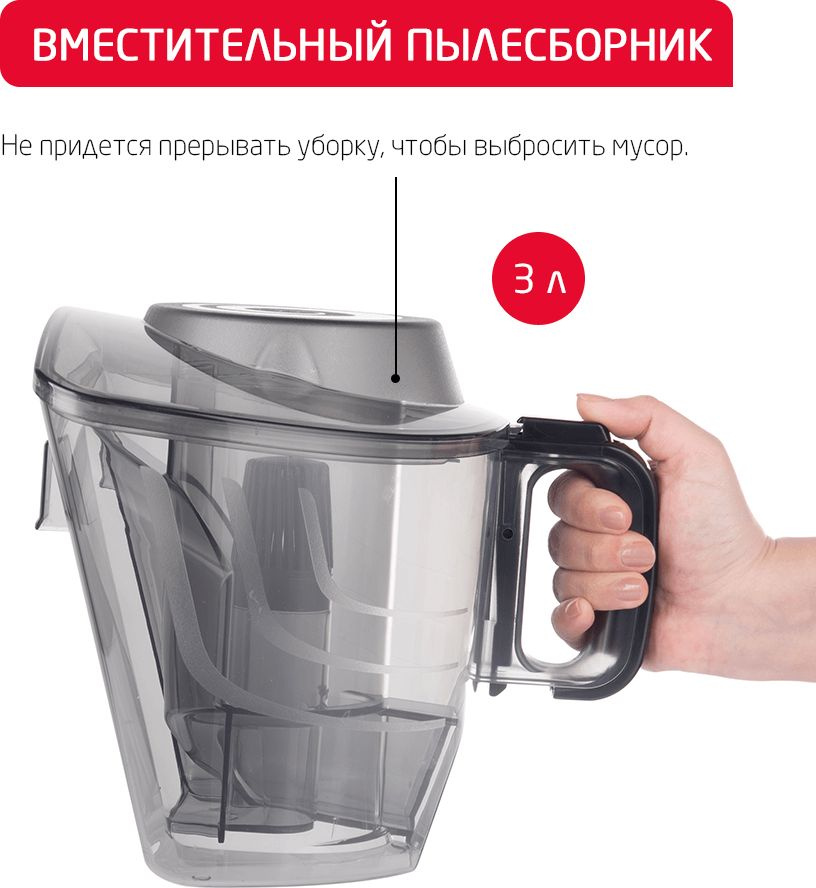 телескопическая труба 58-92 см., шланг для сухой уборки стандартный с дистанционным управлением на ручке, крепление для аксессуаров, моющийся HEPA-13 фильтр, моторный фильтр, поролоновый микрофильтр, LED Дисплей, батарейки в комплекте: ААА - 2 шт.