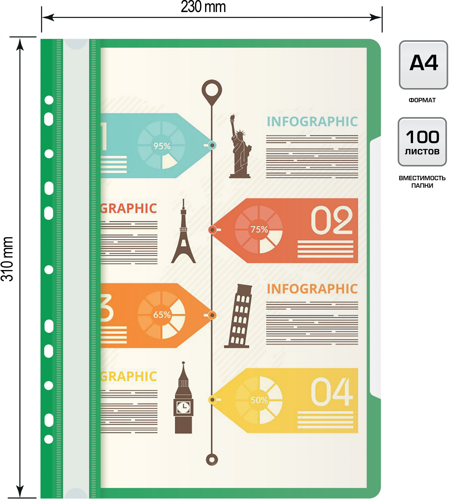Папка-скоросшиватель Бюрократ PS-P20GRN A4 прозрач.верх.лист боков.перф. пластик зеленый 0.12/0.16