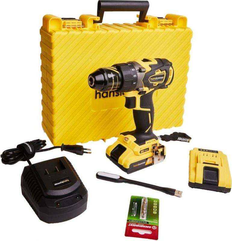 Дрель-шуруповерт, зарядное устройство, USB LED фонарик, двойные биты, аккумуляторная батарея - 2 шт., кейс.