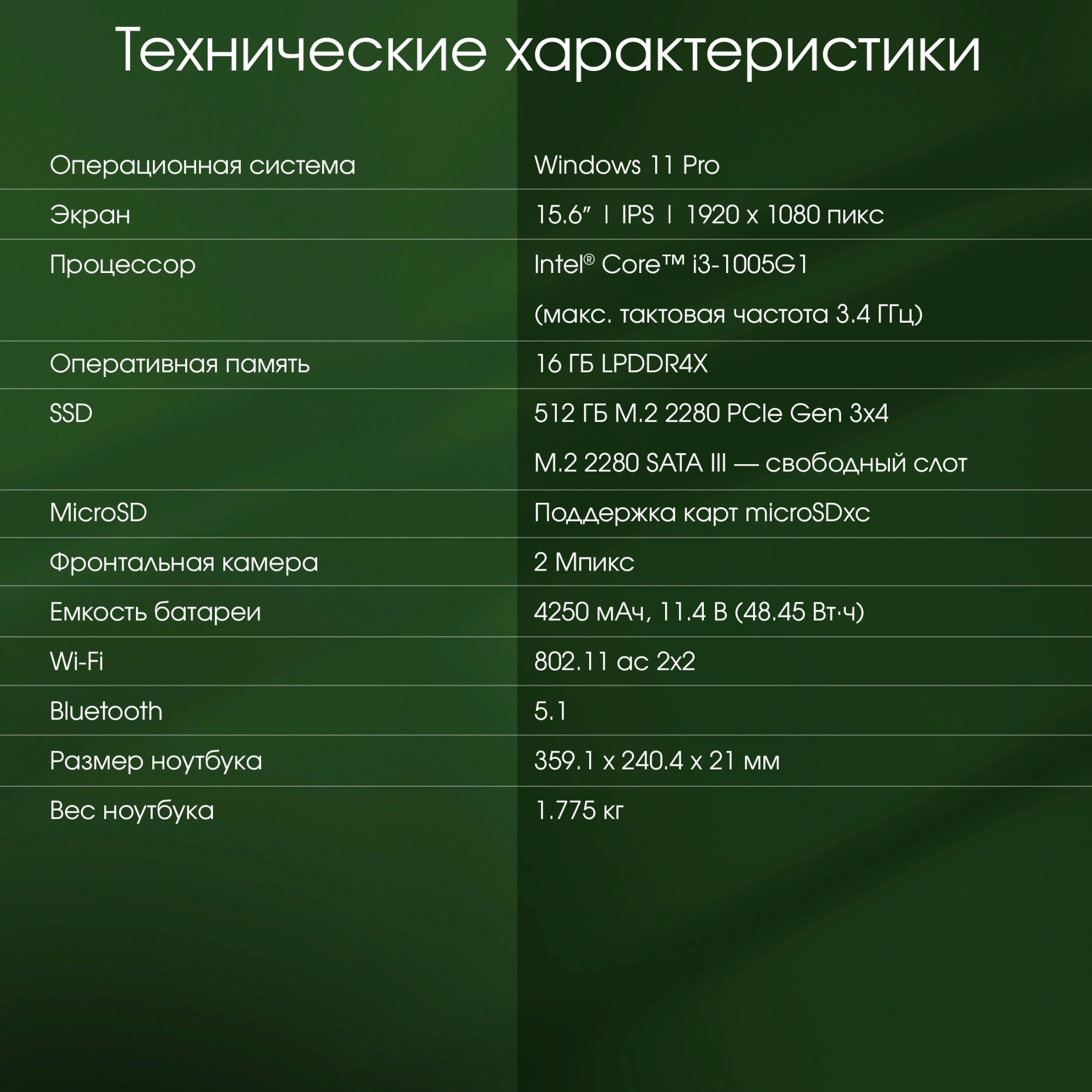 Предустановленная ОС Windows 11 Professional позволит приступить к работе на ноутбуке сразу после включения. Платформа удачно совмещает удобный интерфейс, широкие возможности для кастомизации, поддержку распространенного ПО и оборудования.