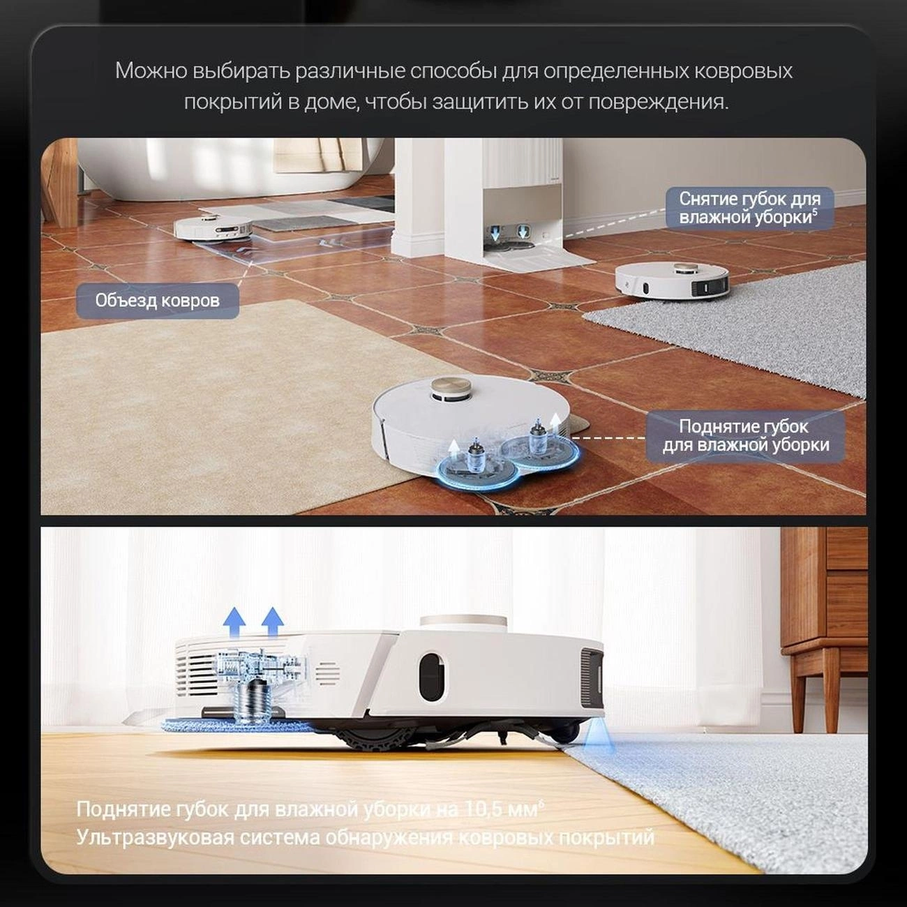 боковые щетки, датчик загрязнения, датчик обнаружения препятствий, датчик падения, датчик перепада высоты, индикация застревания, камера, мягкий бампер