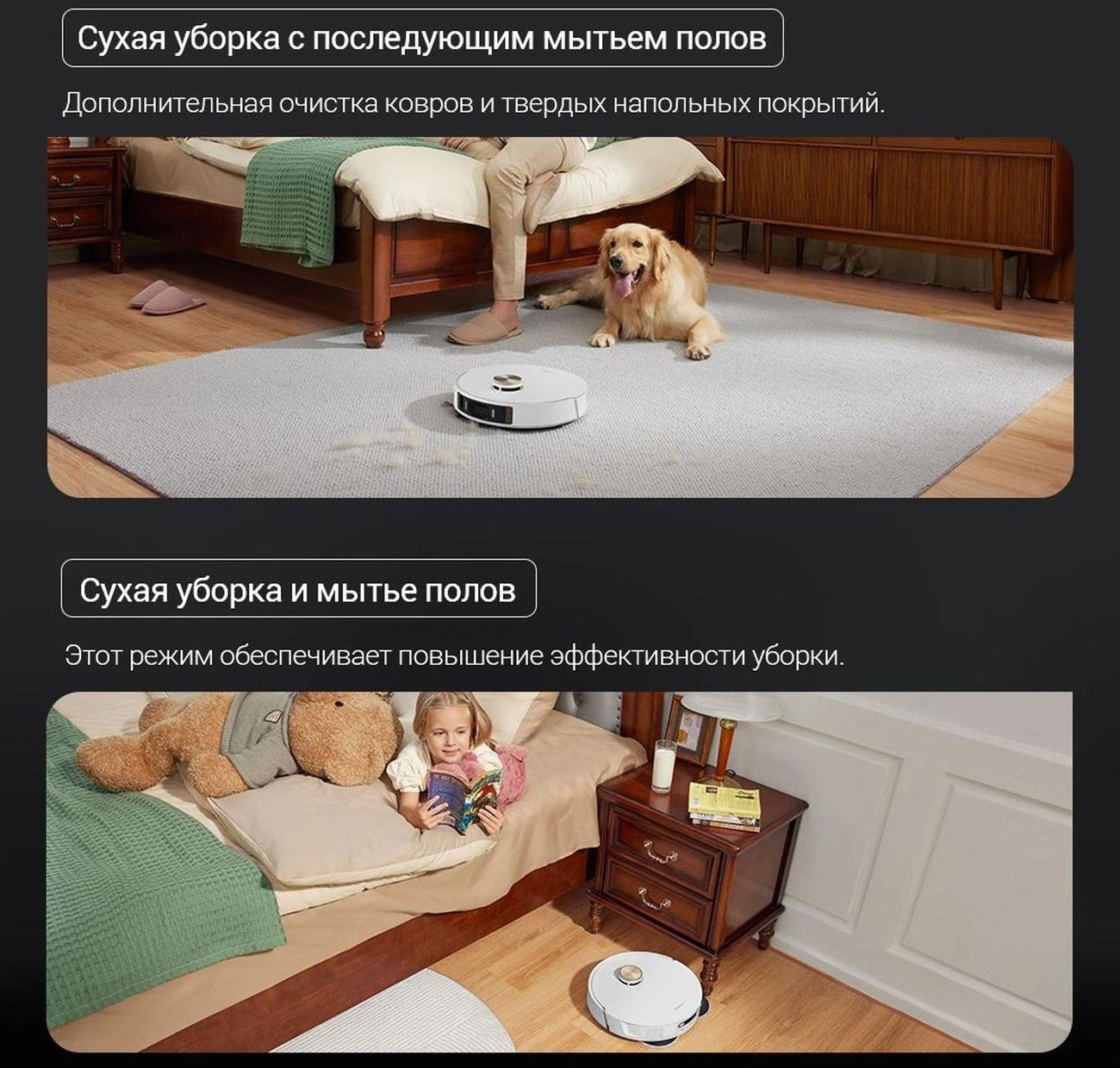 автоматическая работа, автоматический поиск зарядного устройства, построение карты помещения, таймер включения, таймер на каждый день недели, уборка по расписанию, управление со смартфона