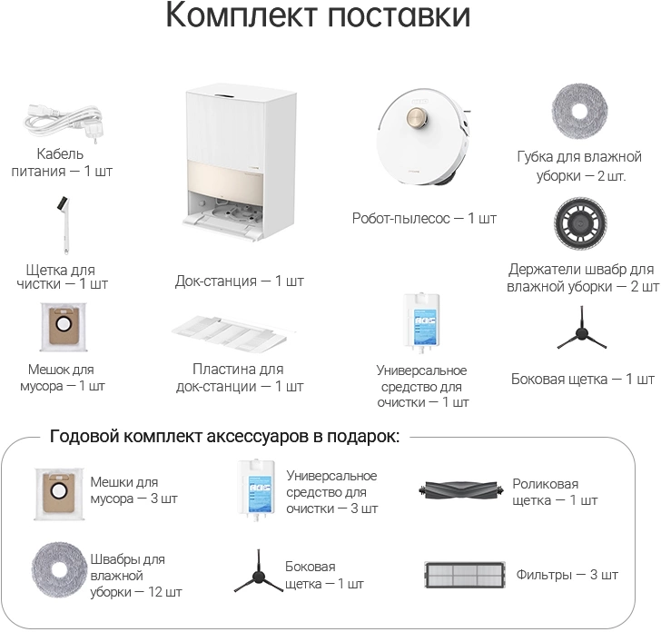Кабель питания, Инструмент для очистки, Мешок для сбора пыли 5 (2 Хранится в пылевом баке), Держатель швабры 2, Раствор для очистки 4, руководство пользователя, Фильтр пылесборника 4 (1 предустановлен), Удлинительная пластина рампы базовой станции, Базовая станция, Робот-пылесос.