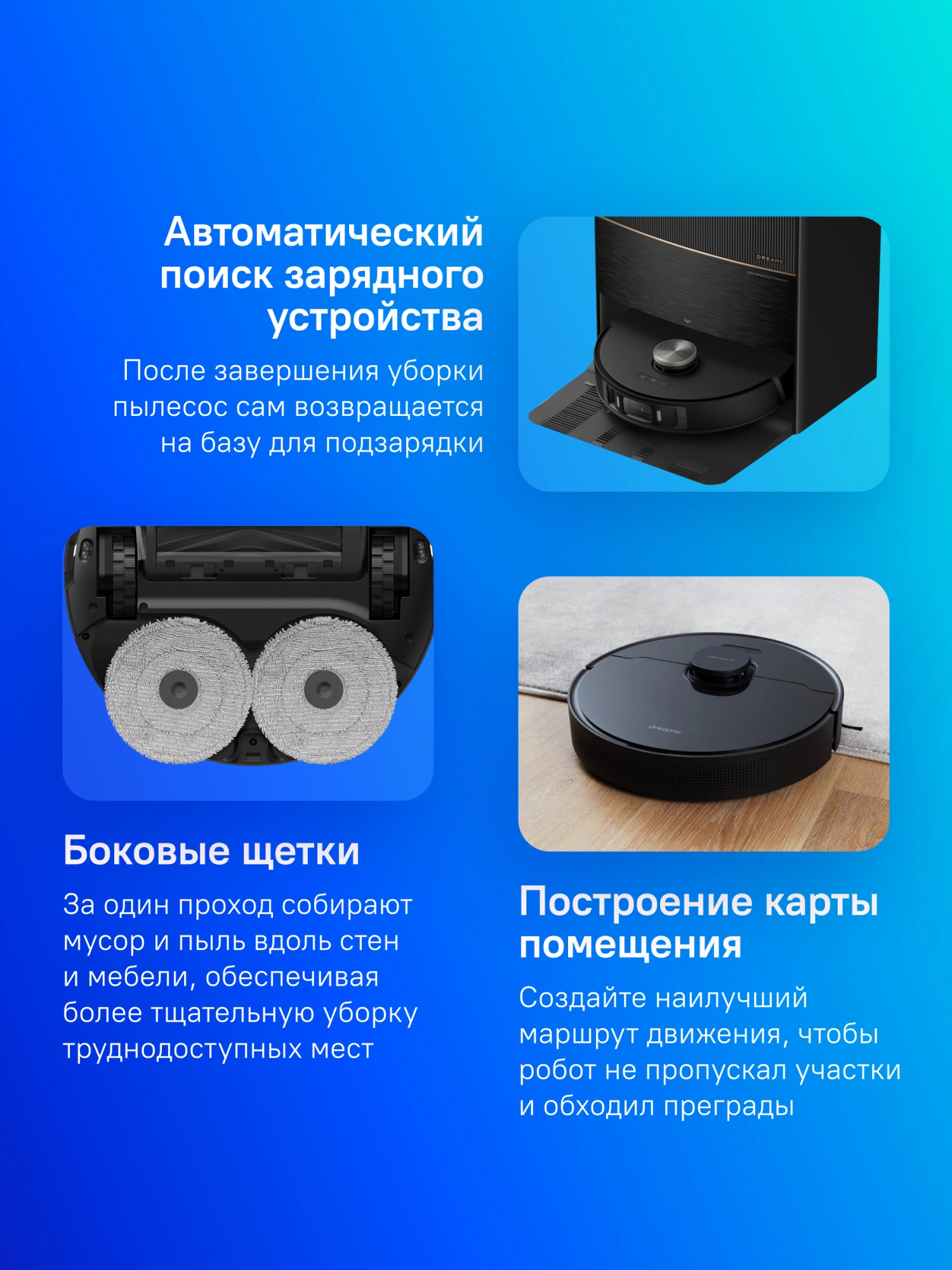автоматическая работа, автоматический поиск зарядного устройства, построение карты помещения, таймер включения, таймер на каждый день недели, уборка по расписанию, управление со смартфона