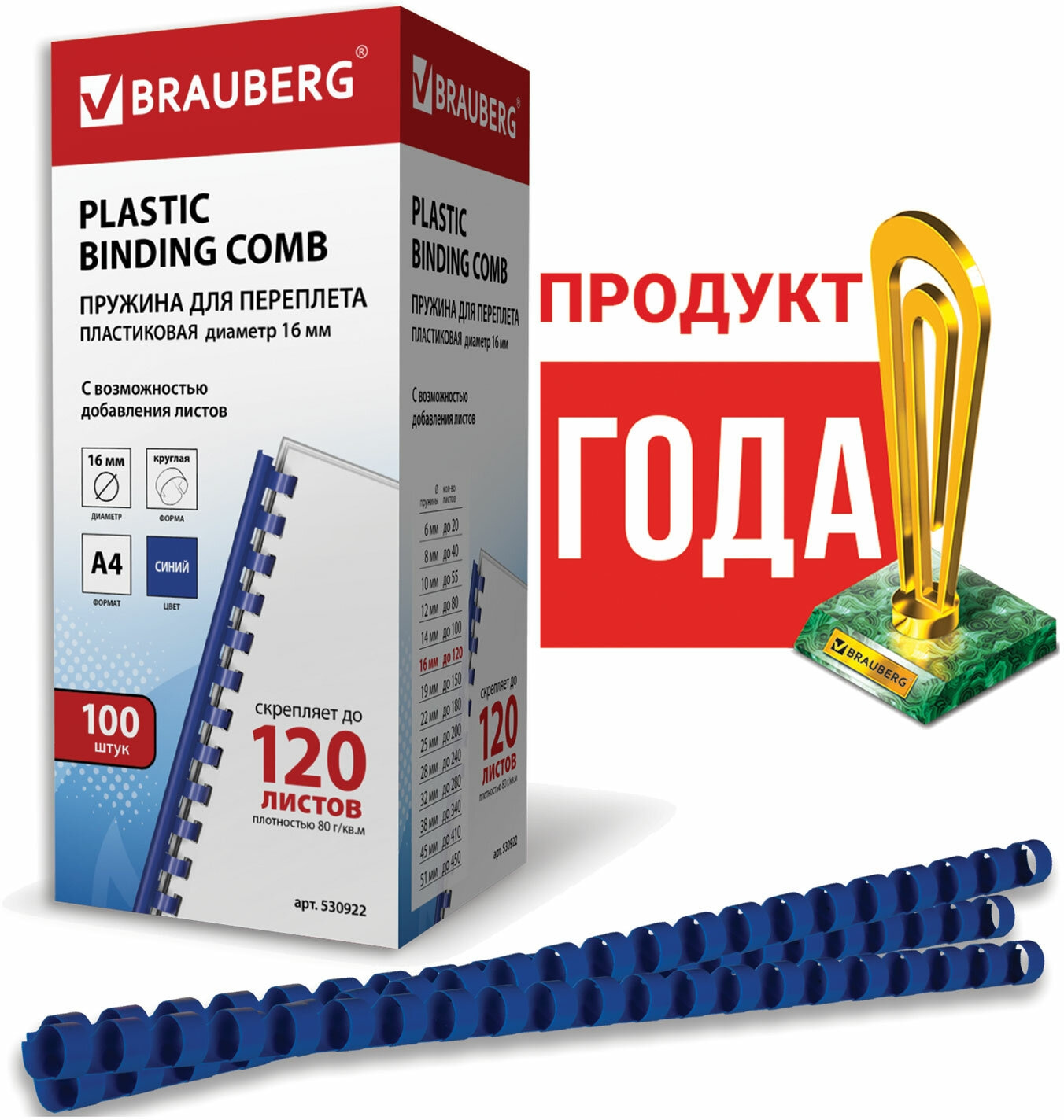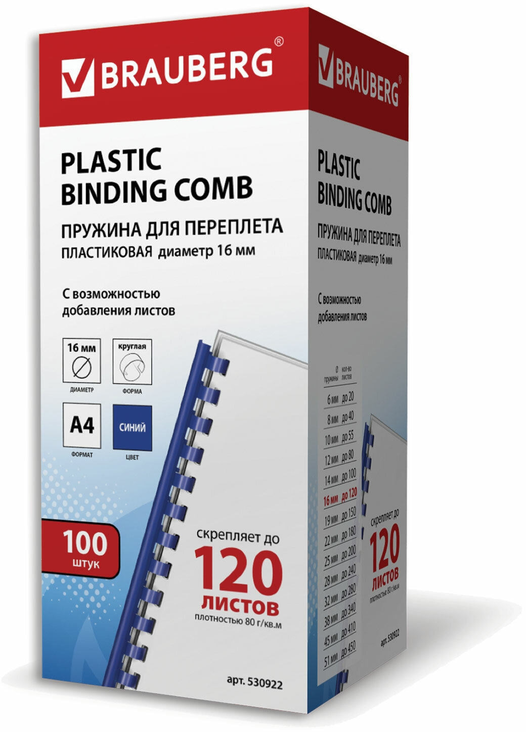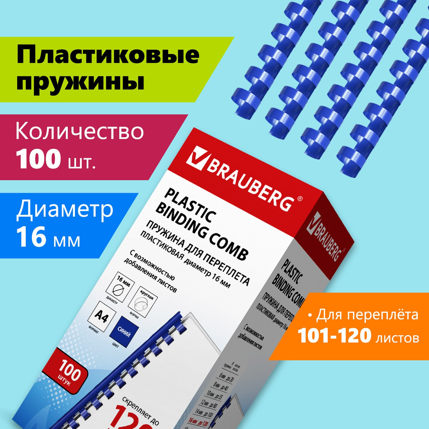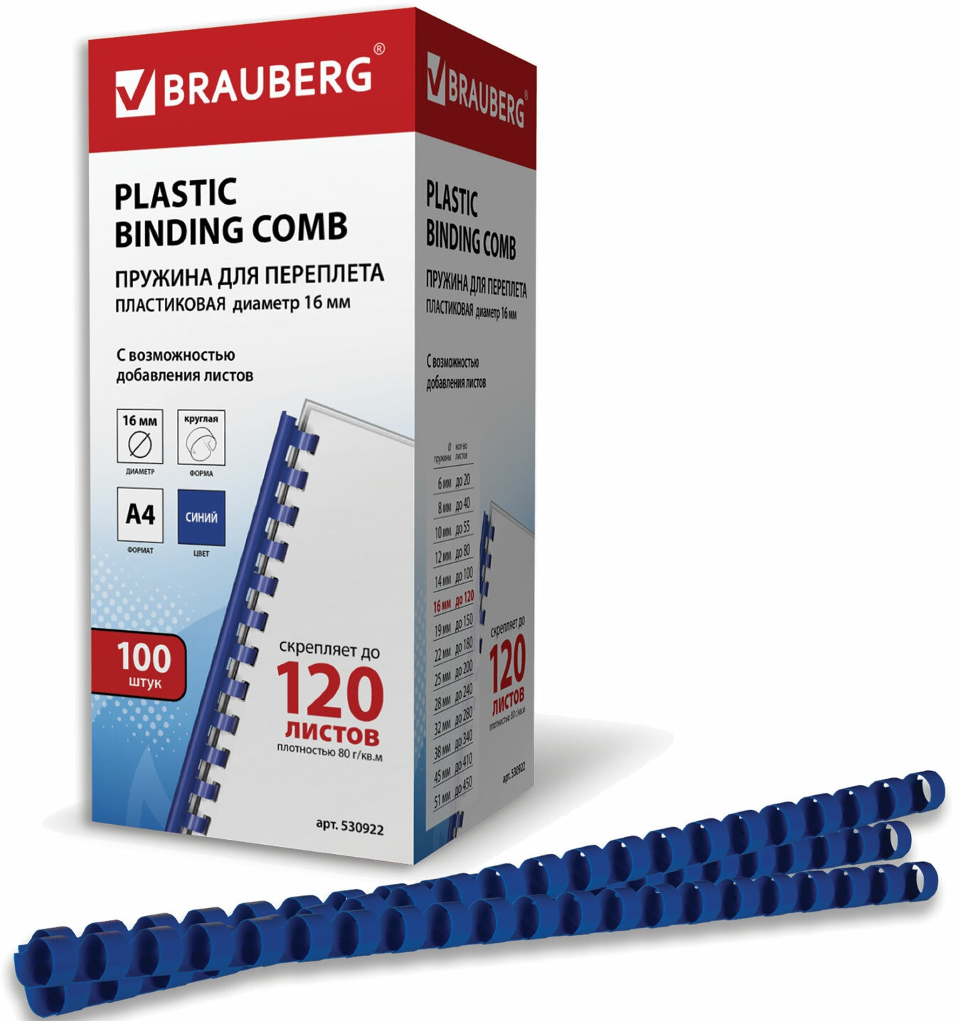Пружины для переплета пластиковые Brauberg d=16мм 101-120лист A4 синий (100шт) 530922