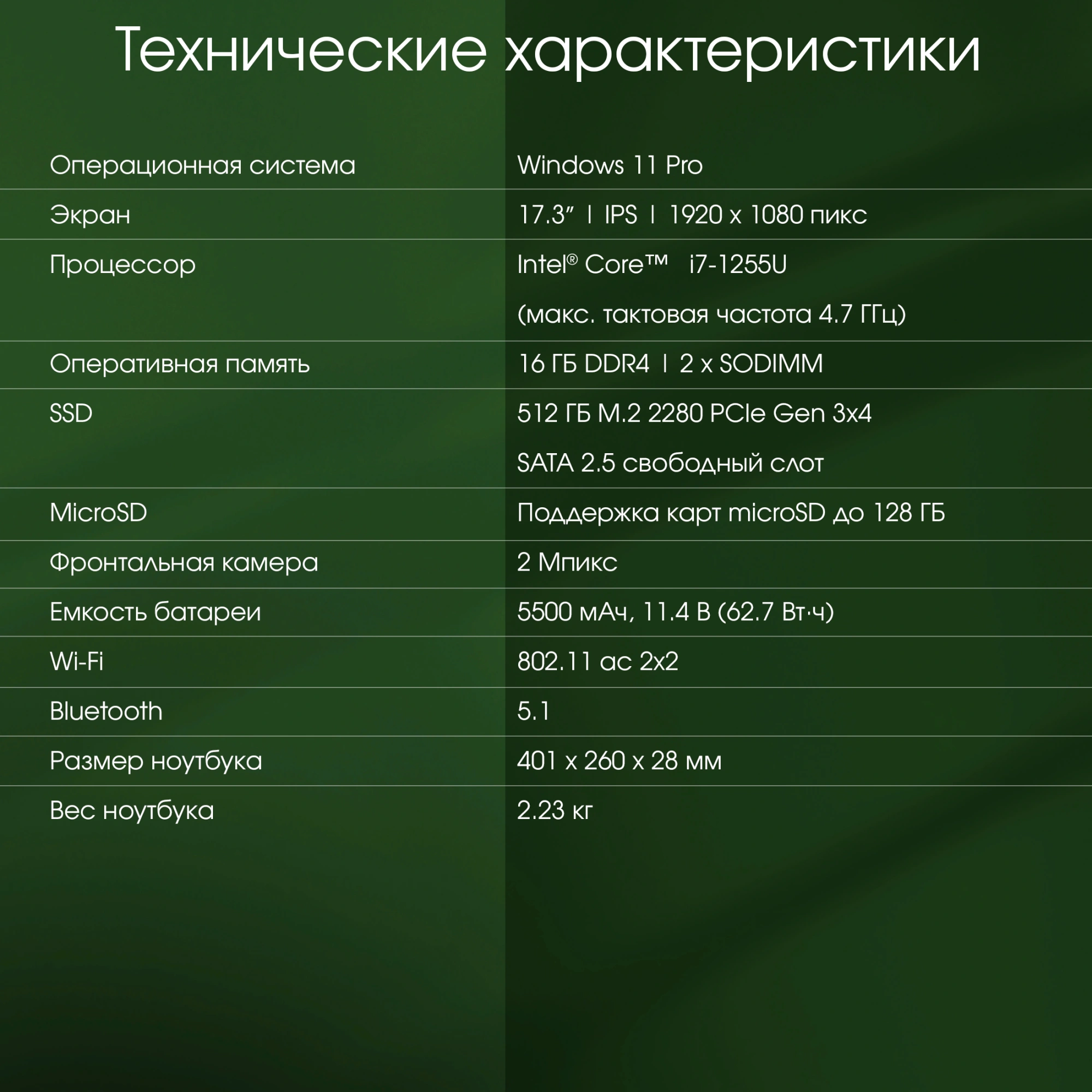 Ноутбук DIGMA PRO Fortis M получил 17,3-дюймовый IPS-дисплей с Full HD-разрешением, который отличается естественной цветопередачей и широкими углами обзора, а также позволит комфортно работать с большими Excel-таблицами и смотреть фильмы в широкоэкранном формате с соотношением сторон 16:9. Используя цифровой видеовыход HDMI или универсальный разъем Type-C с возможностью передачи видео, с компьютера можно вывести изображение на внешний монитор или телевизор.