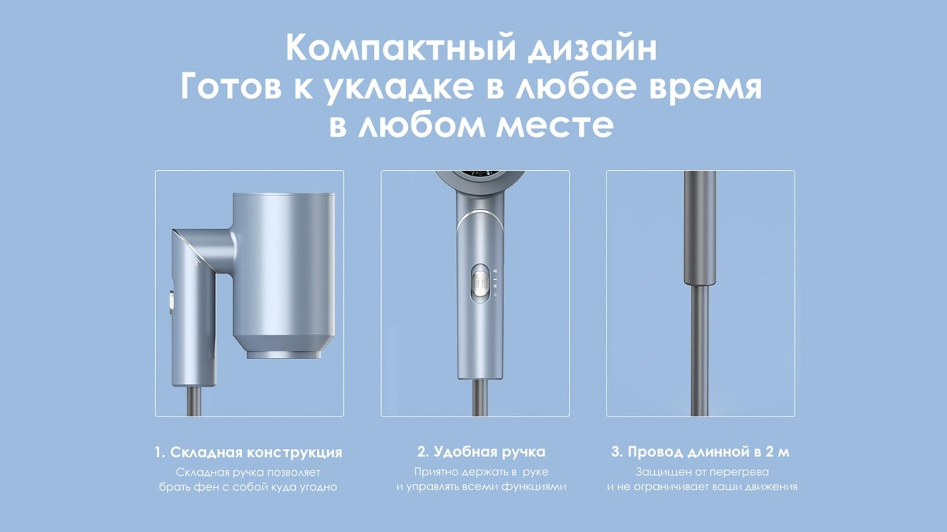 Компактная и легкая модель со складной ручкой отлично подойдет как для дома, так и для путешествий, не будет занимать много места и веса в багаже. У фена есть все необходимое; высокая мощность 1800 Вт, ионизация 50 млн. ионов, умный контроль температуры и 3 режима работы (горячий, средний, холодный)