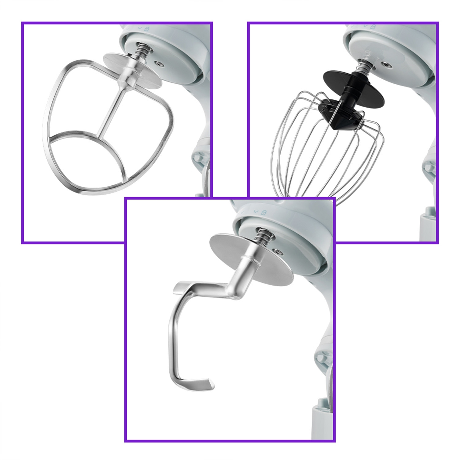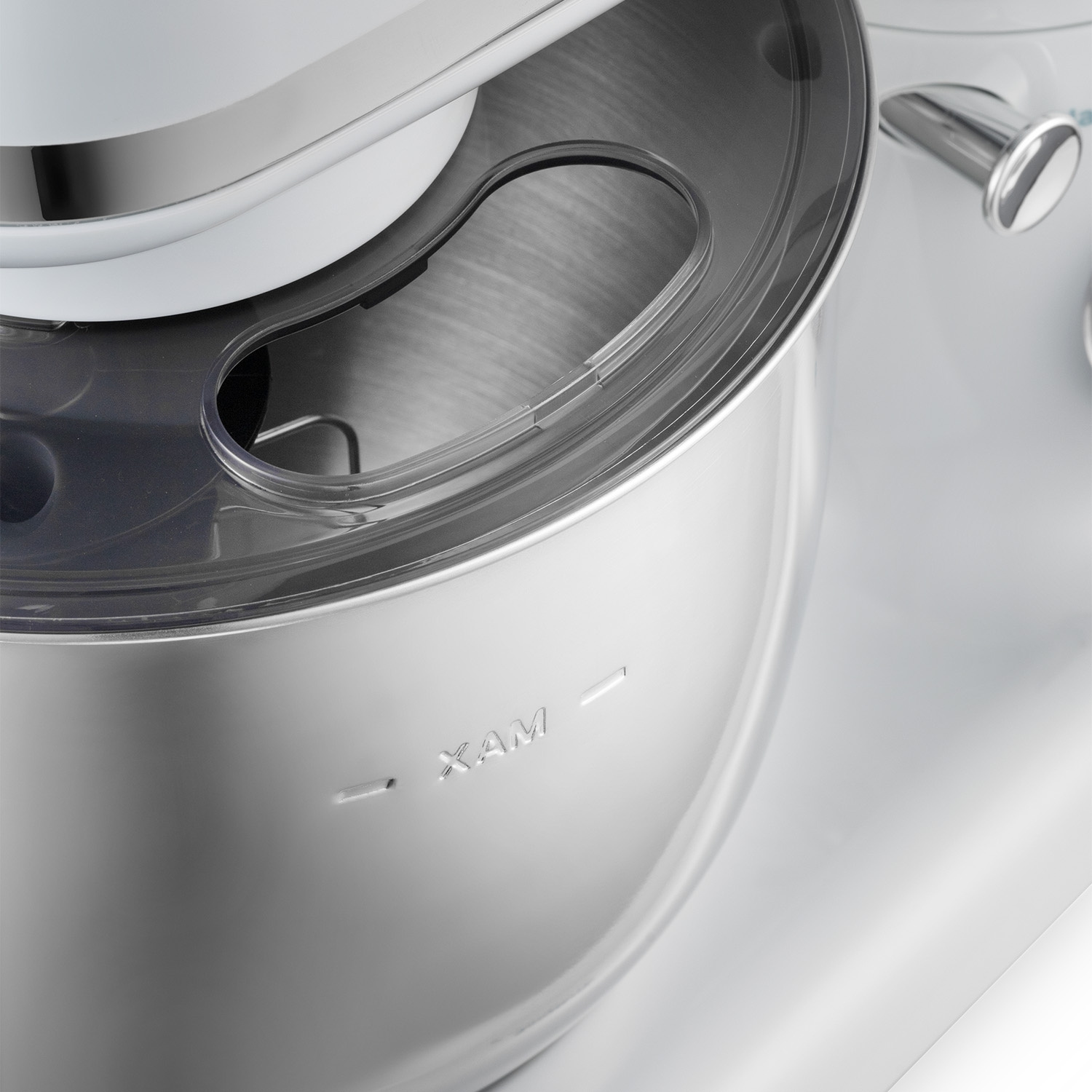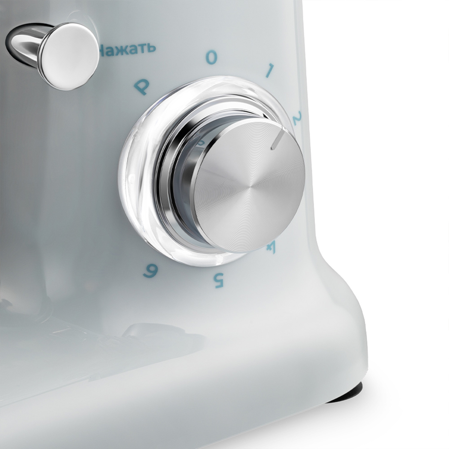 Планетарный миксер (моторный блок, чаша миксера, крышка чаши), венчик для взбивания, насадка для смешивания, крюк для замешивания, руководство по эксплуатации, коллекционный магнит* (*опционально)