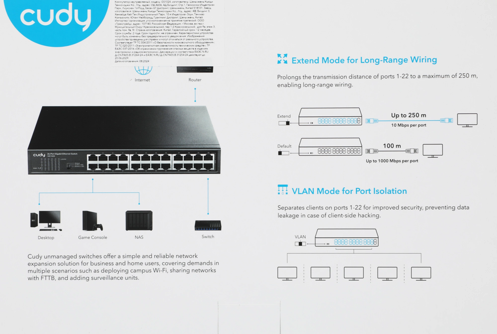 Коммутатор, кабель питания, набор крепежа, инструкция.