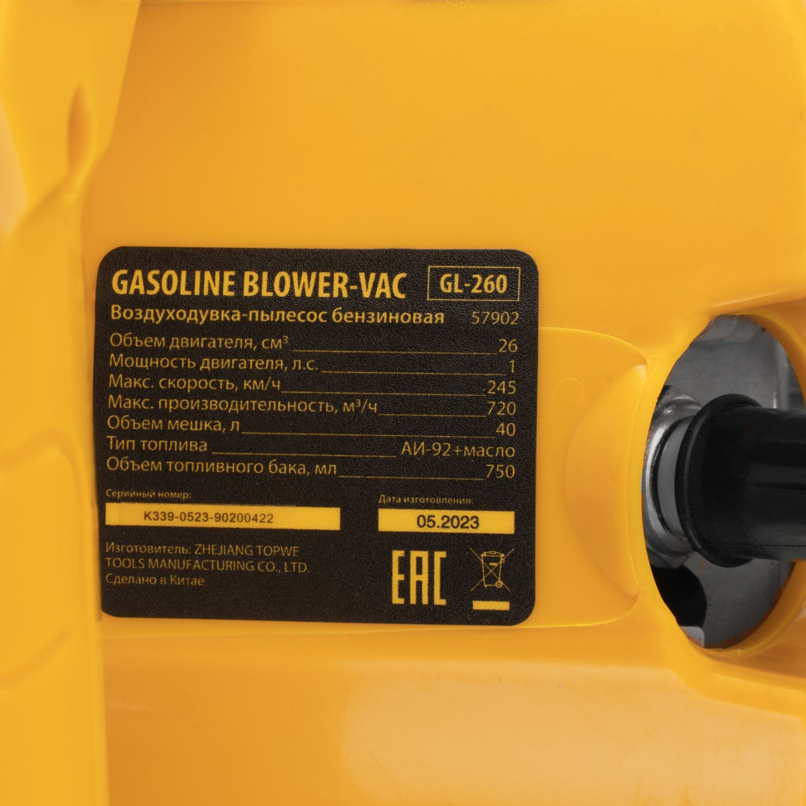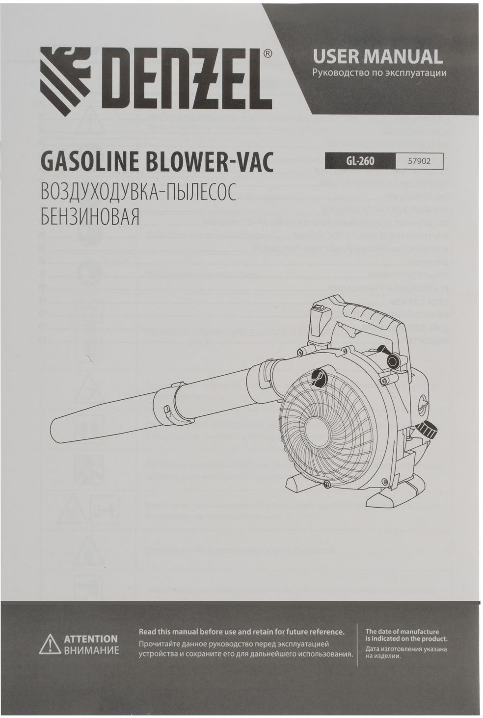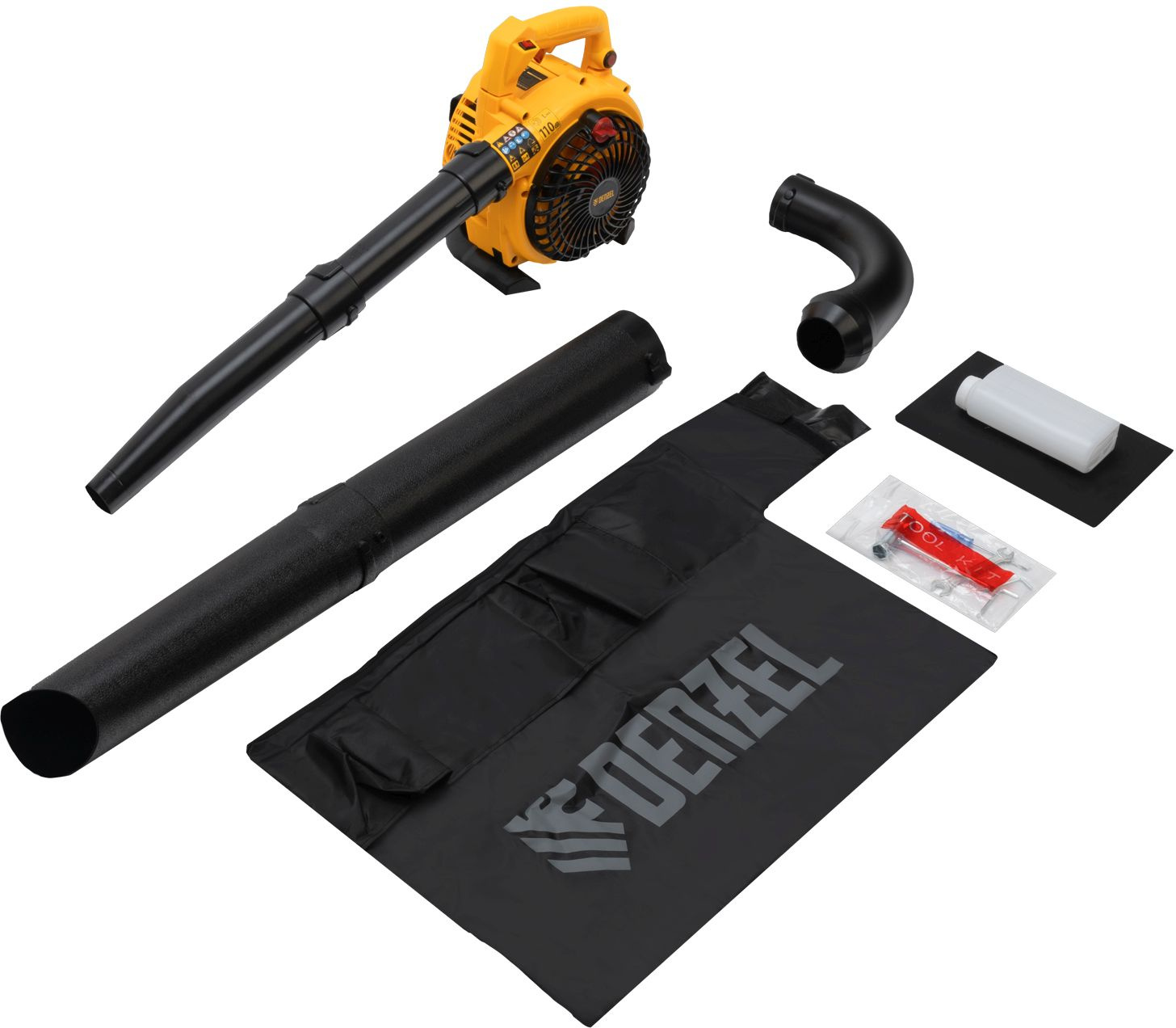 Воздуходувка-пылесос бензиновая, труба напорная (из двух частей: тип А и тип В), труба всасывающая (из двух частей: тип С и тип D), труба разгрузочная, набор инструментов, дозатор для приготовления смеси, мешок для мусора с ремнем, руководство пользователя.
