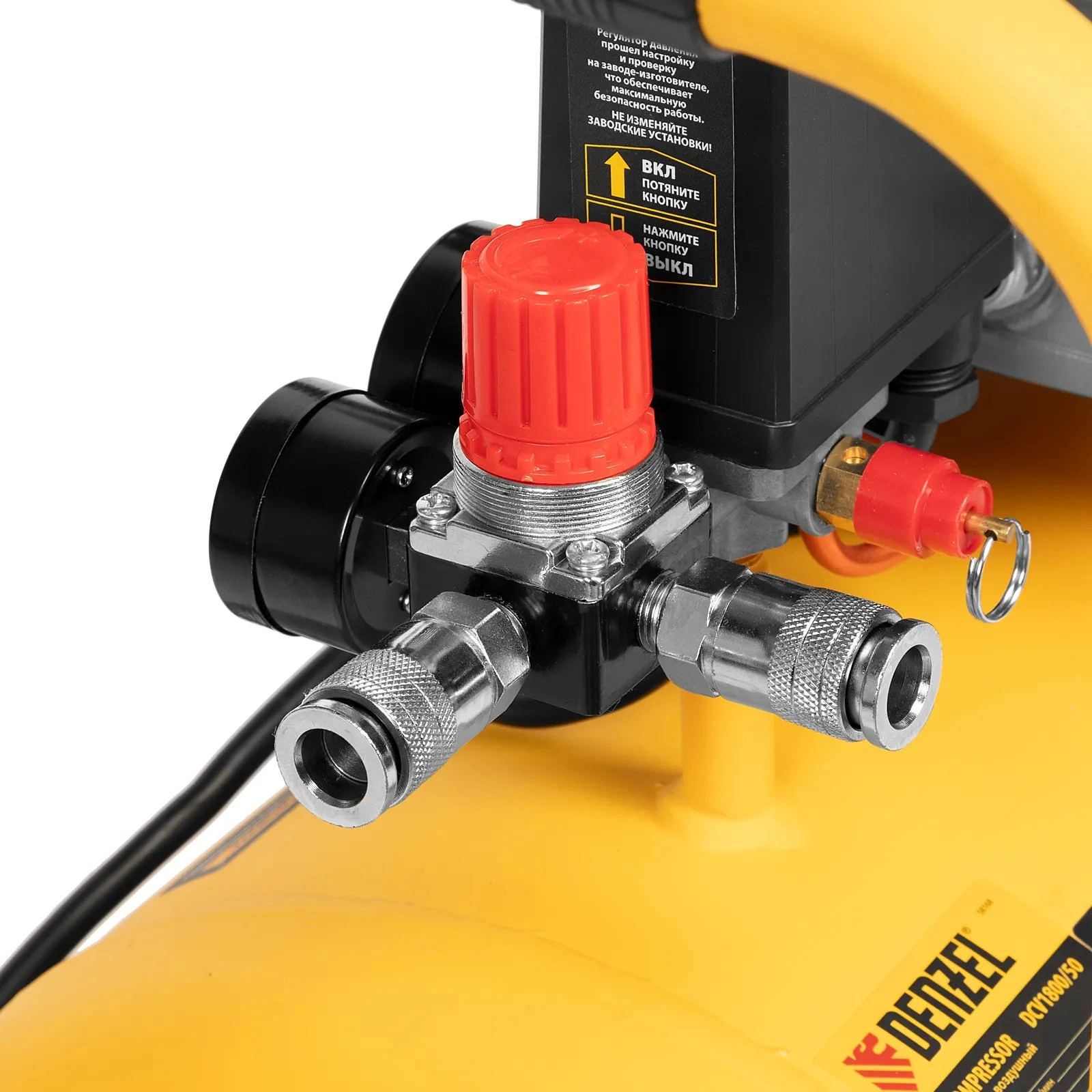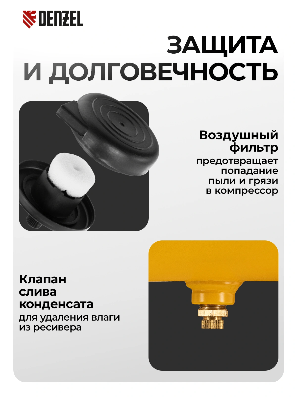Мощный мотор и двухцилиндровая конструкция - высокая производительность. Ресивер 50 литров - работа с пневмоинструментом со средним уровнем потребления воздуха. Защита от перегрева обмоток мотора. Защита от перегрузки. Колеса и амортизирующие опоры - для снижения вибрации. Регулятор давления и 2 м