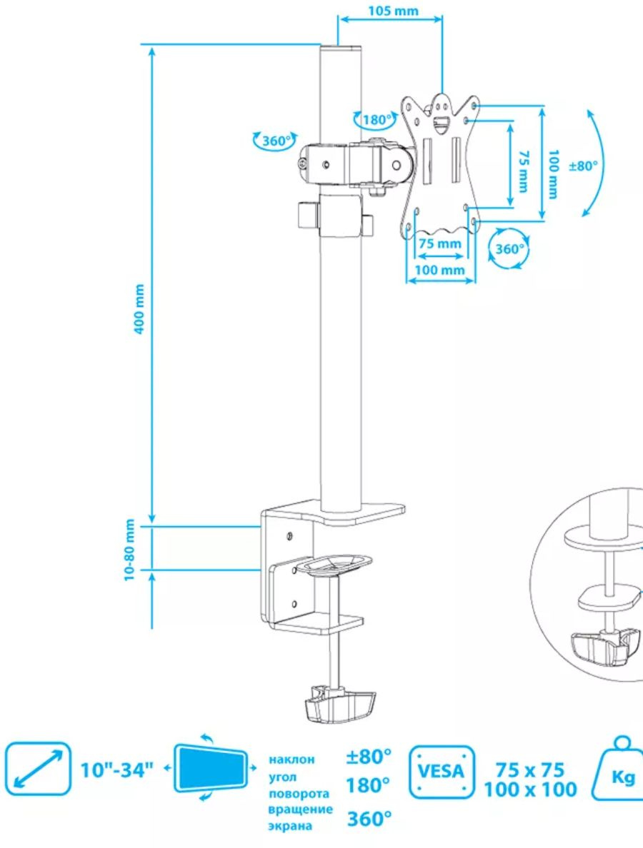 черный 10"-34" макс.10кг настольный поворот и накл...