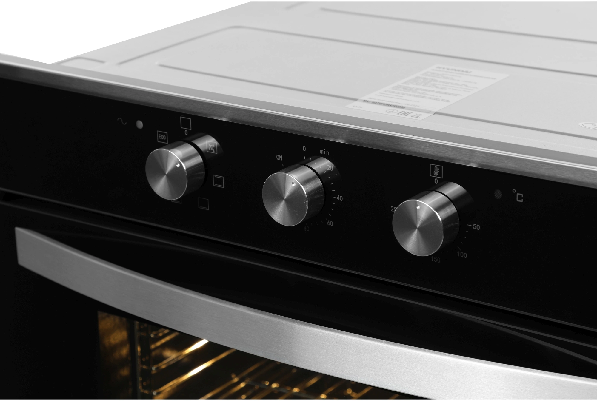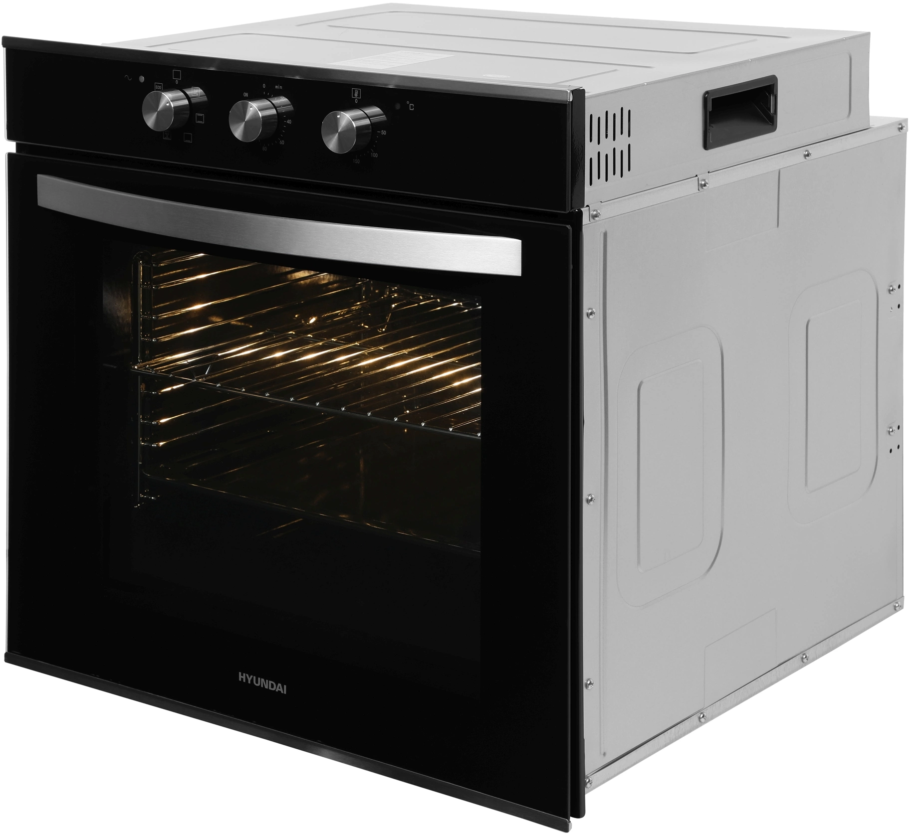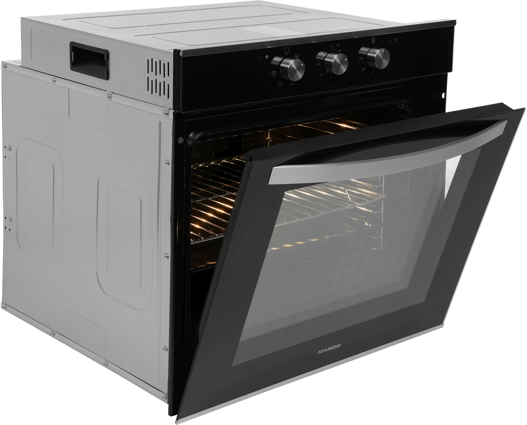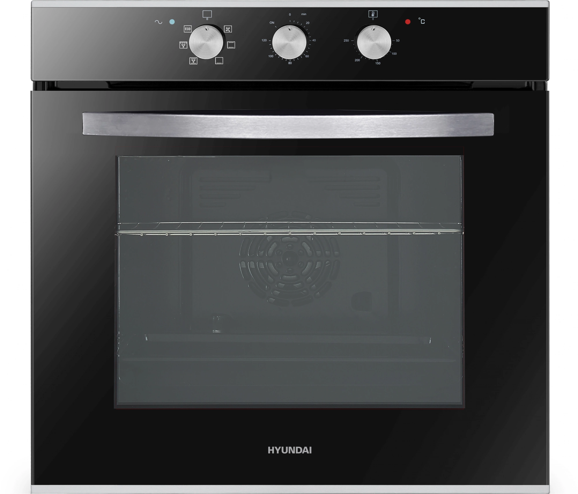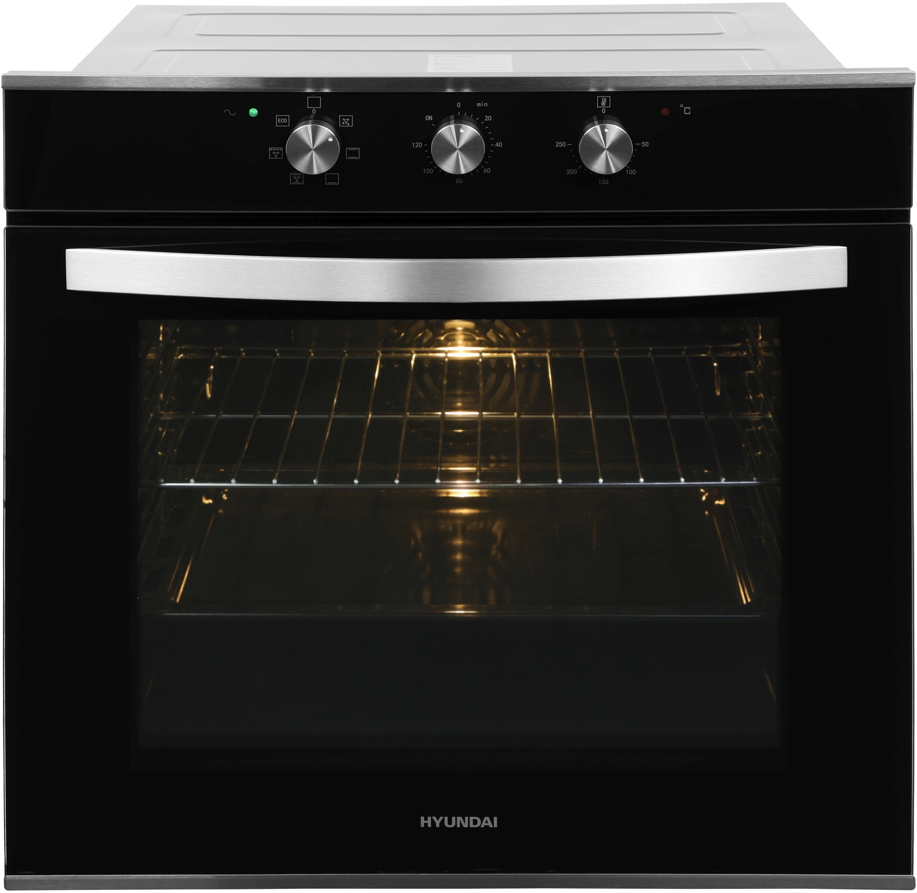 Механическое управление. Оцените комфортный доступ к нужным функциям. У духовки три поворотных регулятора. Один – поможет выбрать режим приготовления. Другой – установить таймер на время до 120 минут. Третий – настроить температуру нагрева в диапазоне от 50 до 250 °С. Благодаря мощности 2800 Вт модель Hyundai HEO 6634 IX хорошо разогревается и позволит быстрее приступить к запеканию блюд.