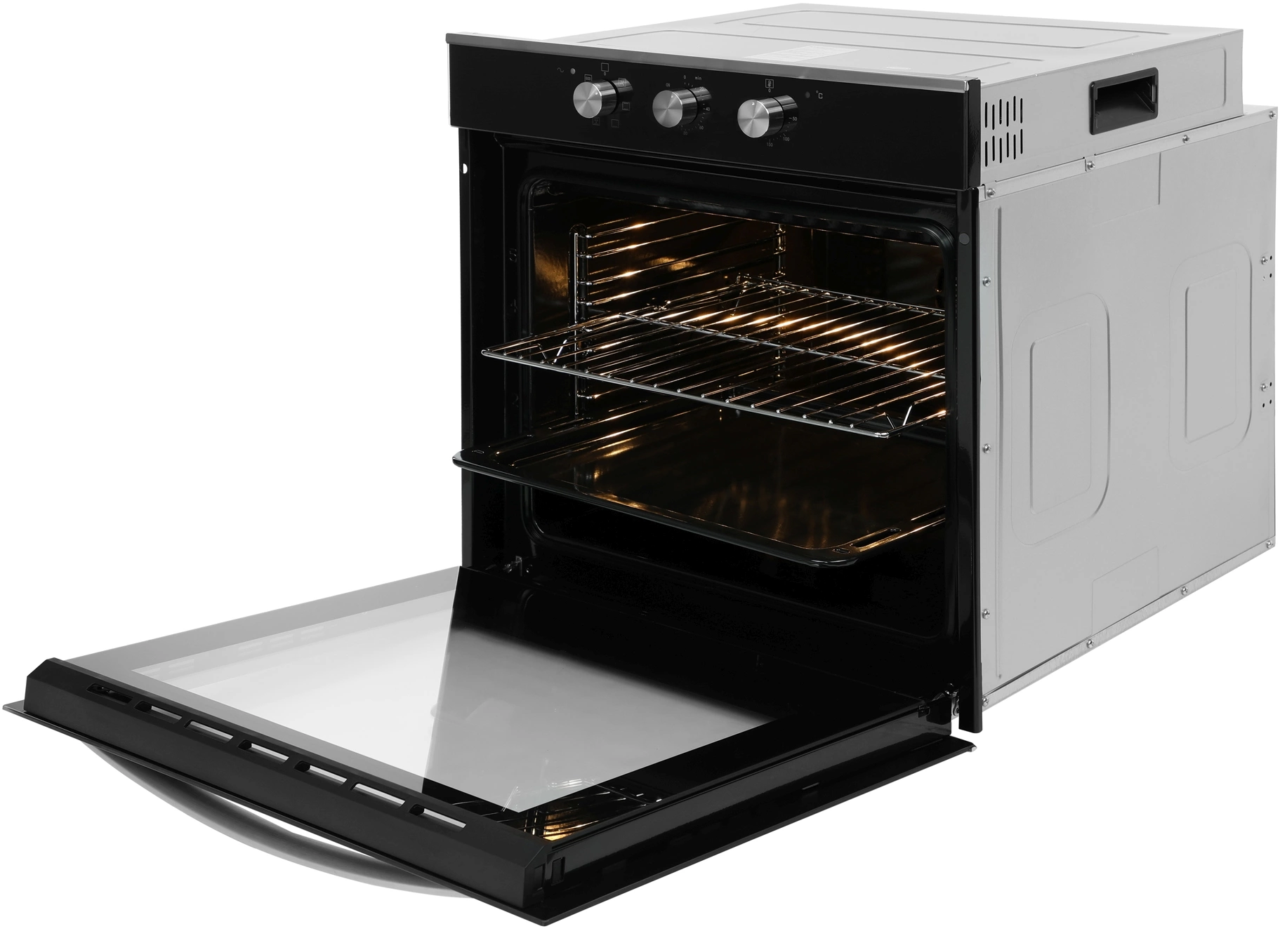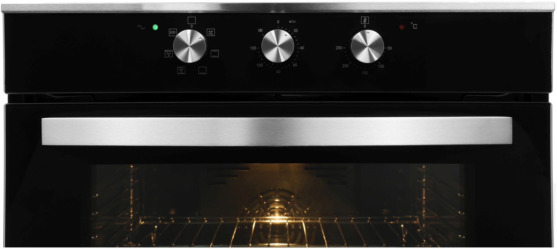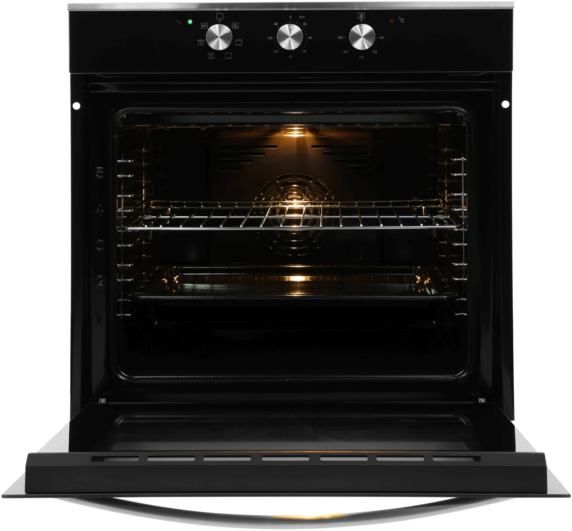 Стильный дизайн. Духовка выглядит элегантно благодаря черной стеклянной дверце, серебристым переключателям и ручке.