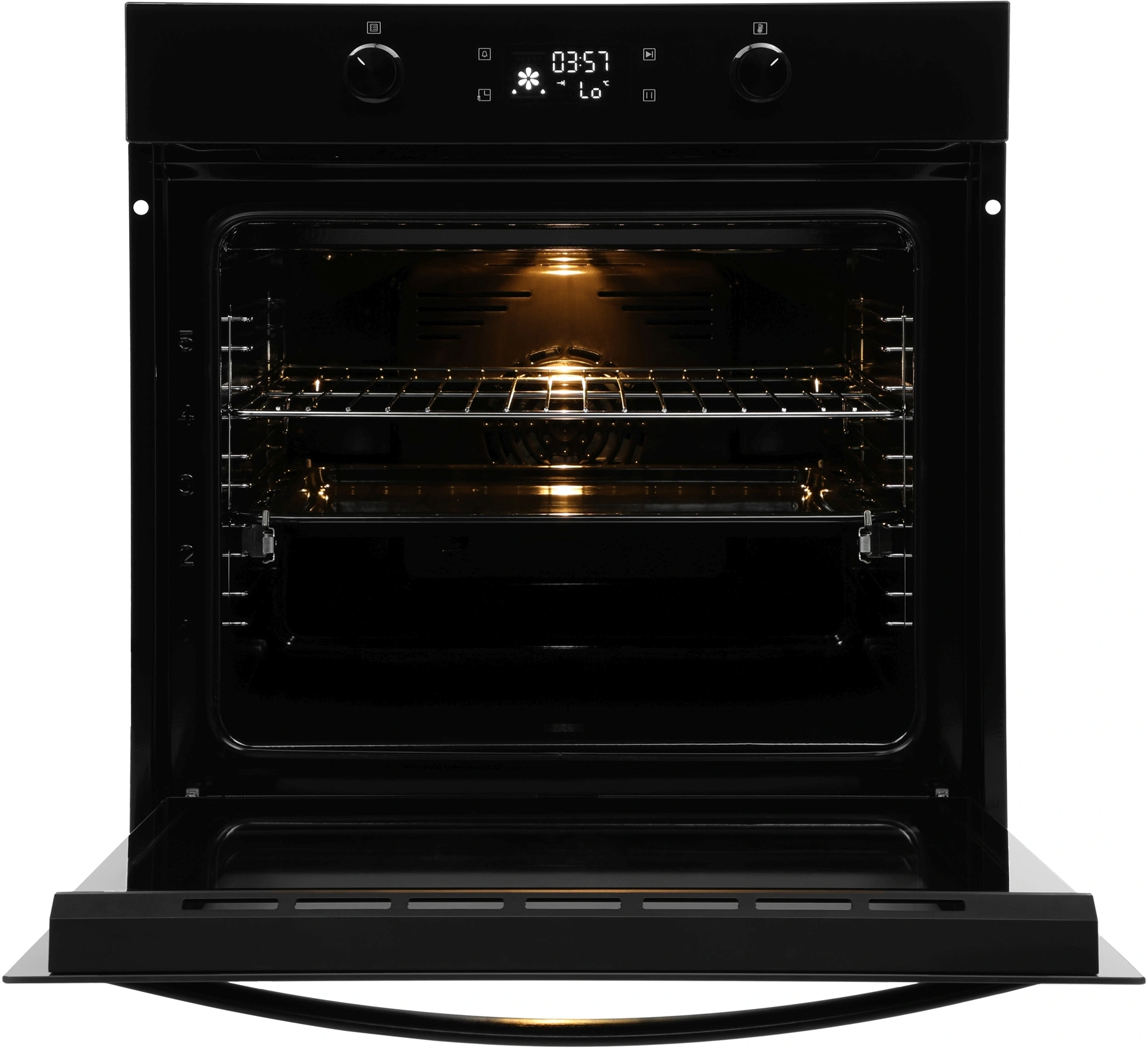 Электронное управление. Оцените комфортный доступ к нужным функциям. У духовки два поворотных регулятора. Ручкой слева выбирайте режим приготовления. Правым переключателем настраивайте температуру нагрева в диапазоне от 30 до 250 °С. Управляйте духовкой с помощью кнопок «СТАРТ» и «СТОП». Предусмотрены кнопки для запуска таймера и установки времени суток. На информативном дисплее отображаются индикаторы температуры и другие показатели.