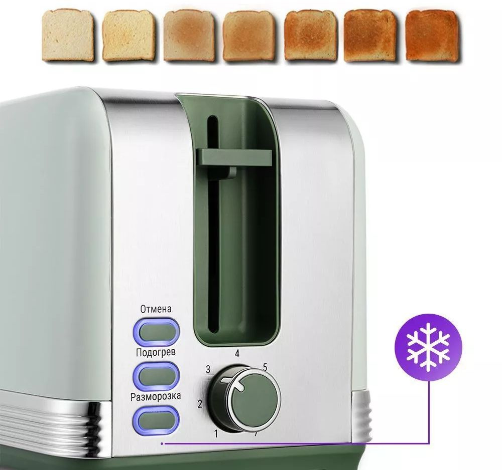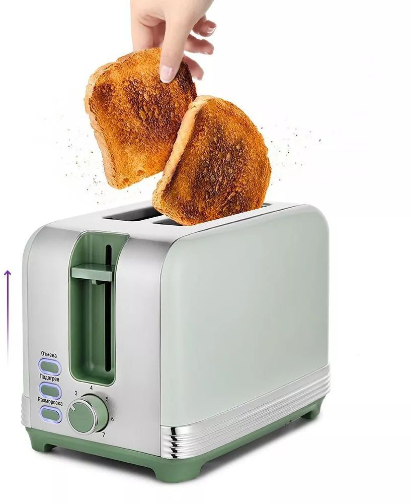 Стильный тостер КТ-6070, выполненный в приятных зелёных тонах - это незаменимая вещь для любителей ароматного и хрустящего поджаренного хлеба для приготовления горячих бутербродов, сэндвичей, бейглов, хлебцев для закусок, салатов и других блюд.
