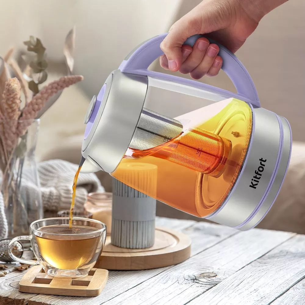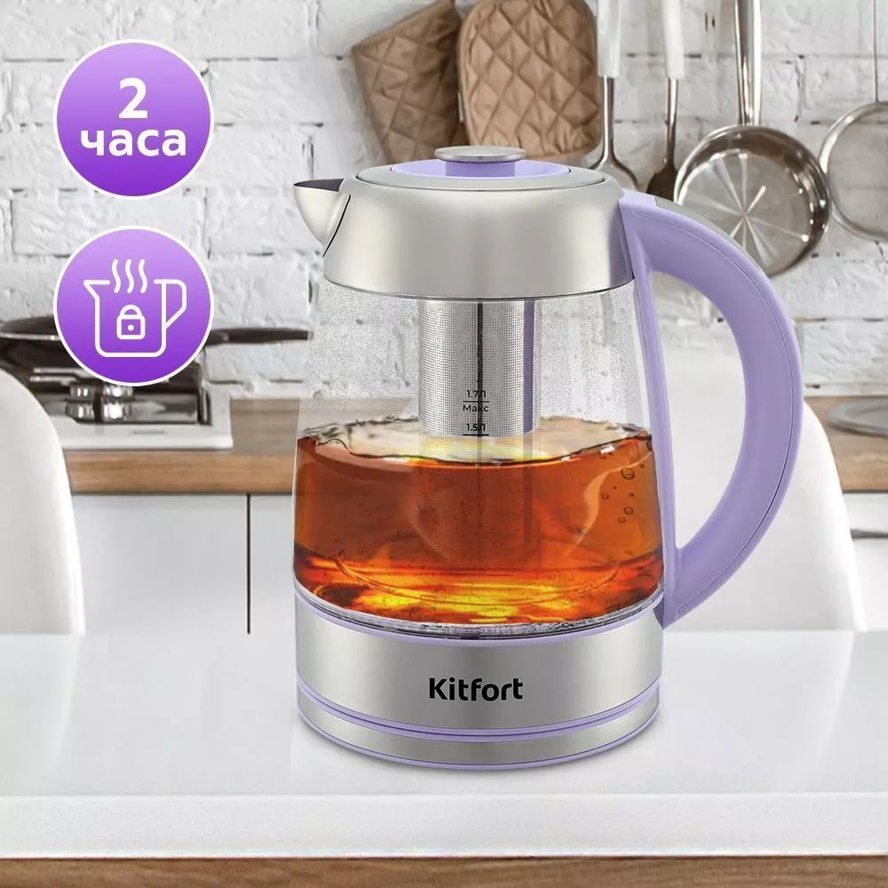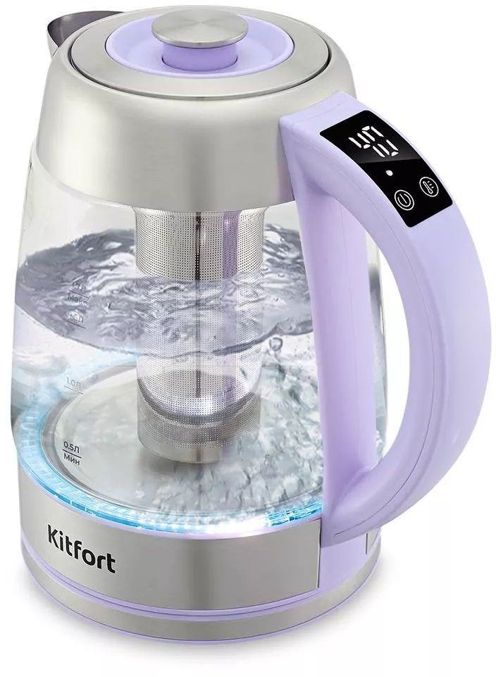 Электрический чайник с электронным терморегулятором Kitfort КТ-6624 может не только вскипятить воду, но и нагреть её до заданной температуры. Полный чайник закипает примерно за 5 минут. Ёмкость чайника 1,7 л.