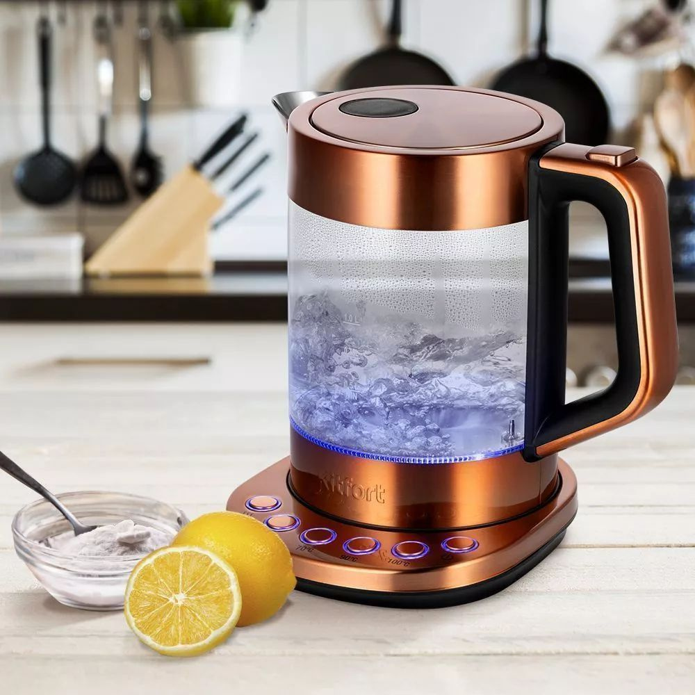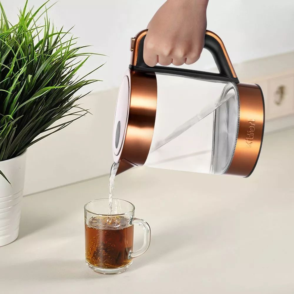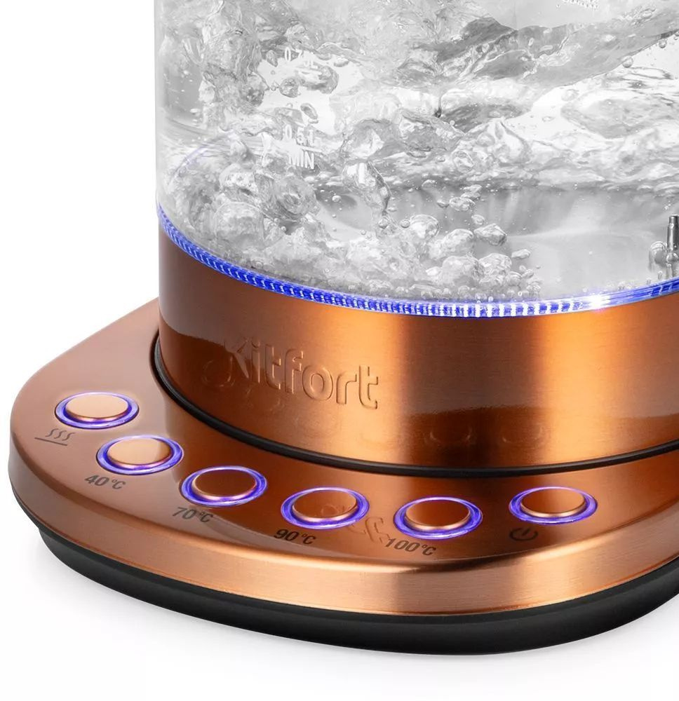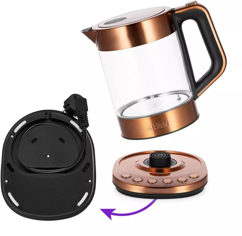 Электрический чайник с терморегулятором КТ-6657 может вскипятить воду, а также нагреть её до температуры 40, 70 и 90°С, что очень удобно для заваривания различных сортов чая. Чайник также оснащён функцией поддержания температуры.