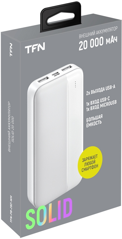 Внешний аккумулятор повышенной ёмкости Solid - отличное соотношение размера и ёмкости. Аккумулятор оснащен двумя выходами USB-А и двумя входами для зарядки с помощью кабеля microUSB или Type-C.