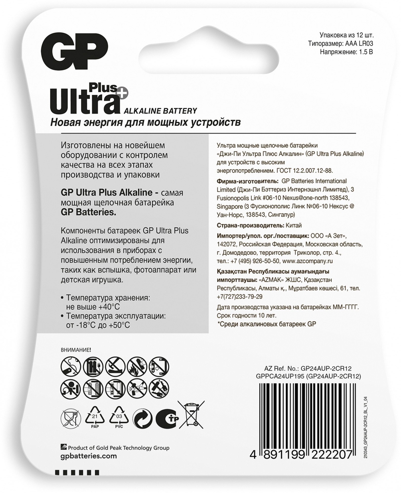 Серия GP Ultra Plus Alkaline разработана специально для приборов, требующих высокую мощность и длительное автономное время работы. Благодаря повышенной емкости, это отличный источник энергии для фототехники, детских игрушек на радиоуправлении, средств радиосвязи.