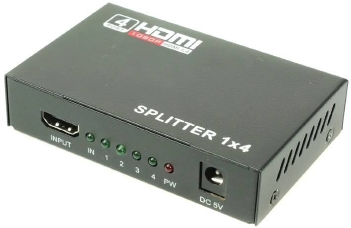 Разветвитель сигнала HDMI (1вх./4вых.).Максимальное разрешение 4K2K(30Гц). Поддержка 3D и HDCP. Скорость передачи данных до 10,2Гбит/с. Вх. - HDMI(A)/Роз.2,1х5мм(DC5V). Вых. - HDMI(A)x4. В комплекте БП DC5V(1А). Вес: 0,13кг.