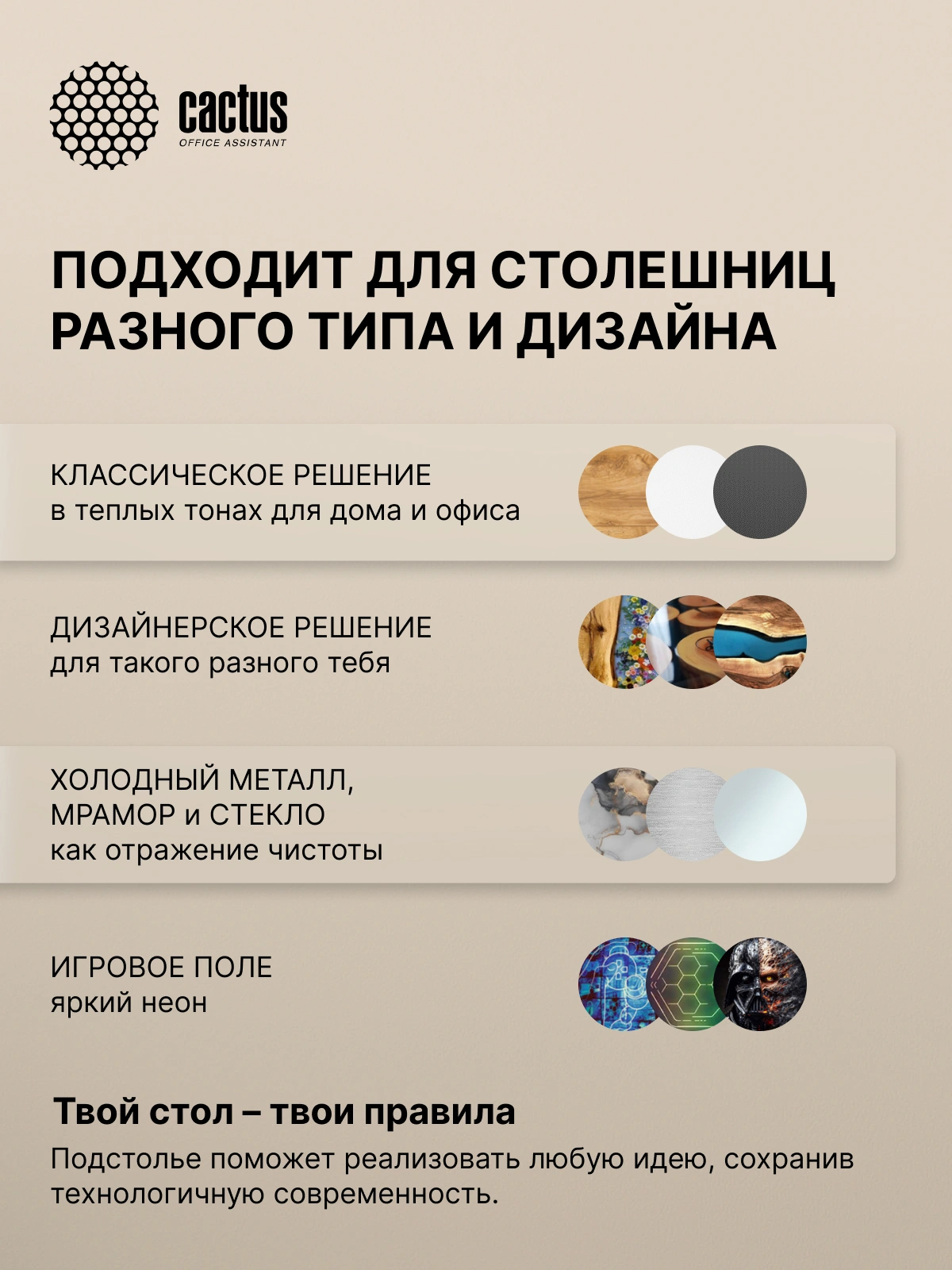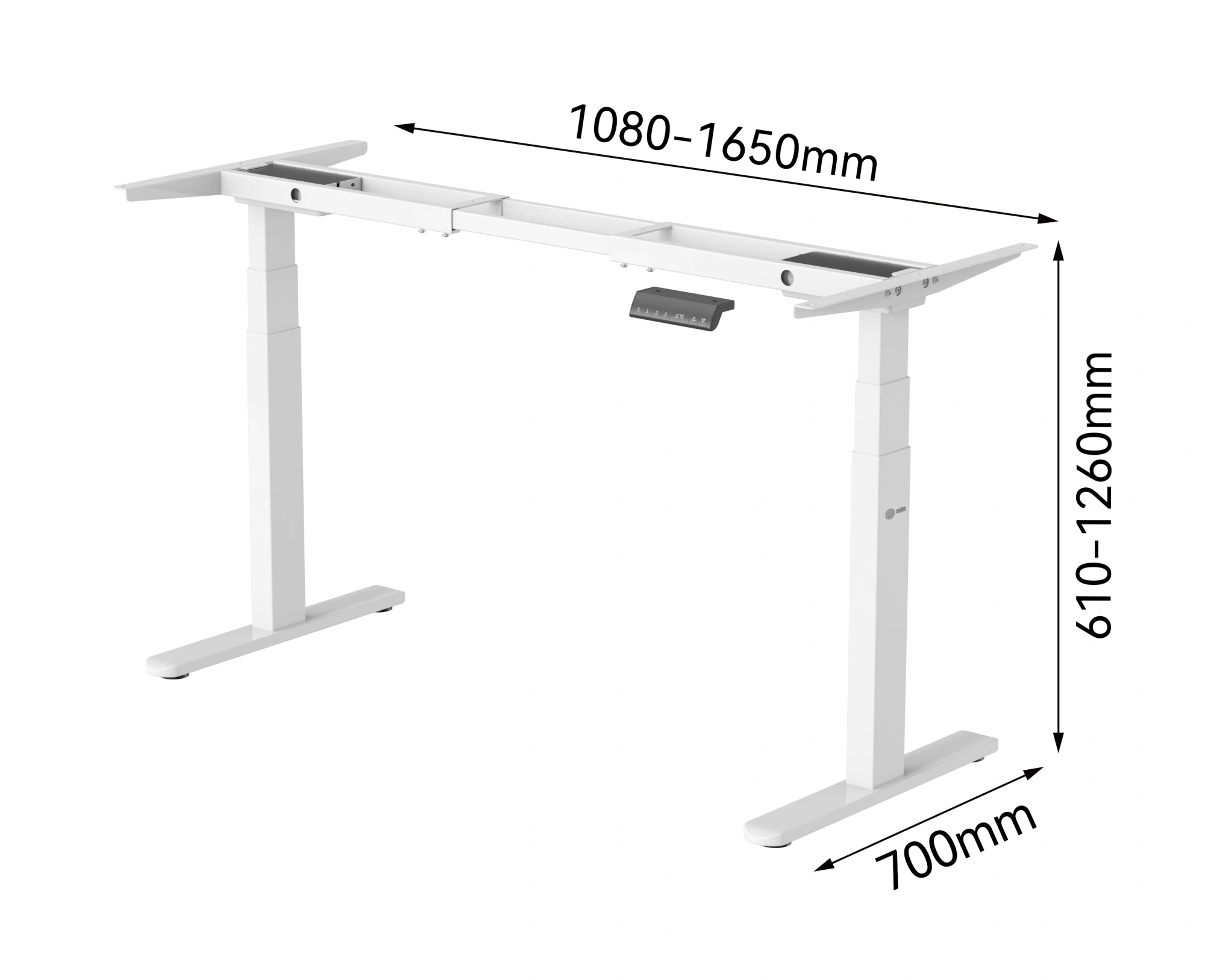 Особенностью этой модели CS-EDLF-BK является увеличенная регулировка по ширине: от 1080 до 1650мм. Квадратное сечение опор подстолья увеличивает устойчивость конструкции при работе стоя в самом верхнем положении. Диапазон регулировки высоты от 610 до 1260мм, что является абсолютным рекордом среди всех аналогичных товаров Cactus. Подстолье выдерживает 100кг. Рекомендуемые размеры столешниц, которые можно комбинировать с подстольями Cactus: