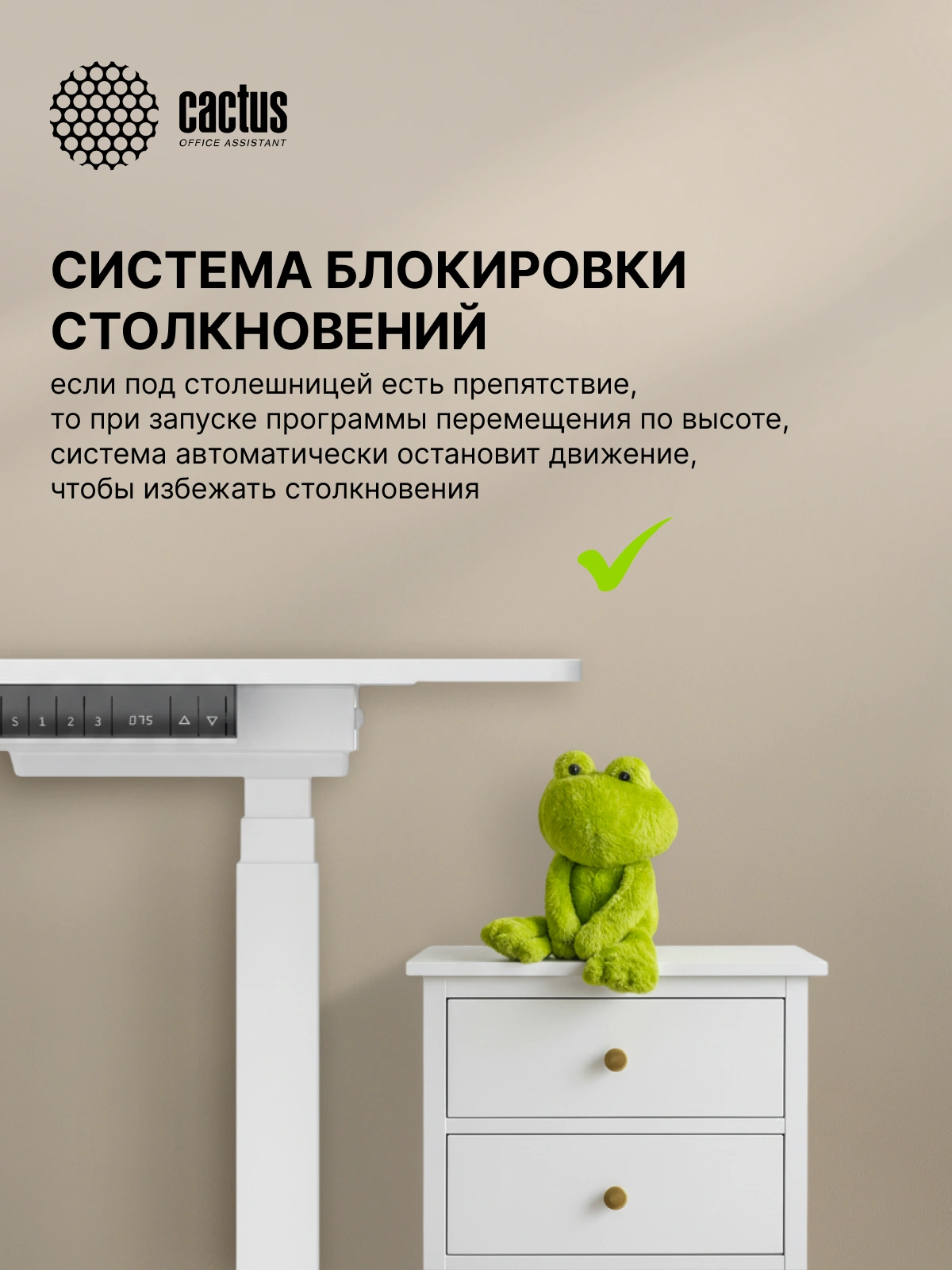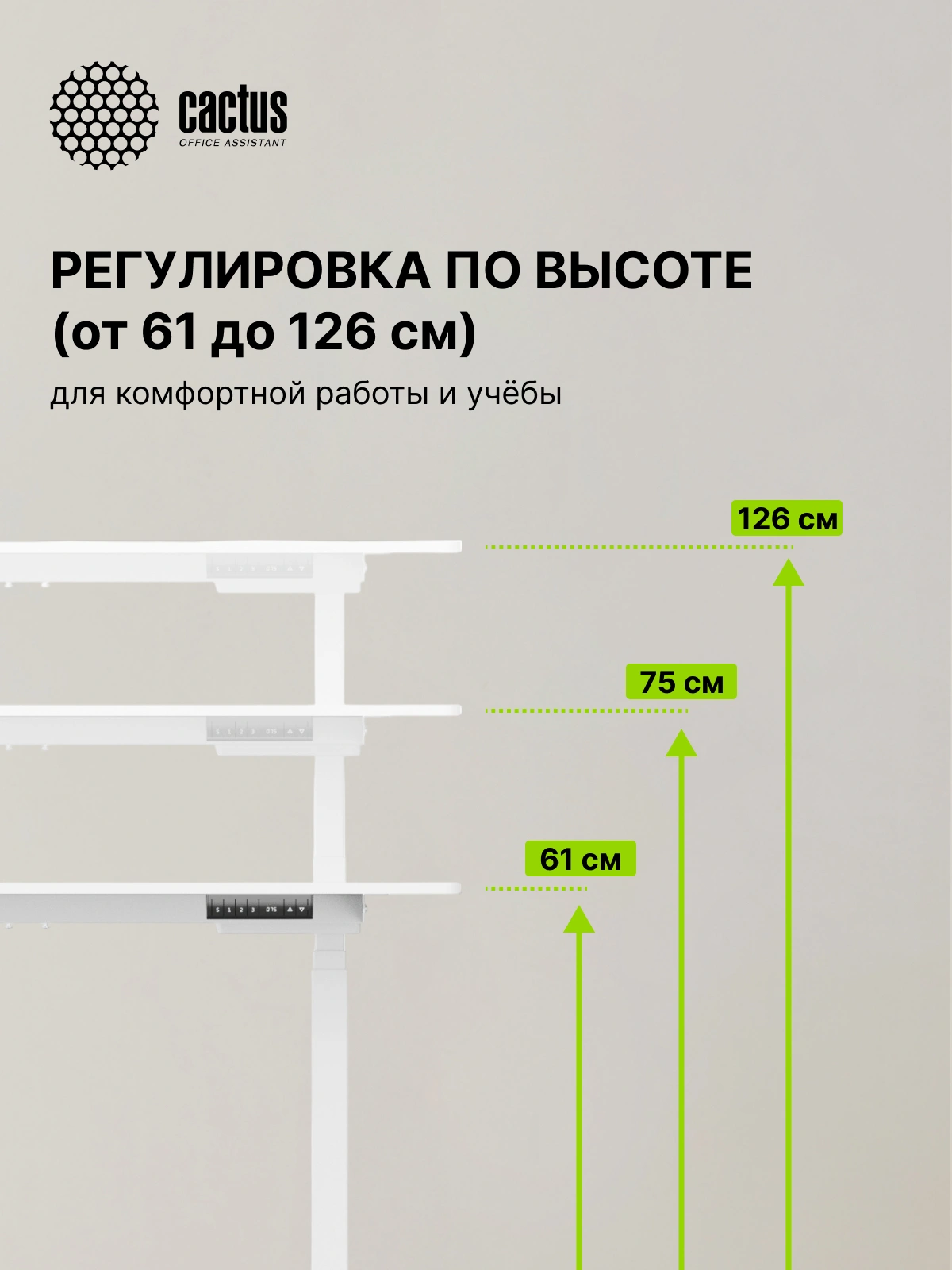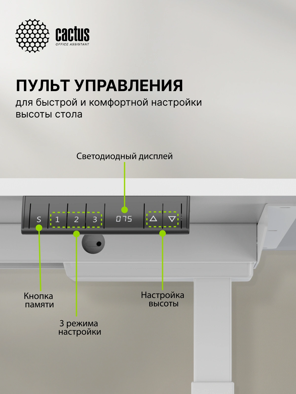 Панель управления регулировкой высоты показывает текущие значения, а также имеет три ячейки памяти, поэтому стол можно регулировать под самых разных членов семьи и сотрудников в офисе.