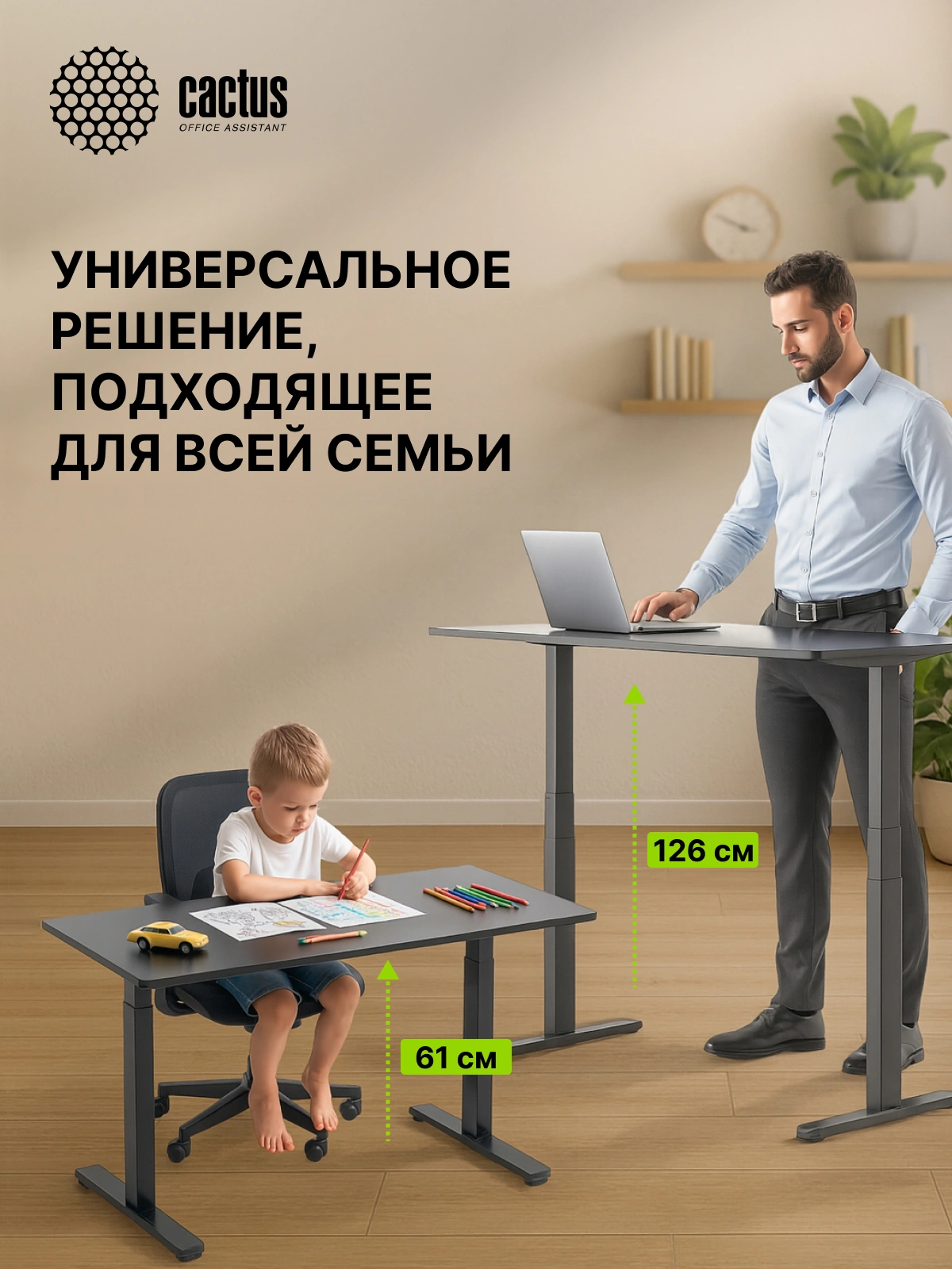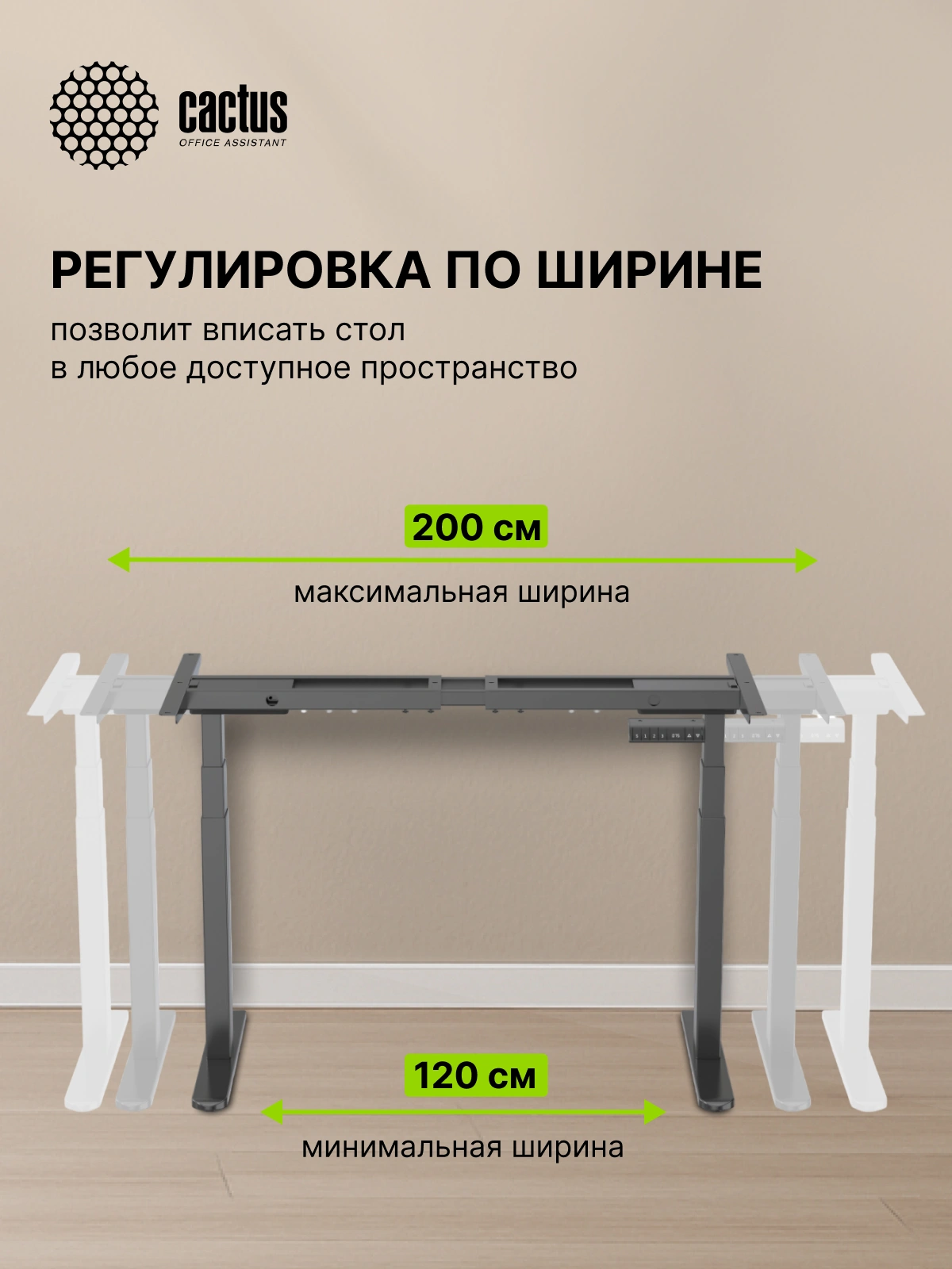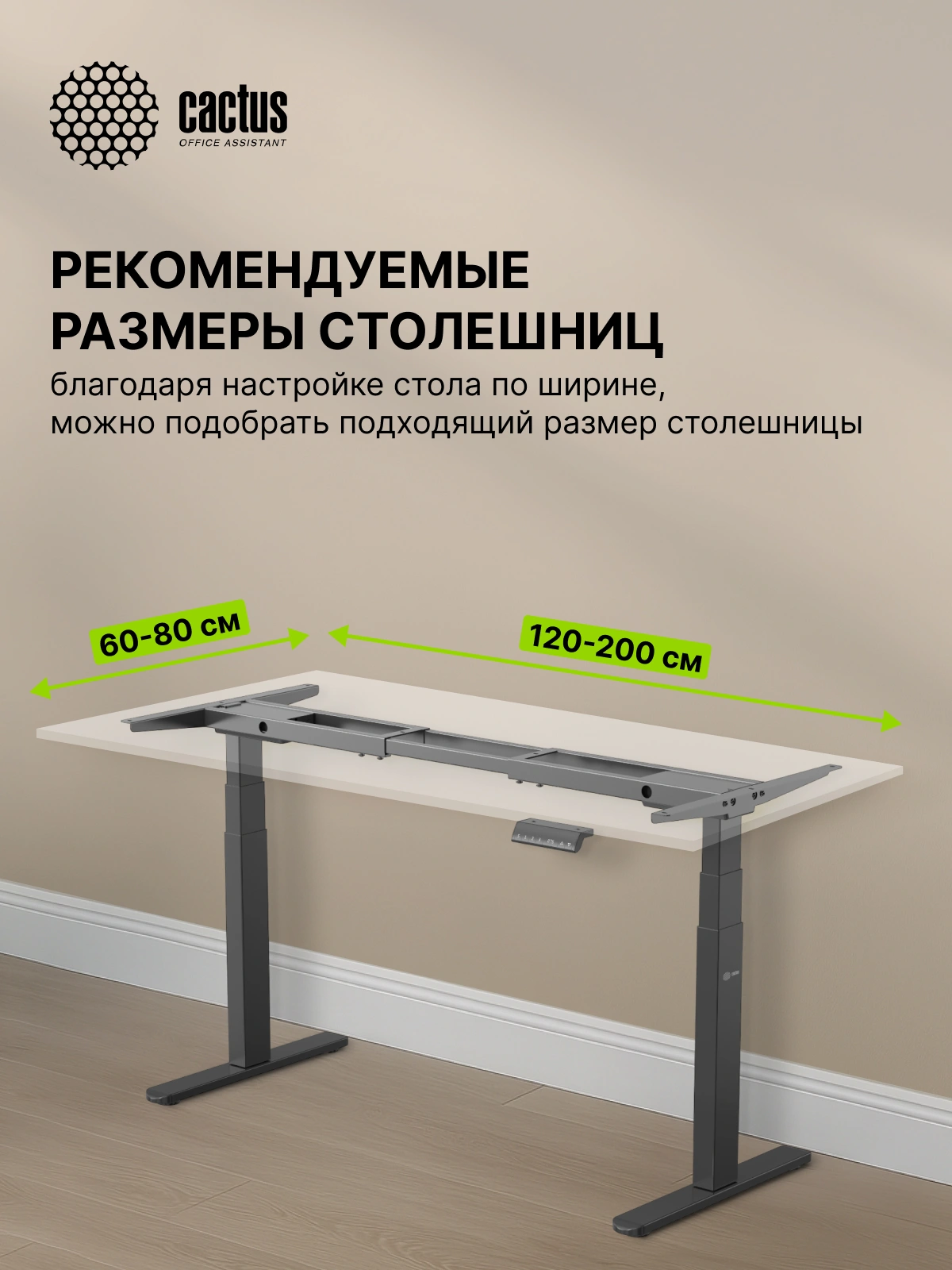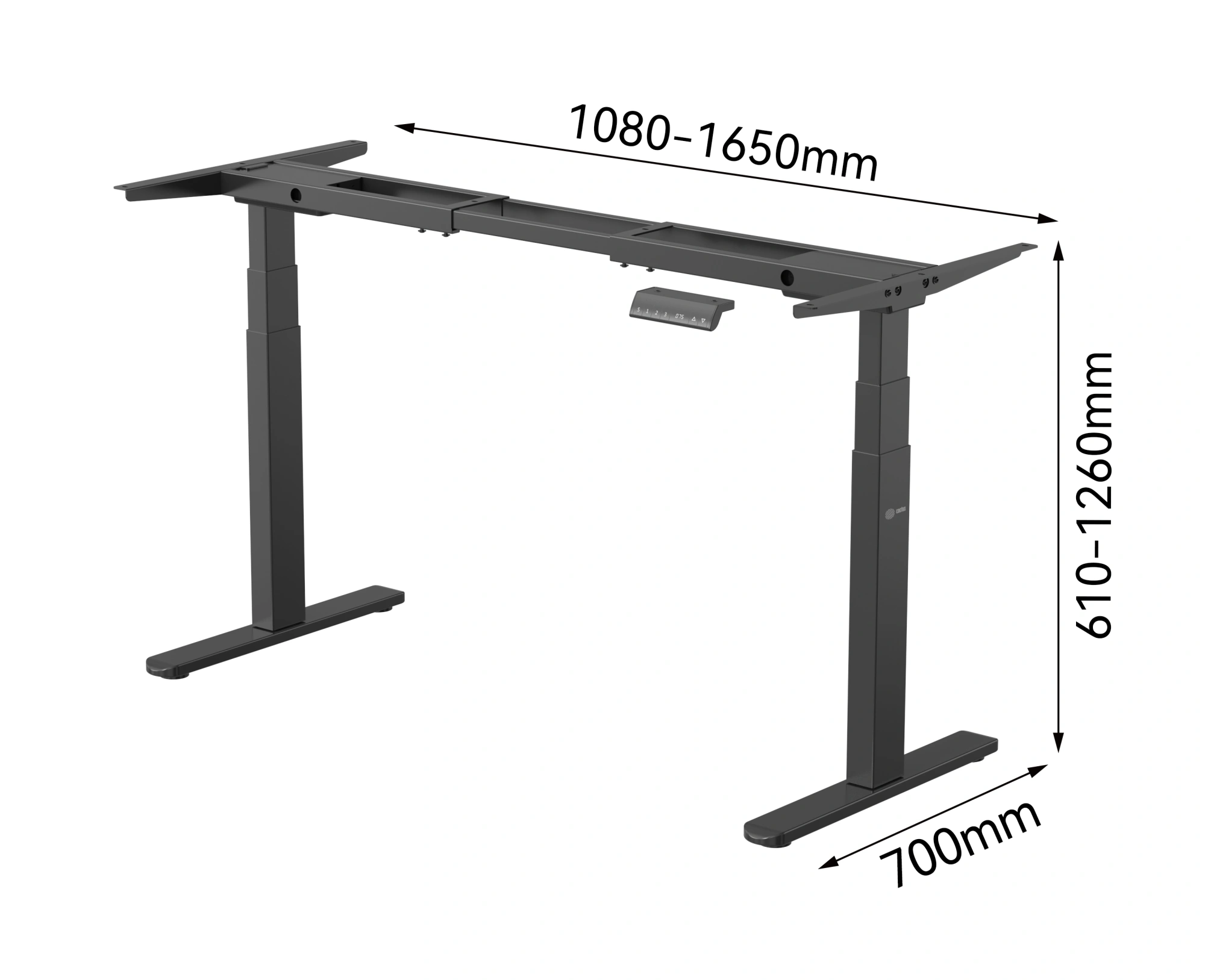Особенностью этой модели CS-EDLF-BK является увеличенная регулировка по ширине: от 1080 до 1650мм. Квадратное сечение опор подстолья увеличивает устойчивость конструкции при работе стоя в самом верхнем положении. Диапазон регулировки высоты от 610 до 1260мм, что является абсолютным рекордом среди всех аналогичных товаров Cactus. Подстолье выдерживает 100кг. Рекомендуемые размеры столешниц, которые можно комбинировать с подстольями Cactus: