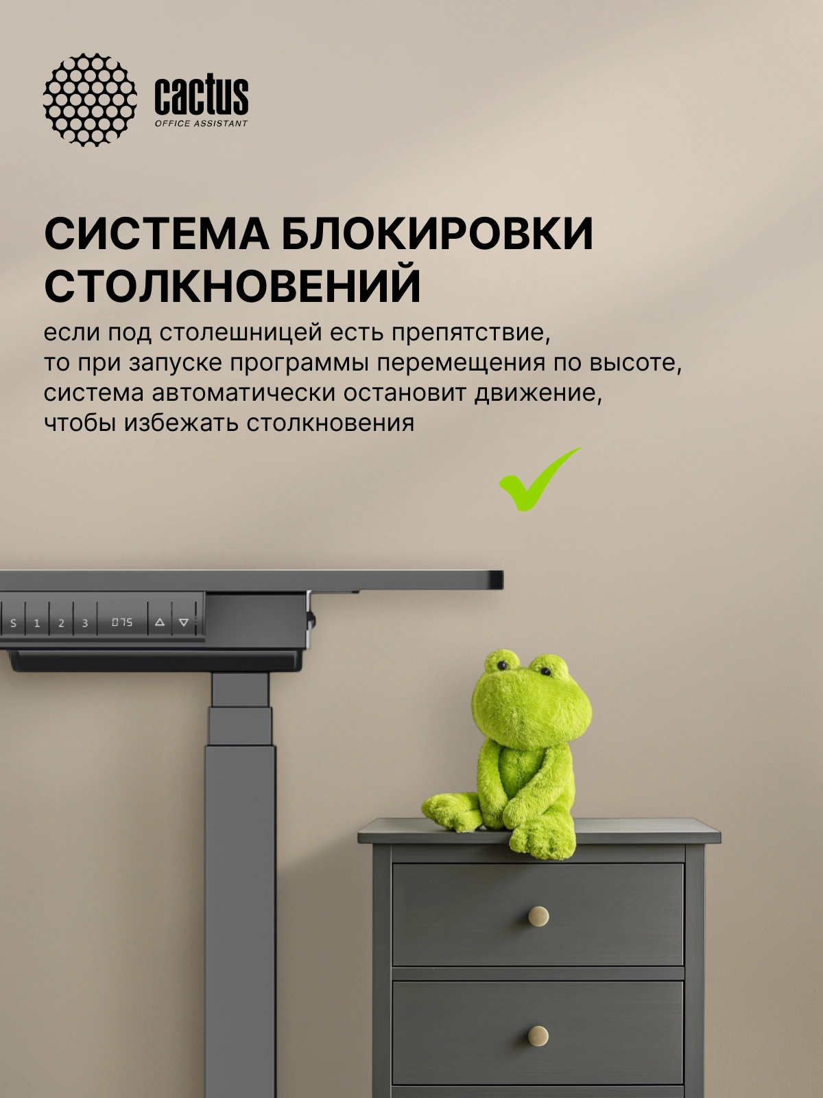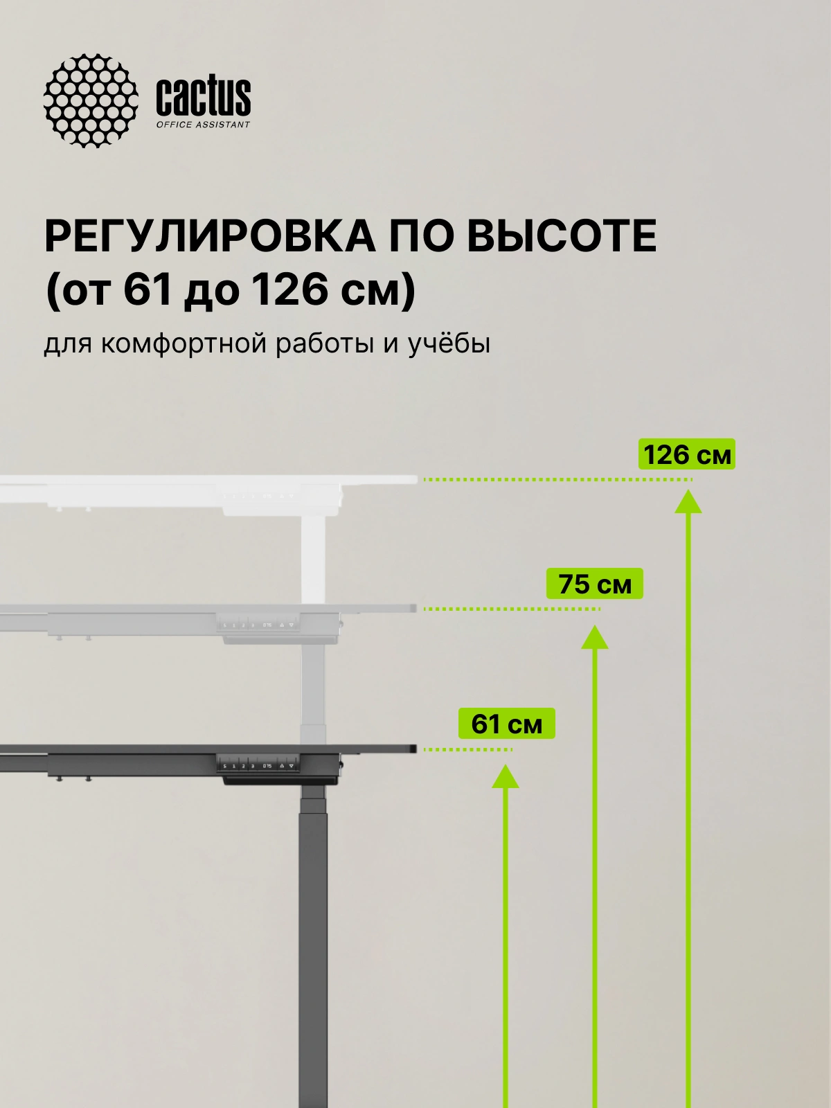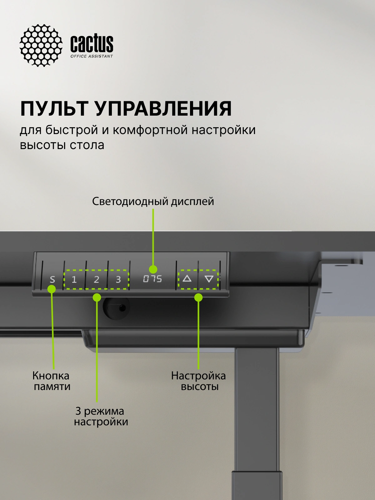 Панель управления регулировкой высоты показывает текущие значения, а также имеет три ячейки памяти, поэтому стол можно регулировать под самых разных членов семьи и сотрудников в офисе.