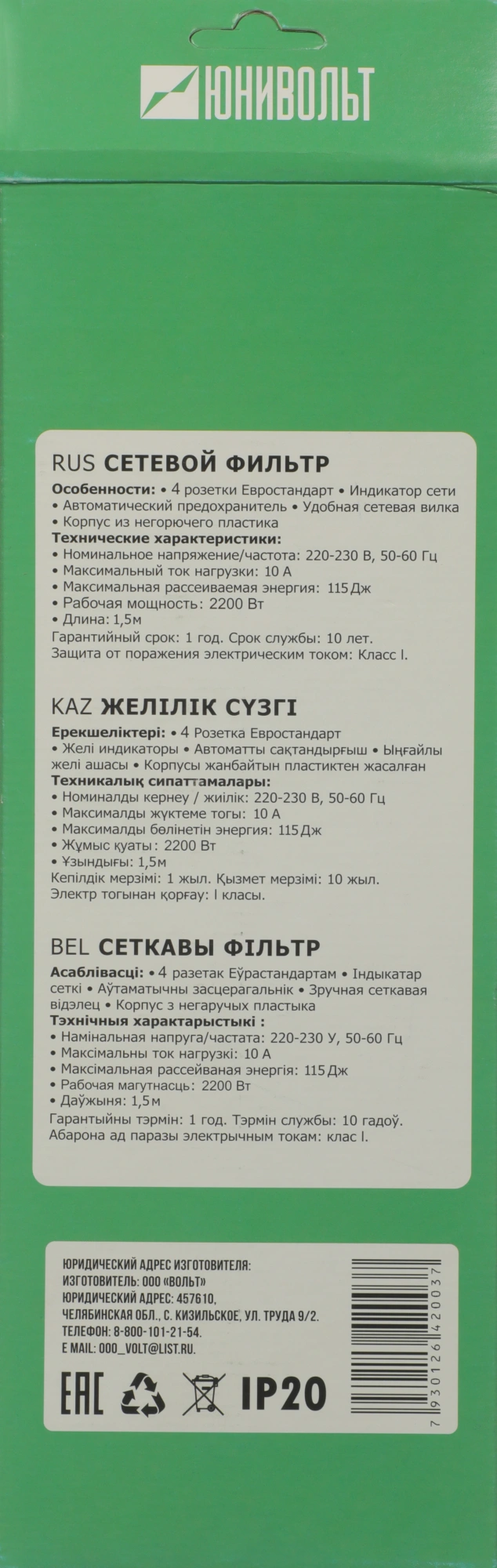 1.5м (4 розетки) белый (коробка)