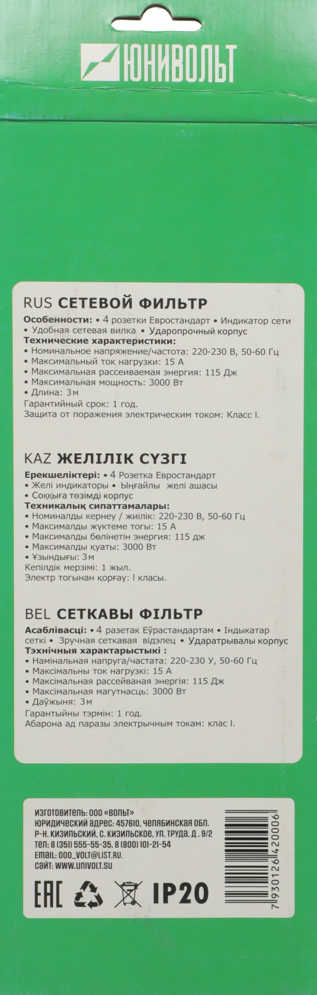 Модели на 4 и 5 гнезд, мощностью 10А и 15А, с кабелем длинной 1,5 и 3 метра.