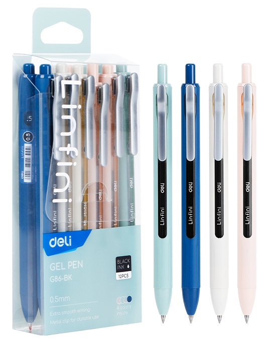 Гелевая ручка Deli EG86-BK, пулевидный наконечник, пишущий узел 0,5 мм, металлический клип, упаковка 12 штук, 4 цвета ассорти, чернила черные