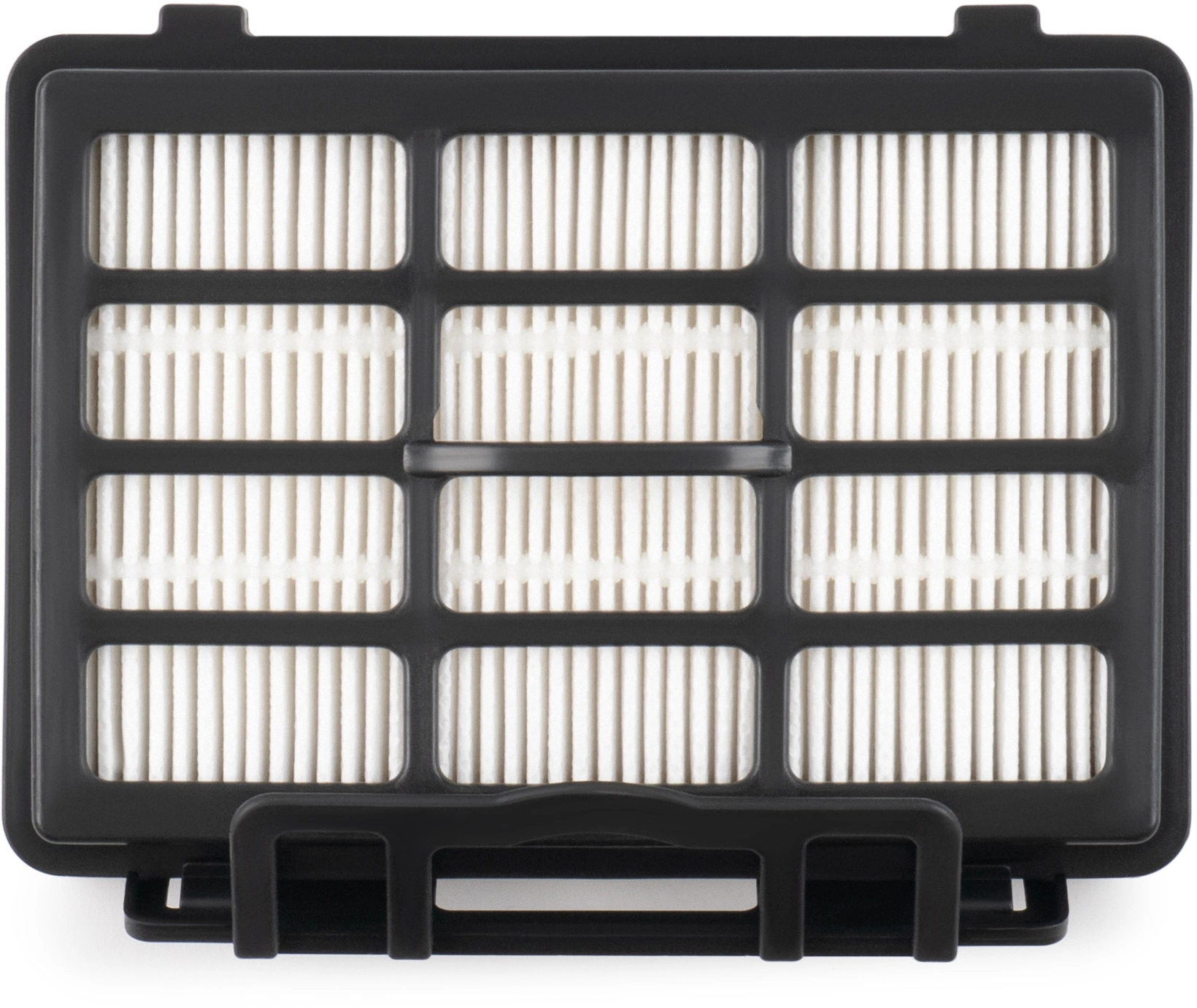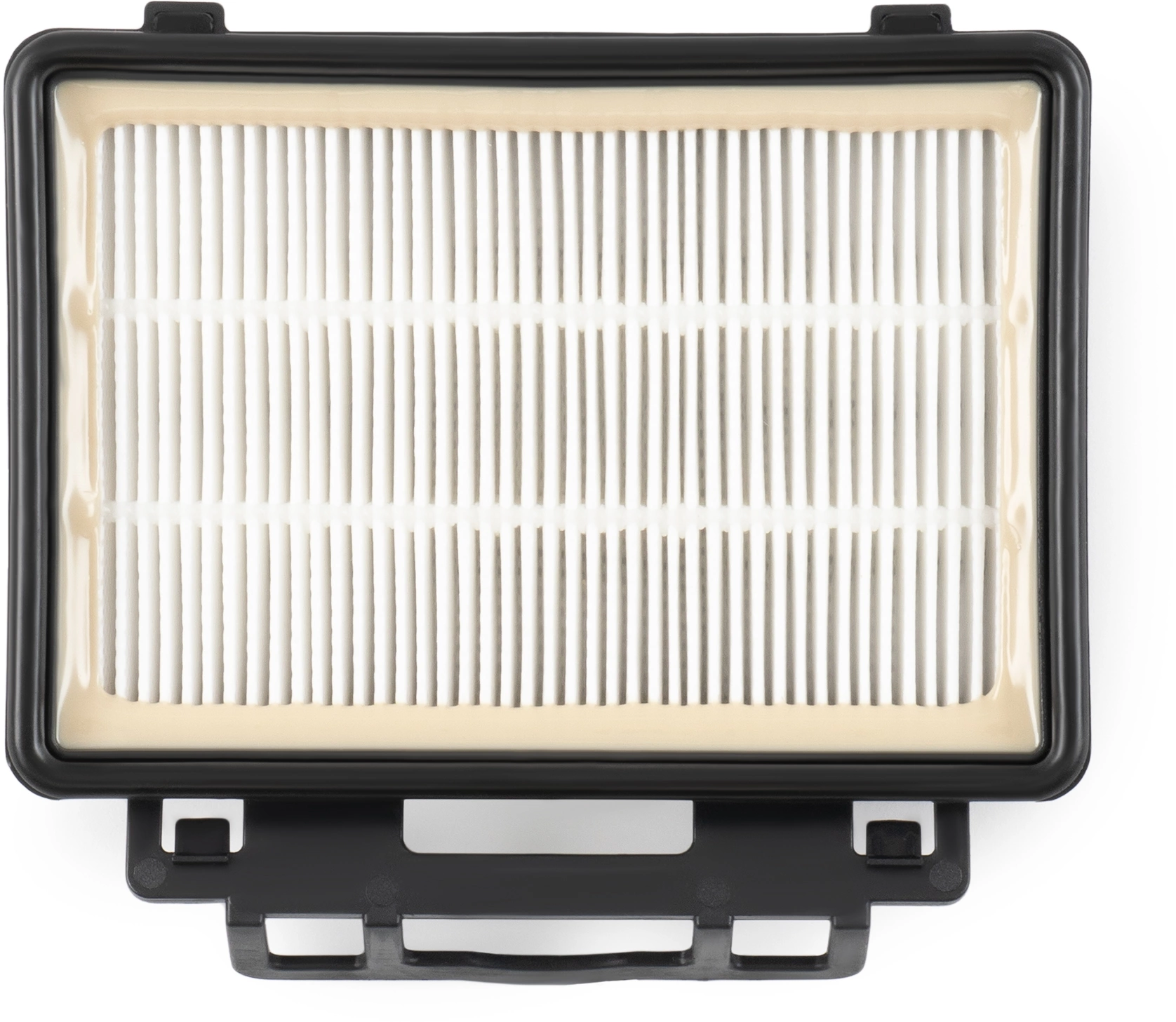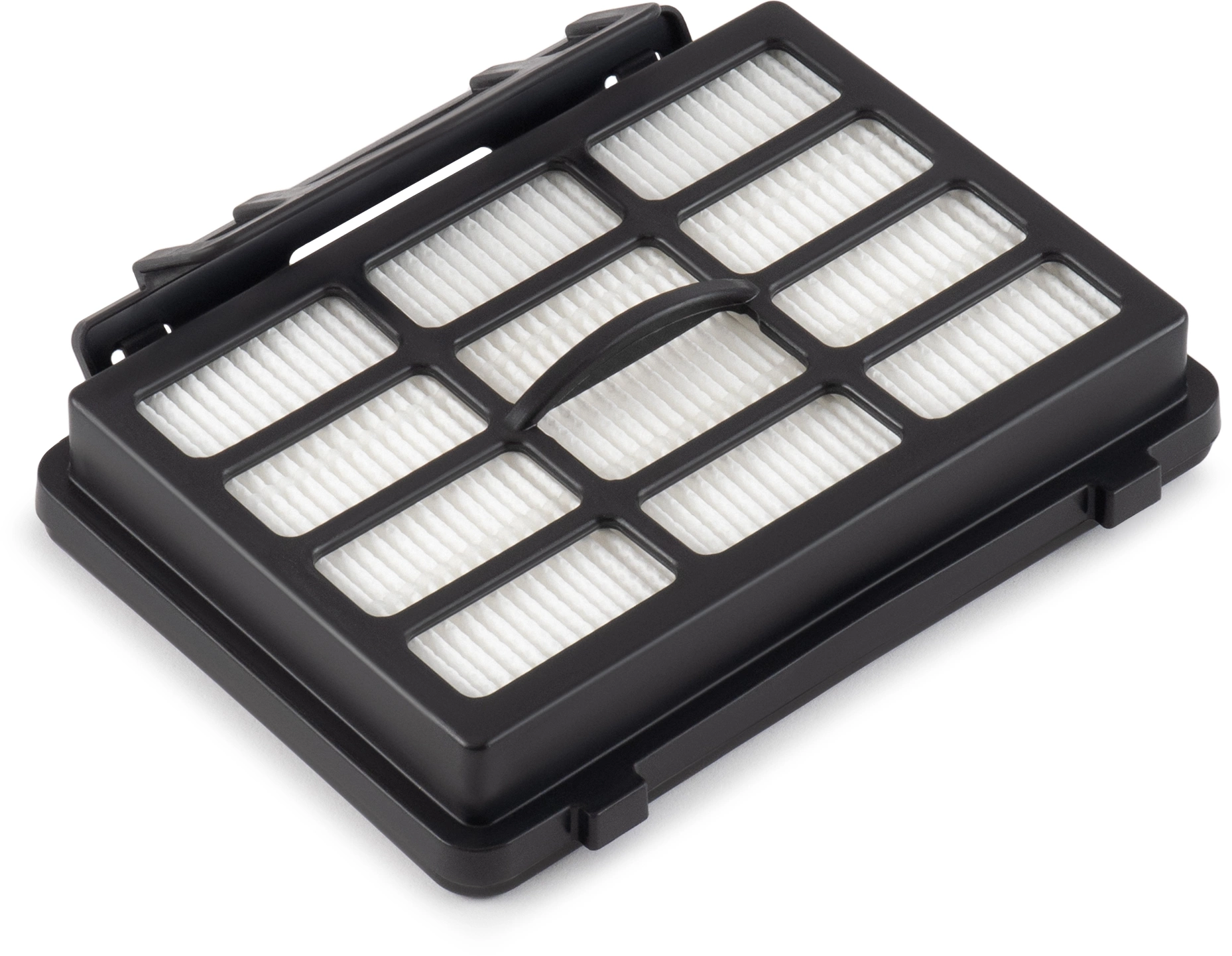 Внешний HEPA-фильтр тонкой очистки изготовлен из волокнистого материала, который упакован в пластиковый корпус. Он способен улавливать мельчайшие частицы размером от 0,3 микрона, включая пыль, аллергены и другие вредные вещества. Благодаря этому, пылесос удерживает их внутри, что способствует созданию здоровой микрофлоры в помещении.