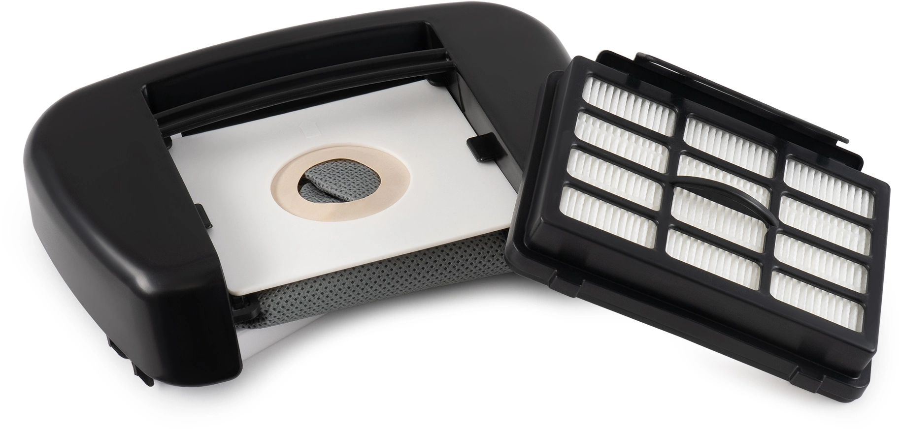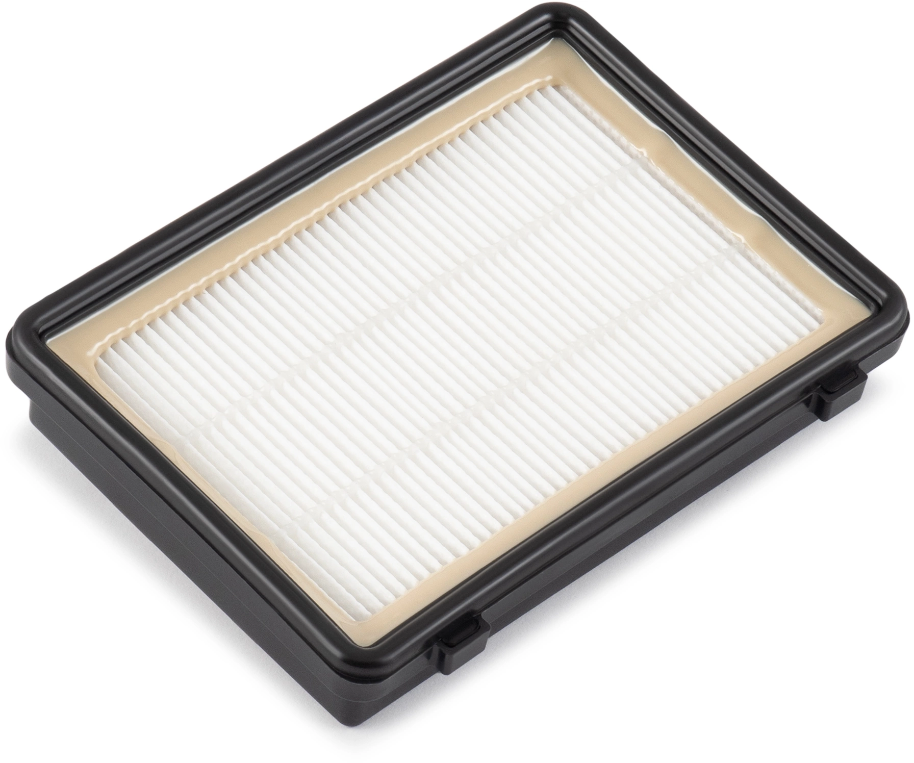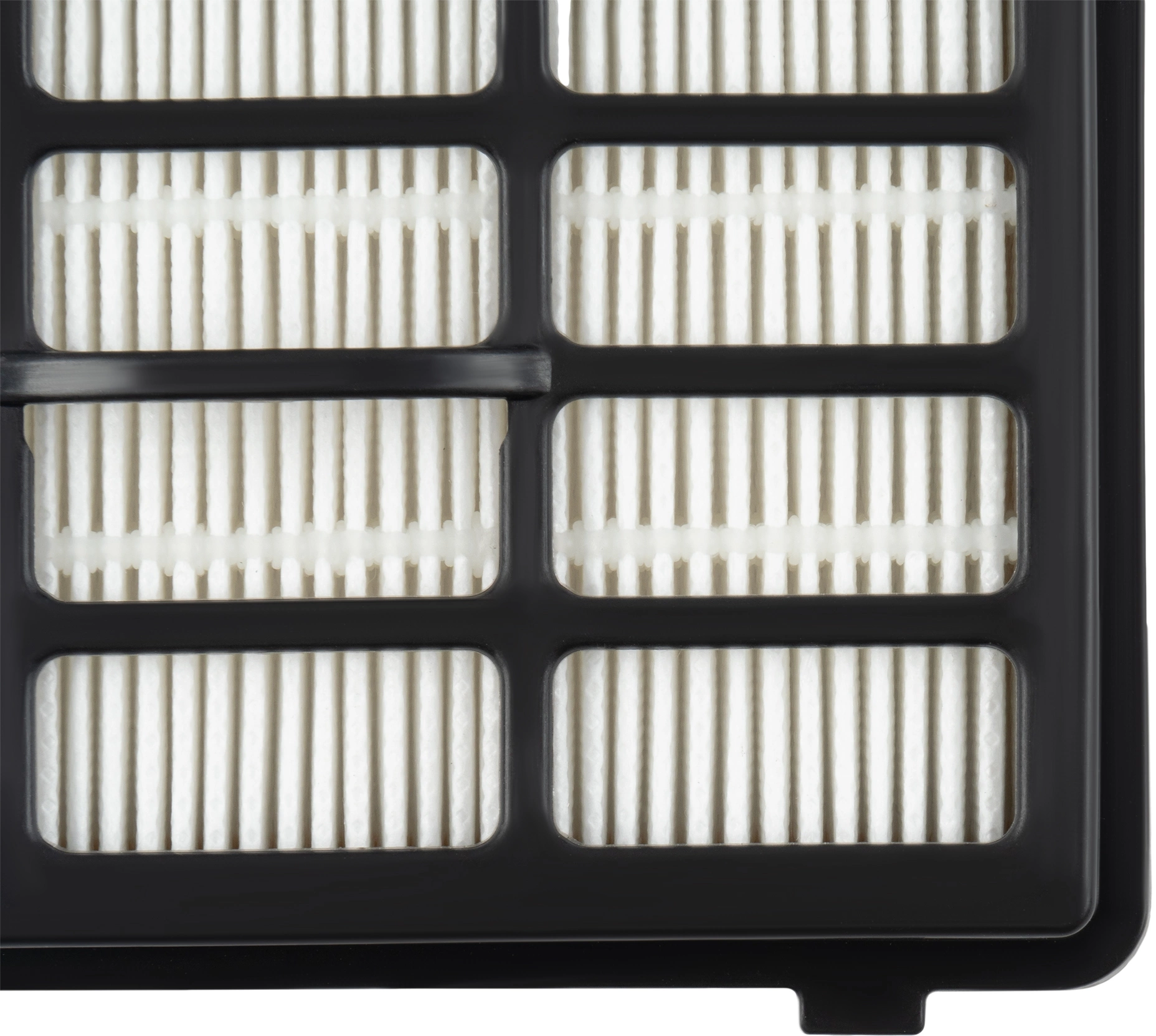 Внешний HEPA-фильтр тонкой очистки изготовлен из волокнистого материала, который упакован в пластиковый корпус. Он способен улавливать мельчайшие частицы размером от 0,3 микрона, включая пыль, аллергены и другие вредные вещества. Благодаря этому, пылесос удерживает их внутри, что способствует созданию здоровой микрофлоры в помещении.