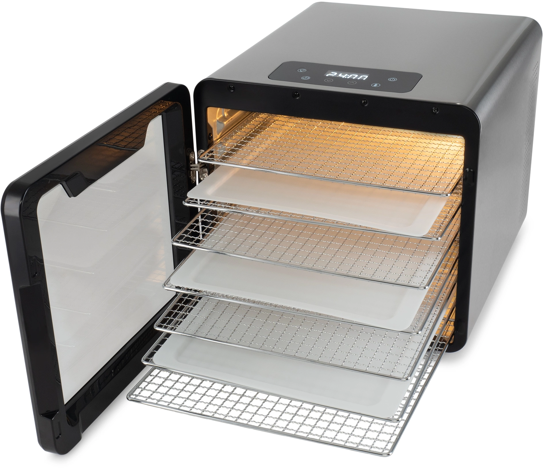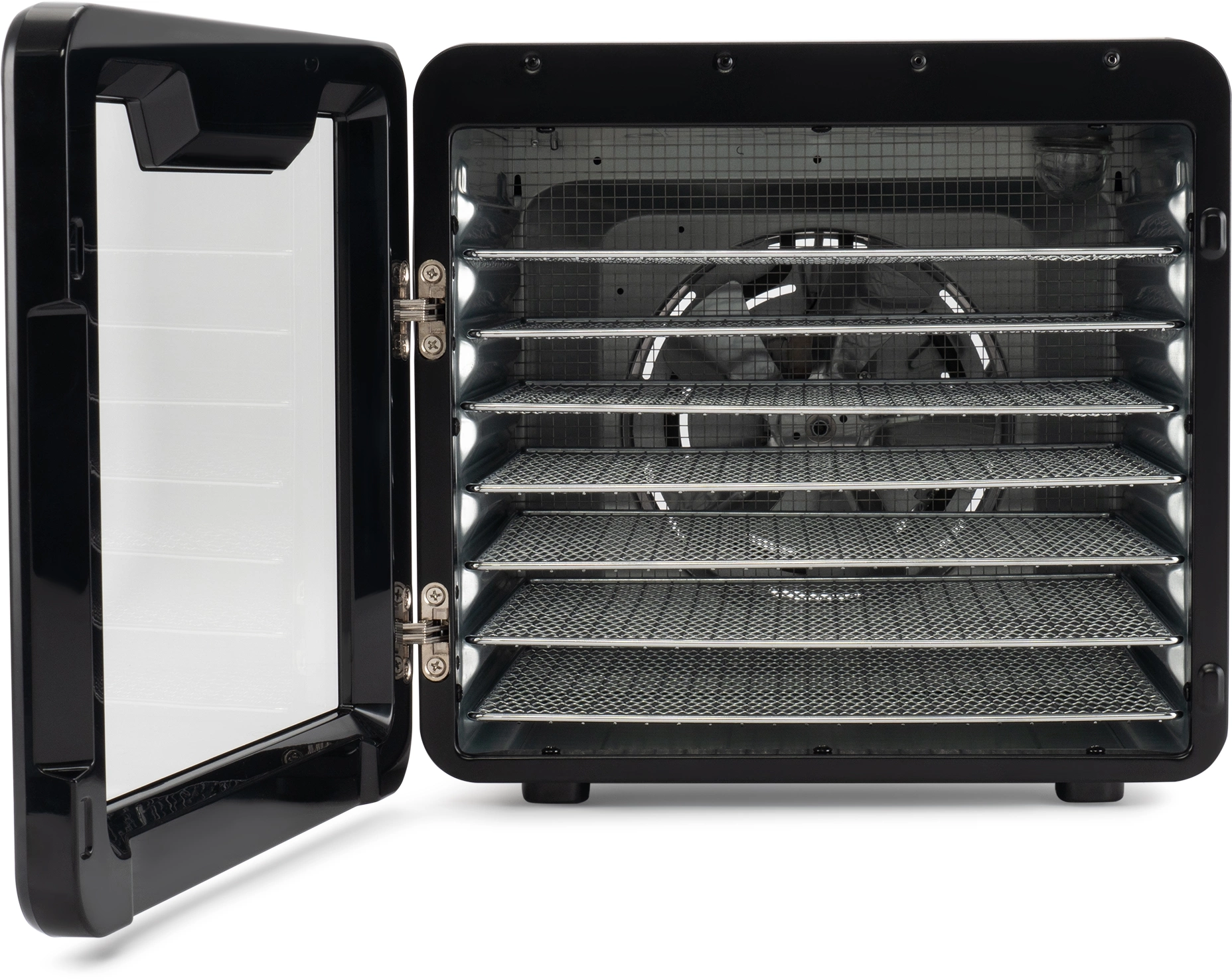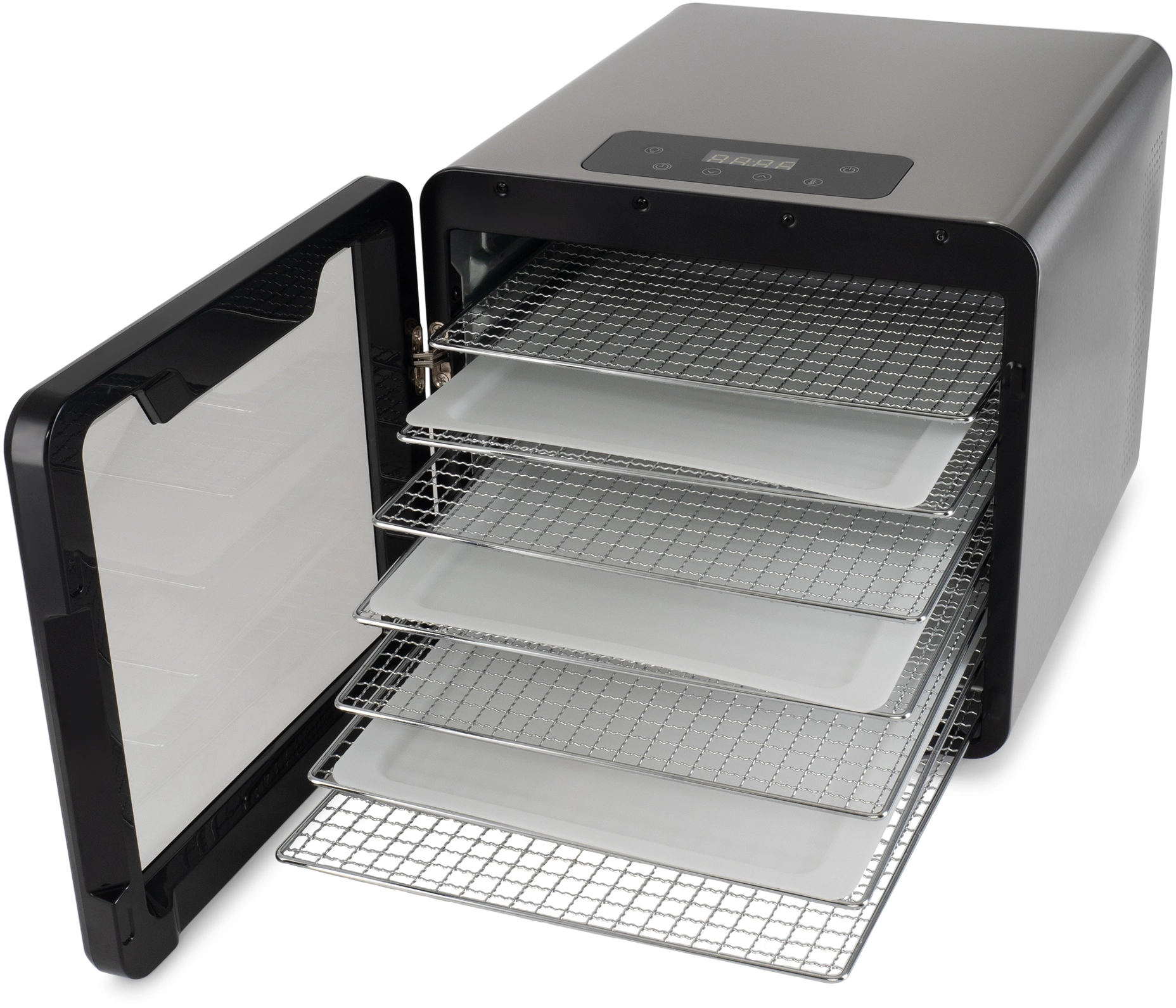 С 14 вместительными поддонами, Вы сможете одновременно обрабатывать большое количество овощей, фруктов, грибов и трав, вялить мясо или рыбу, экономя время и усилия. Диапазон регулировки температуры от 30 °С до 75 °С позволяет подобрать оптимальный режим для каждого вида продуктов, обеспечивая равномерную и эффективную сушку.