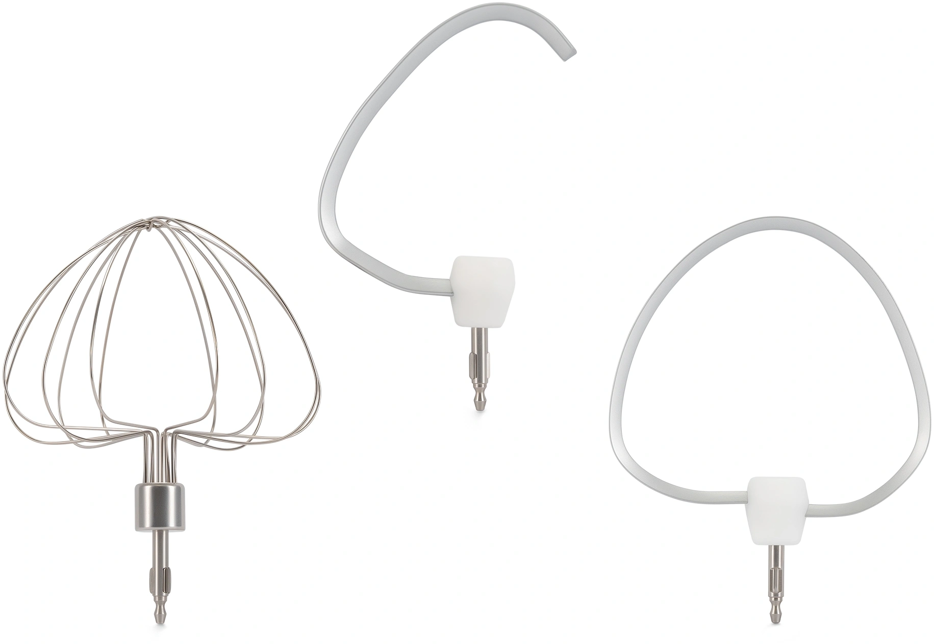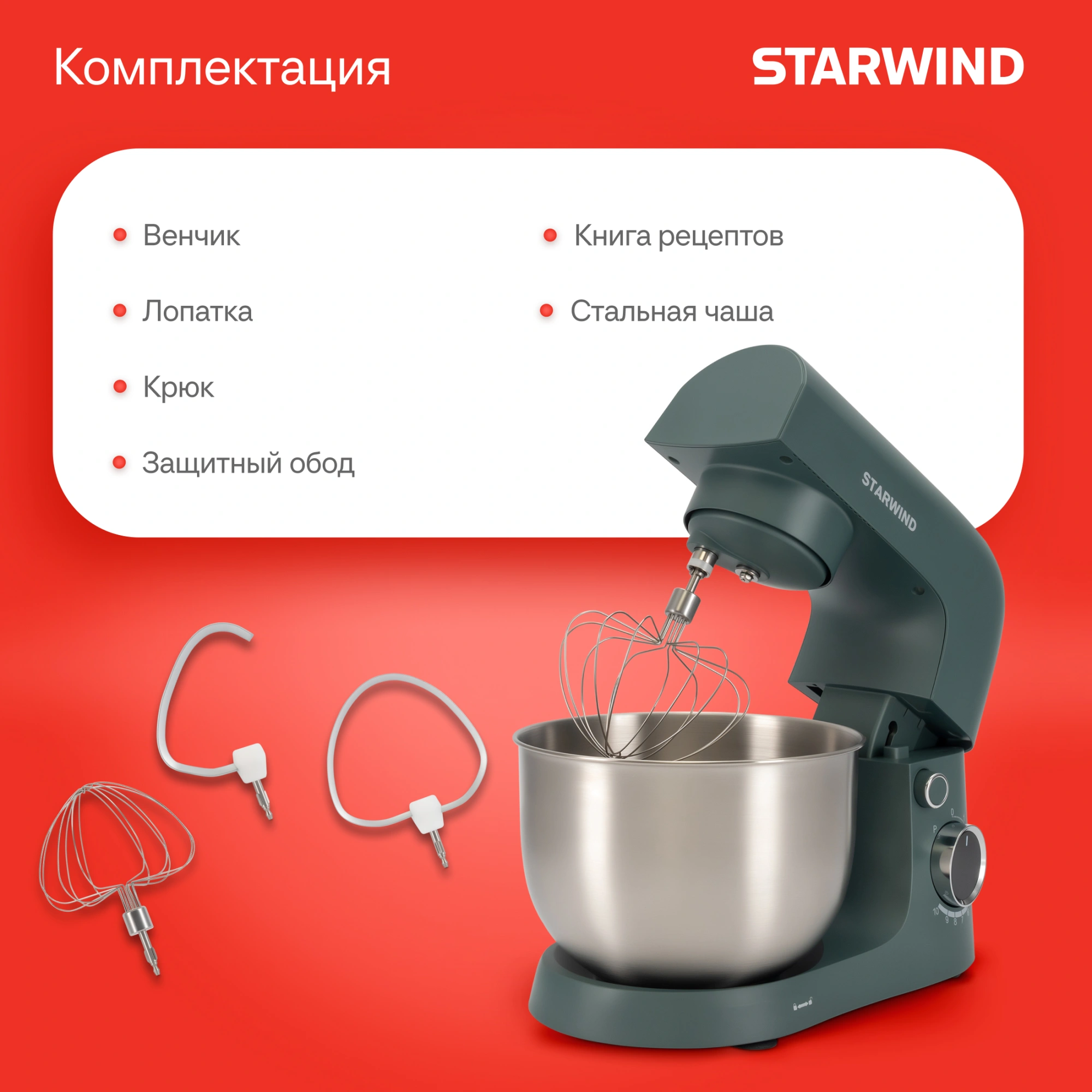 Многофункциональный защитный обод для чаши, с окном для добавления ингредиентов, обеспечивает защиту от разбрызгивания во время работы, а также обладает полезными опциями для приготовления пищи: отделяйте белки от желтков, разрезайте тесто, не опасаясь повредить поверхность стола, храните насадки на миксере. В комплекте с миксером поставляются три насадки: венчик для взбивания, крюк для замеса теста и лопатка для перемешивания.