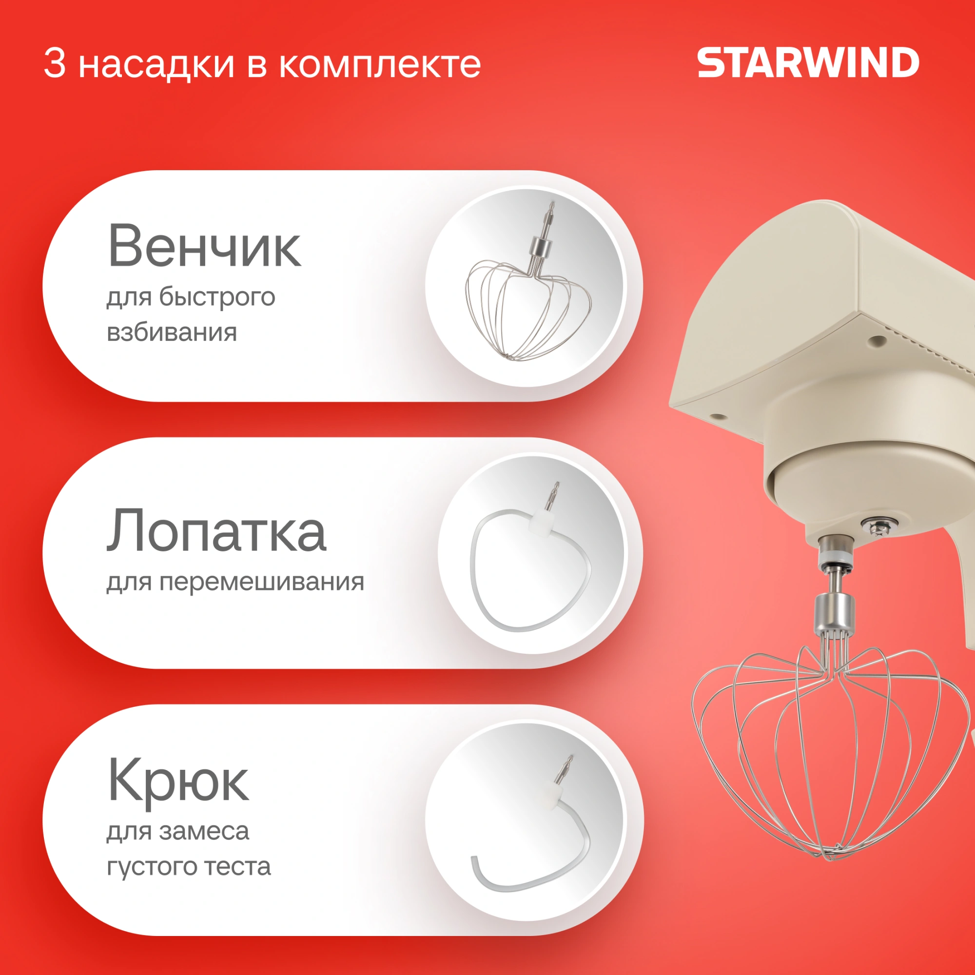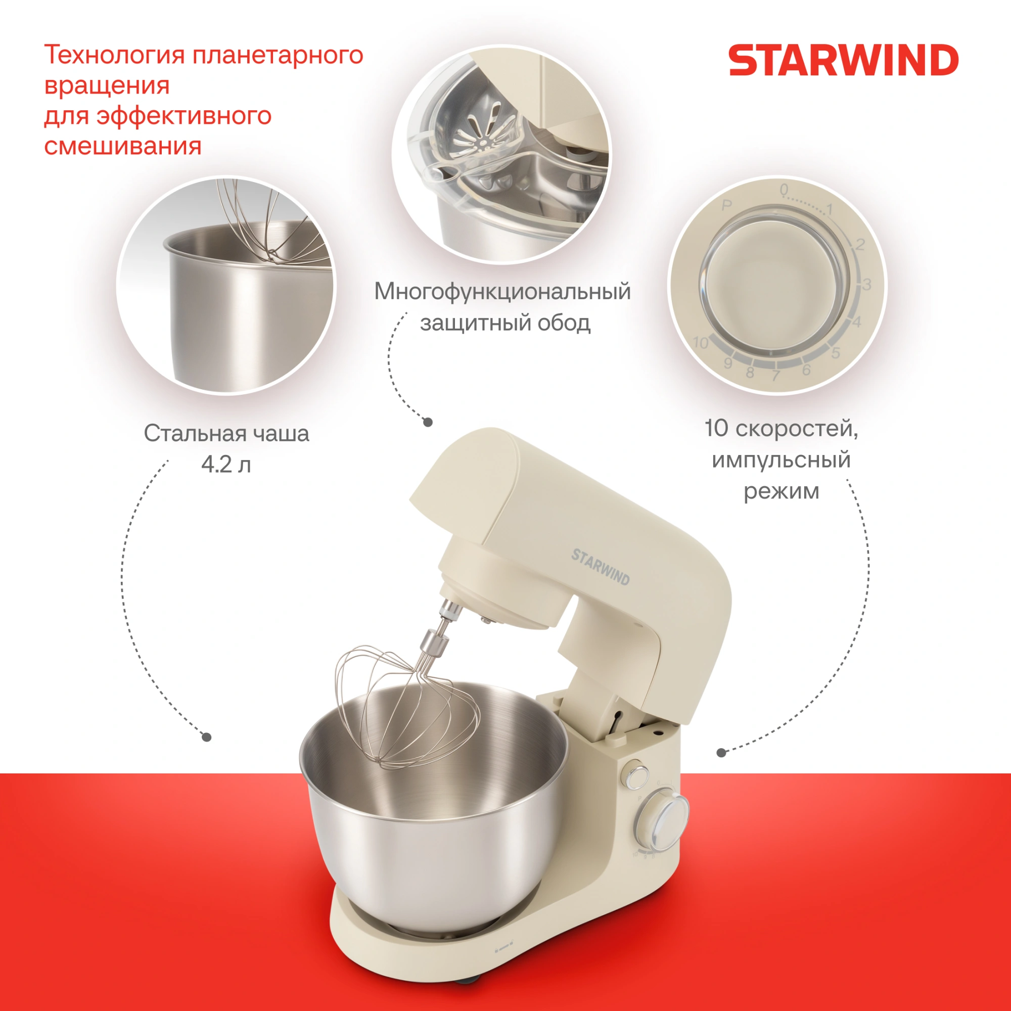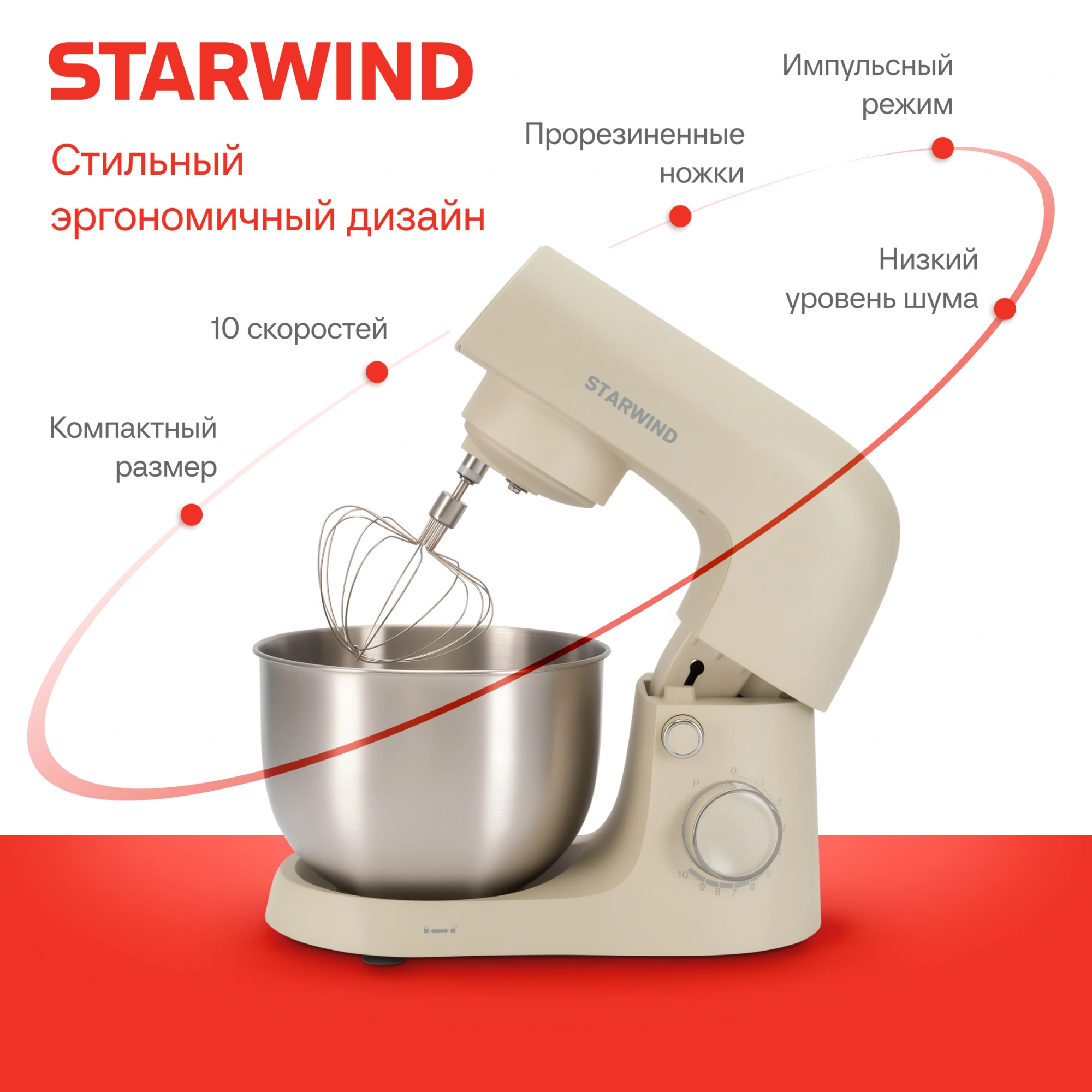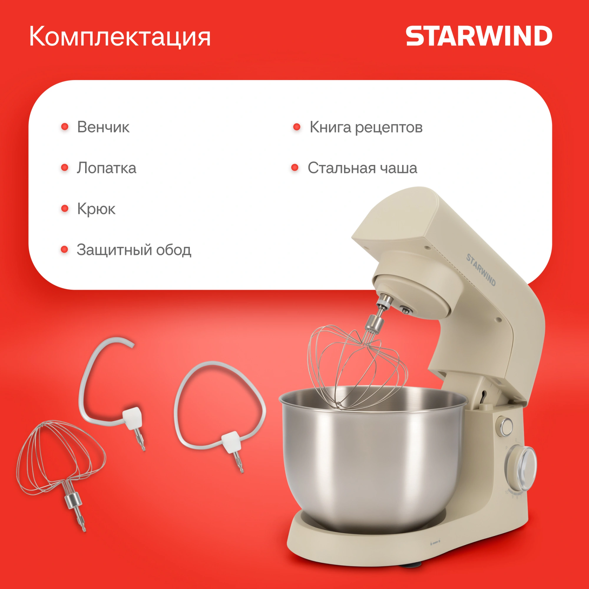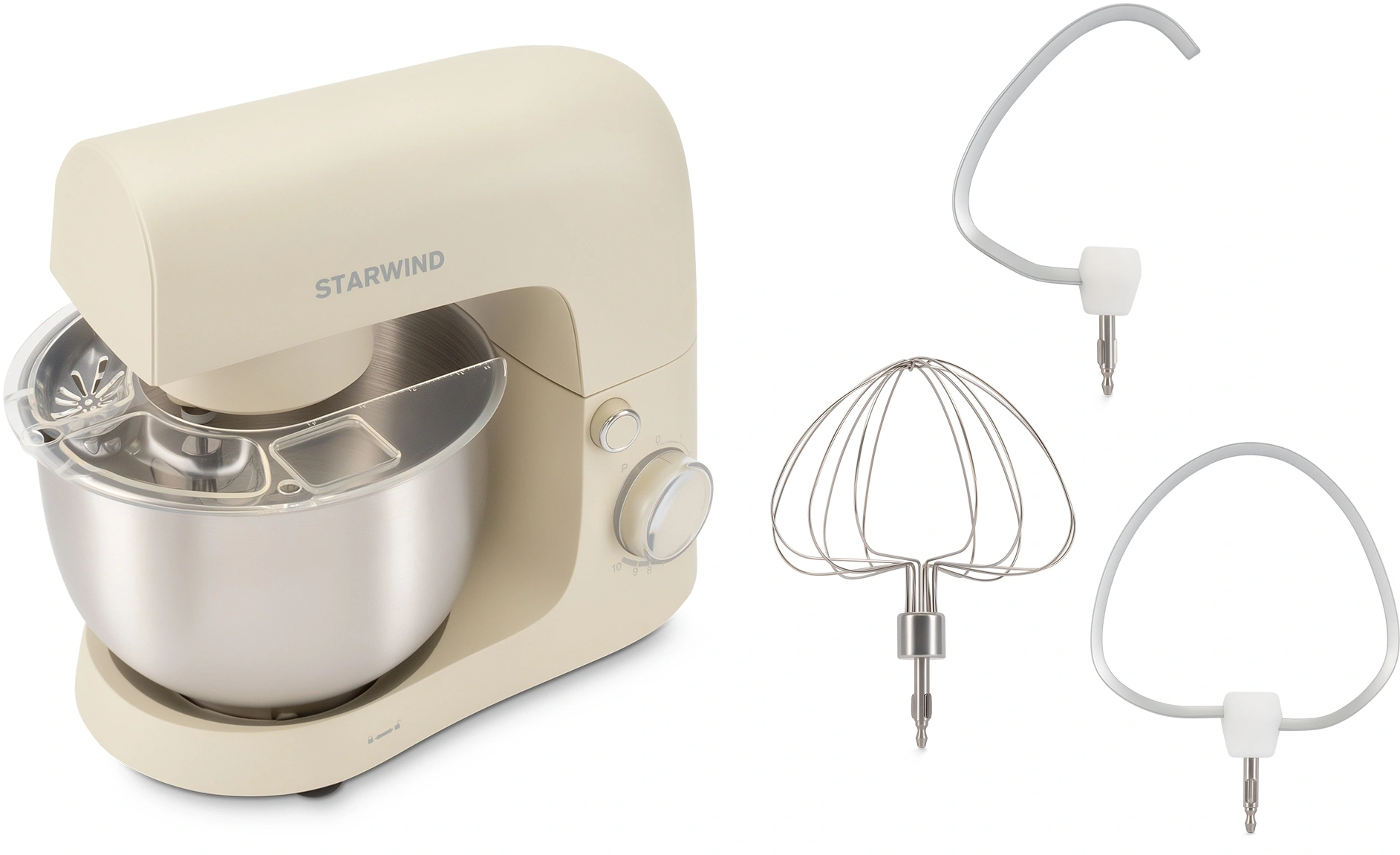 Планетарный миксер Starwind SPM2152 — это незаменимый помощник на кухне. Благодаря своей мощности в 1500 Вт и трем насадкам в комплекте, он позволяет выполнять множество задач: замес теста, взбивание белков и сливок, смешивание ингредиентов для соусов и кремов.