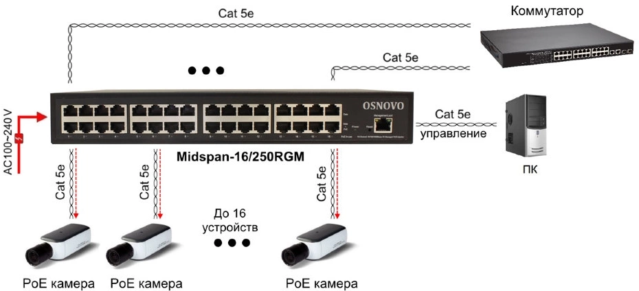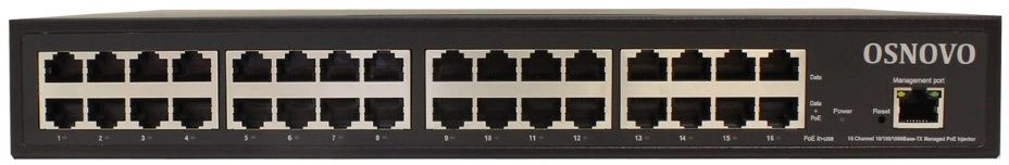 Инжектор Midspan16/250RGM, кабель питания, монтажный комплект (в стойку 19”), руководство пользователя, упаковка.