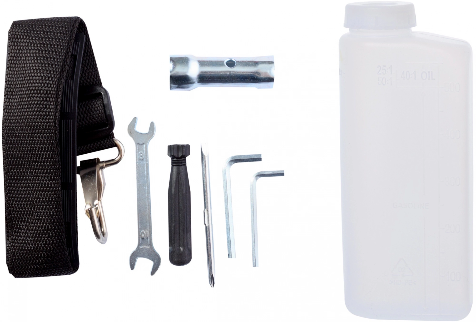 Защитный кожух; Наплечный ремень одинарный; Шпулька с леской; 3х лопастной диск; Ёмкость для приготовления топливной смеси; Крепёж; Нож к защитному щитку; Шестигранный ключ 2 шт; Гаечный ключ; Свечной ключ; Отвёртка; Инструкция по эксплуатации