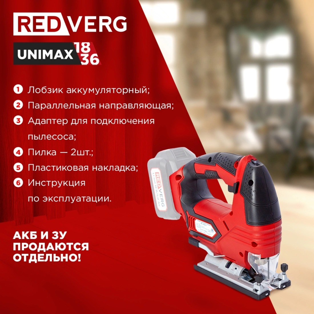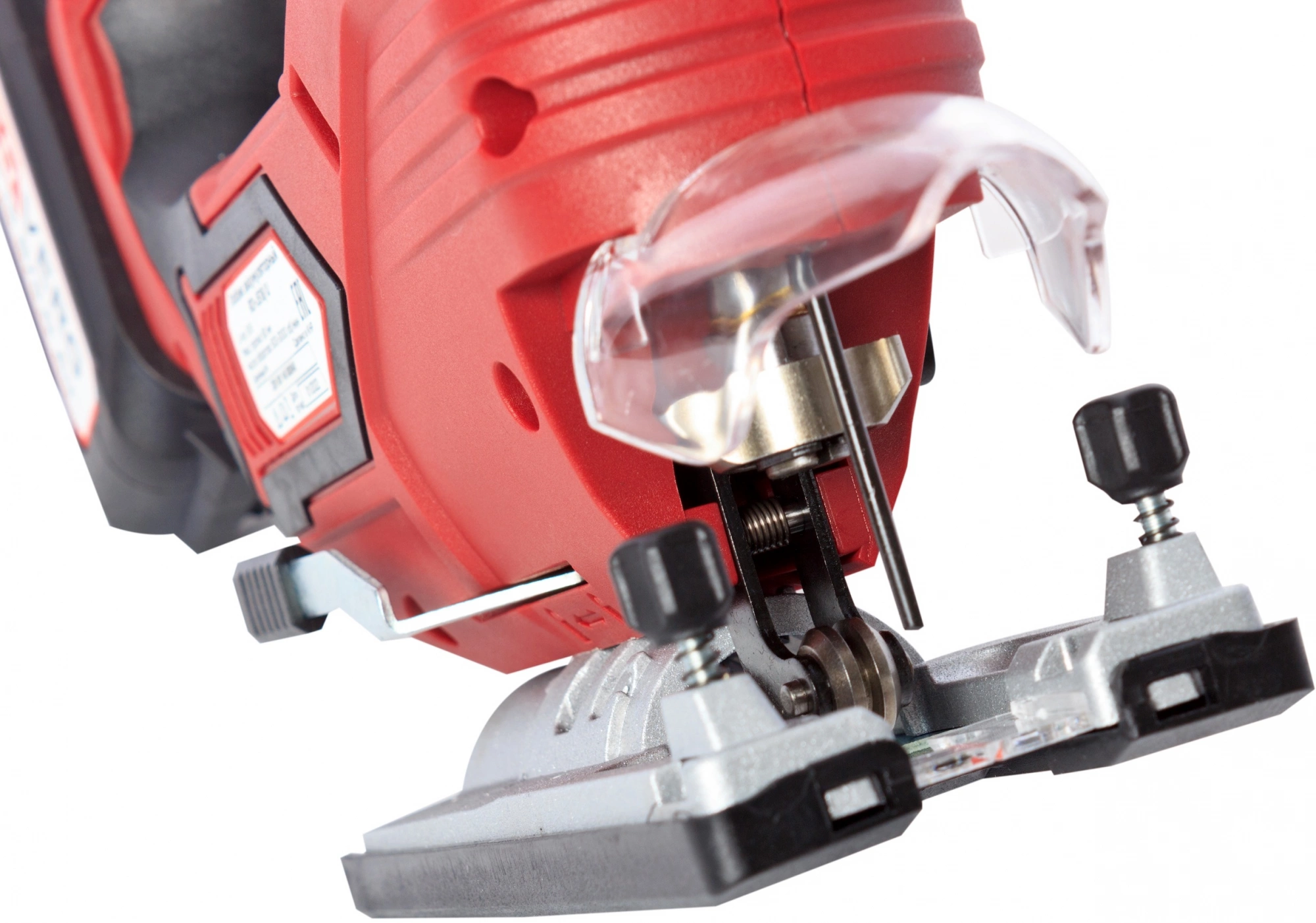 Аккумуляторный лобзик, параллельная направляющая, адаптер для подключения пылесоса, пилка - 2 шт., пластиковая накладка, инструкция по эксплуатации.