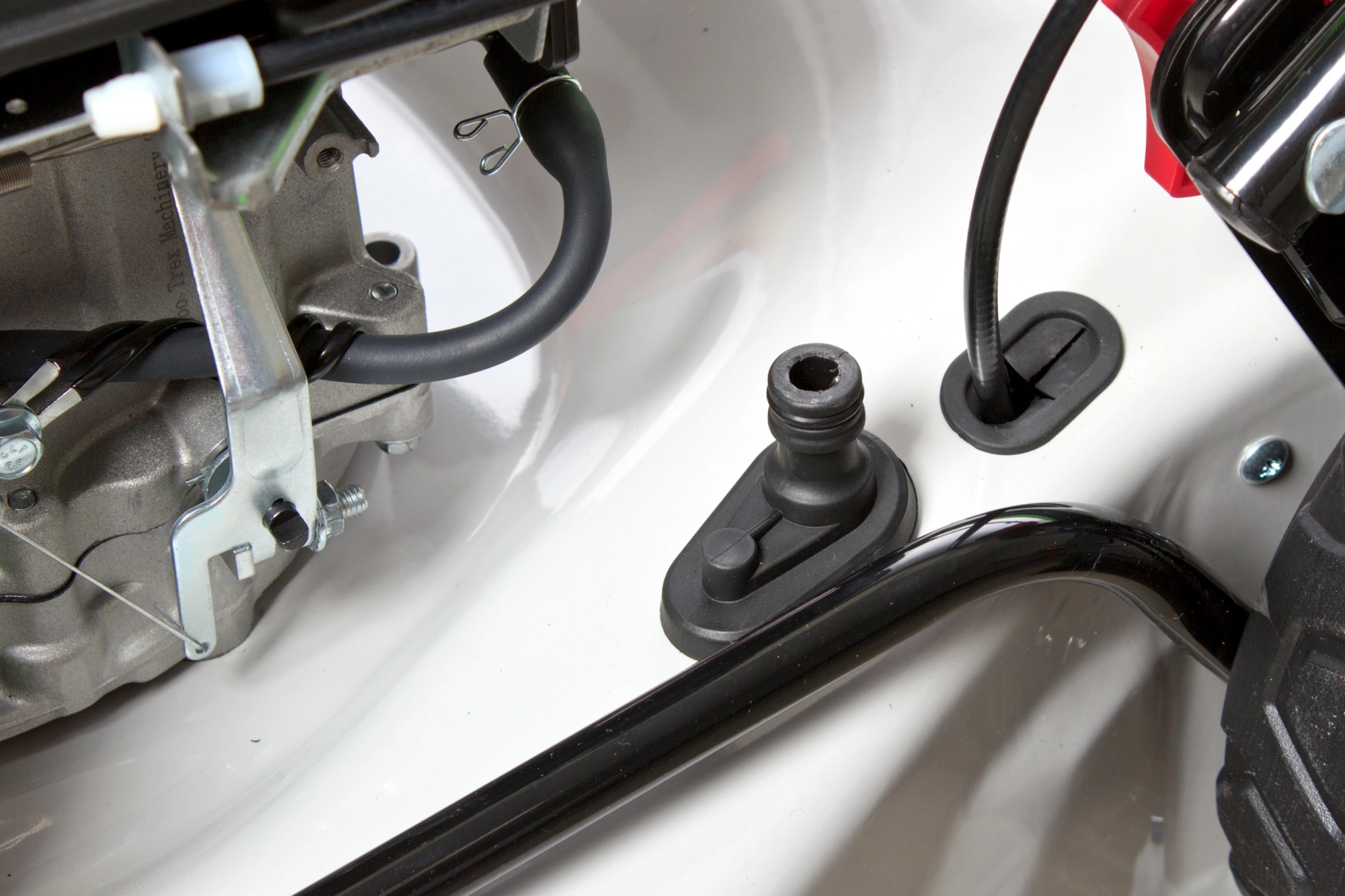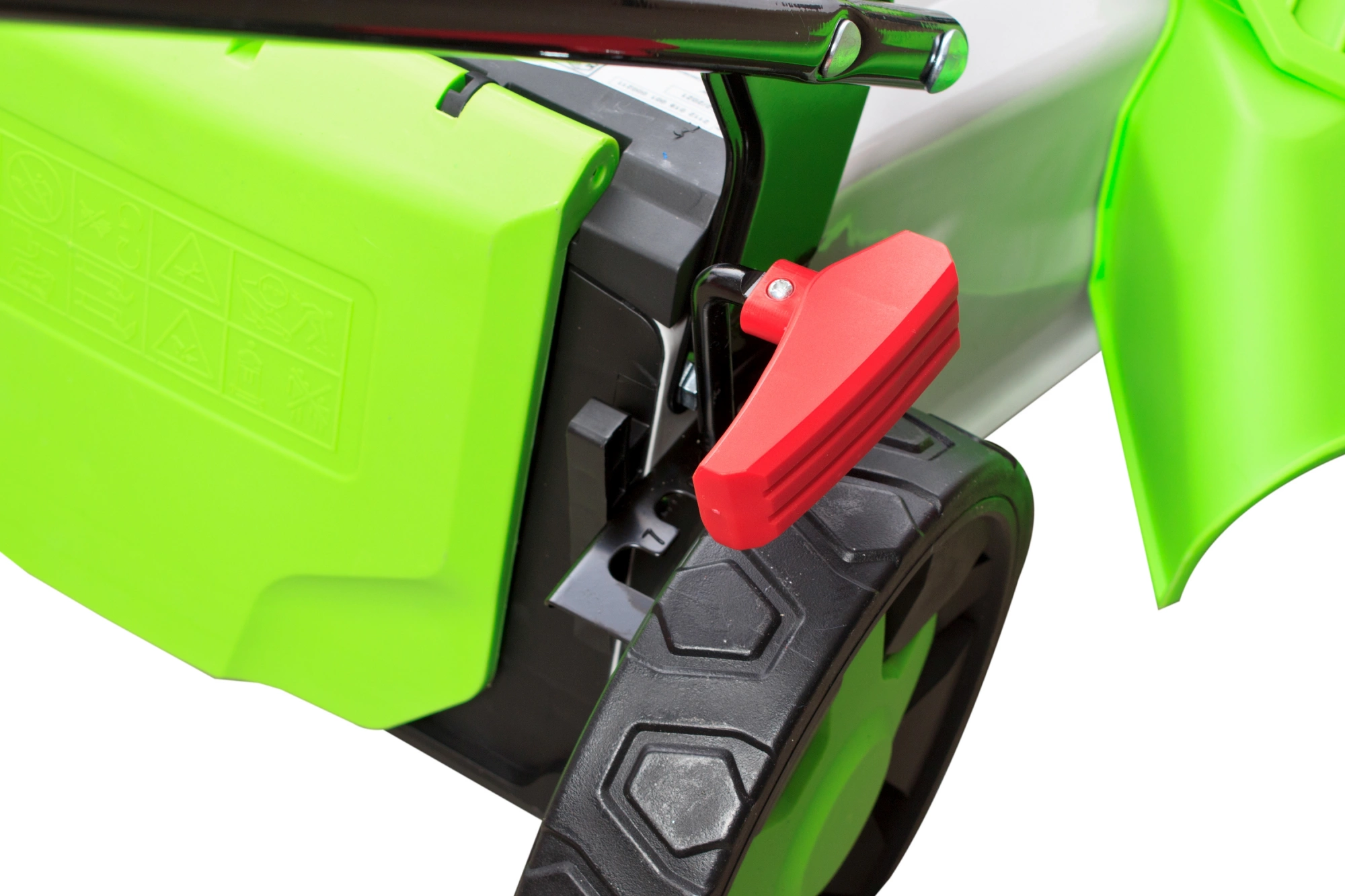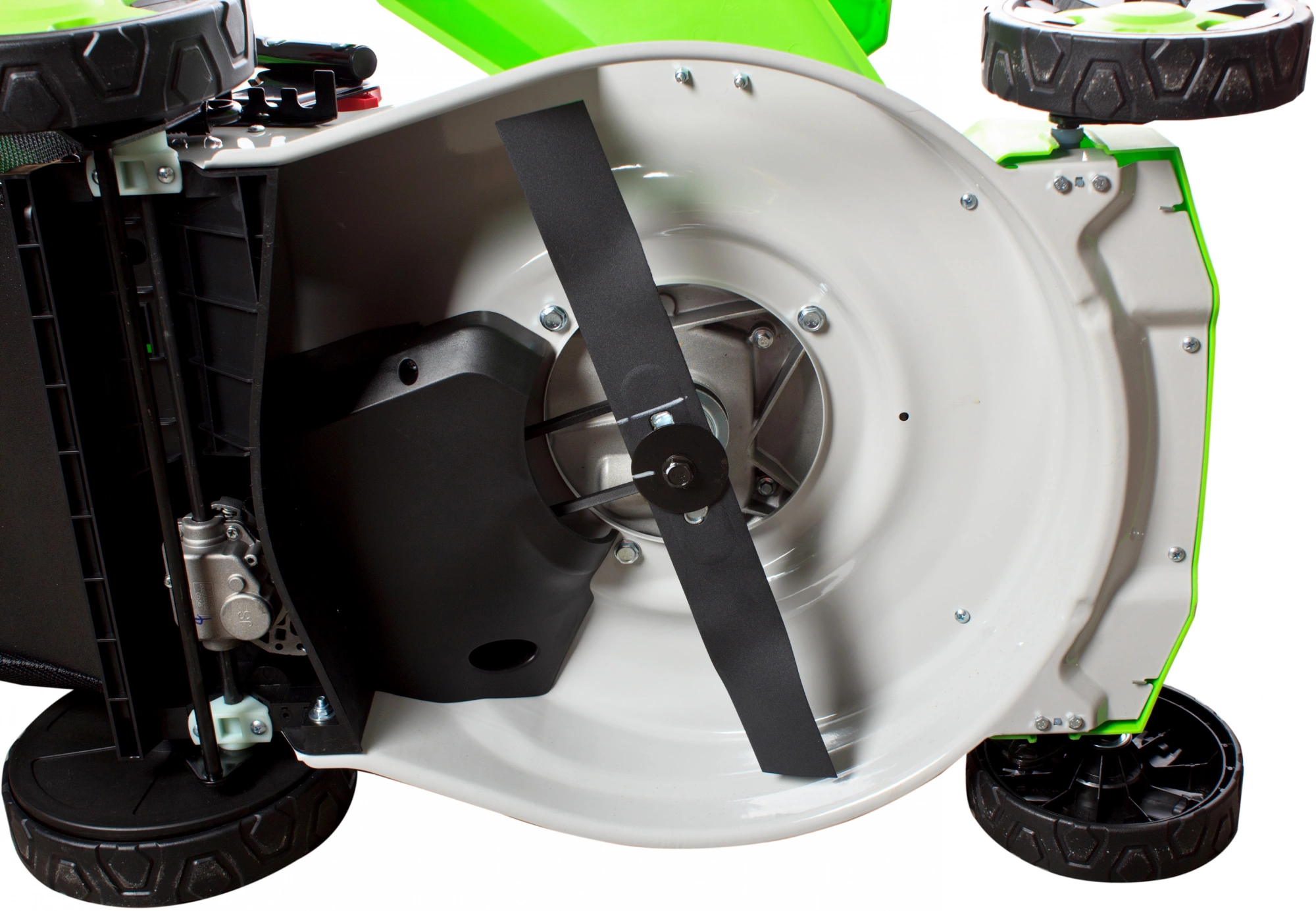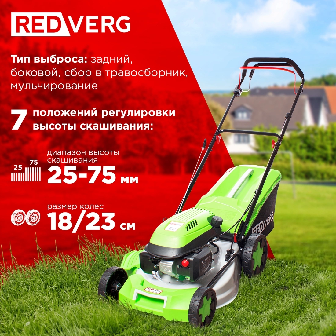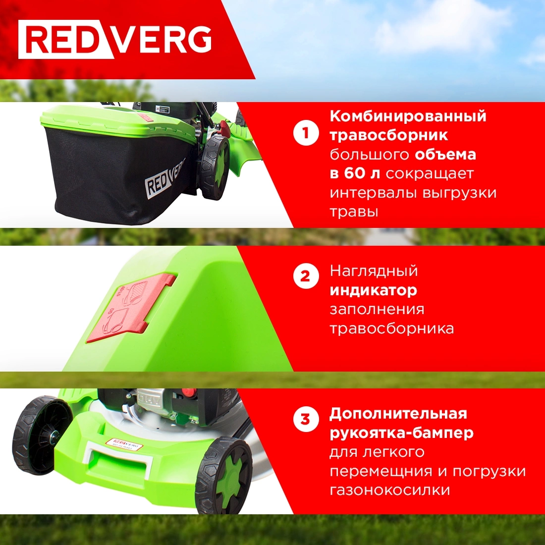 индикатор заполнения травосборника, мульчирование, подходит для неровных участков, регулировка высоты скашивания, складная ручка