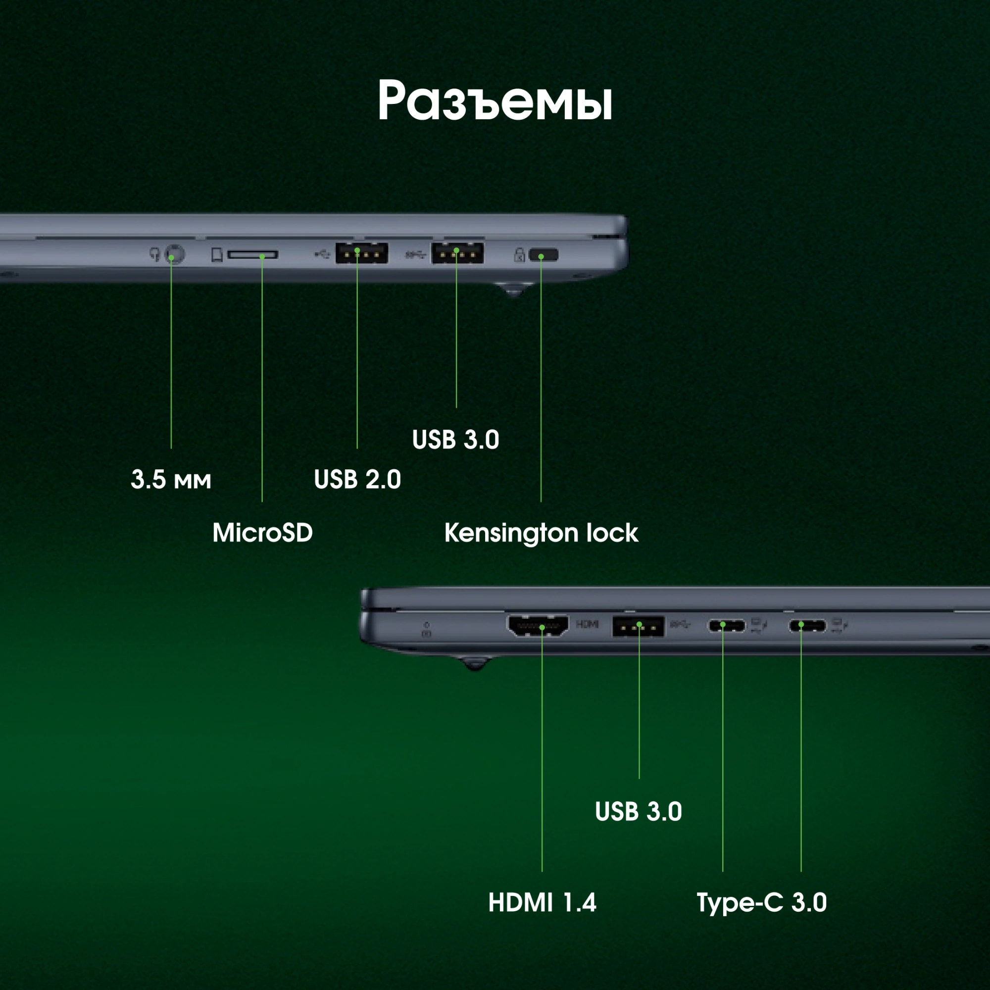 Удобство подключения: Ноутбуки Pactos оборудованы необходимым набором портов — от USB 3.0 Type-C/Type-A до разъема HDMI. Кроме того, они также оснащены разъемом для наушников и слотом для карт памяти microSD.