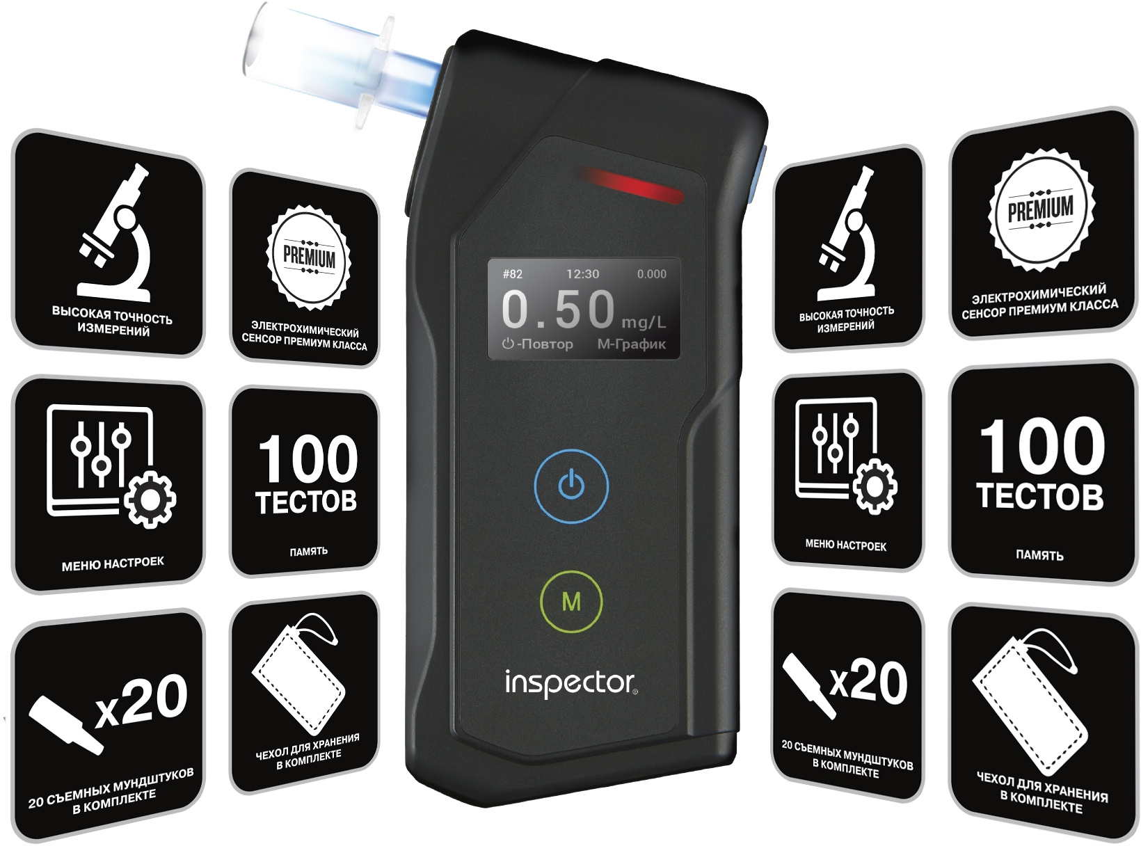 Профессиональный электрохимический алкотестер Inspector AT1100 предназначен для измерения концентрации алкоголя в выдыхаемом человеком воздухе. Прибор разработан как для индивидуального, так и для корпоративного использования, подходит для контроля и проверки большого количества людей