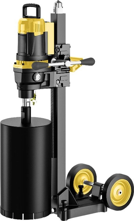 Прочная стальная сверлильная стойка с кареткой, устойчивая к деформациям, обеспечивает точность сверления и исключают вибрацию; Дисплей; Защита от перегрузки двигателя; Защита редуктора при заклинивании коронки; Колеса в комплекте для удобной транспортировки.