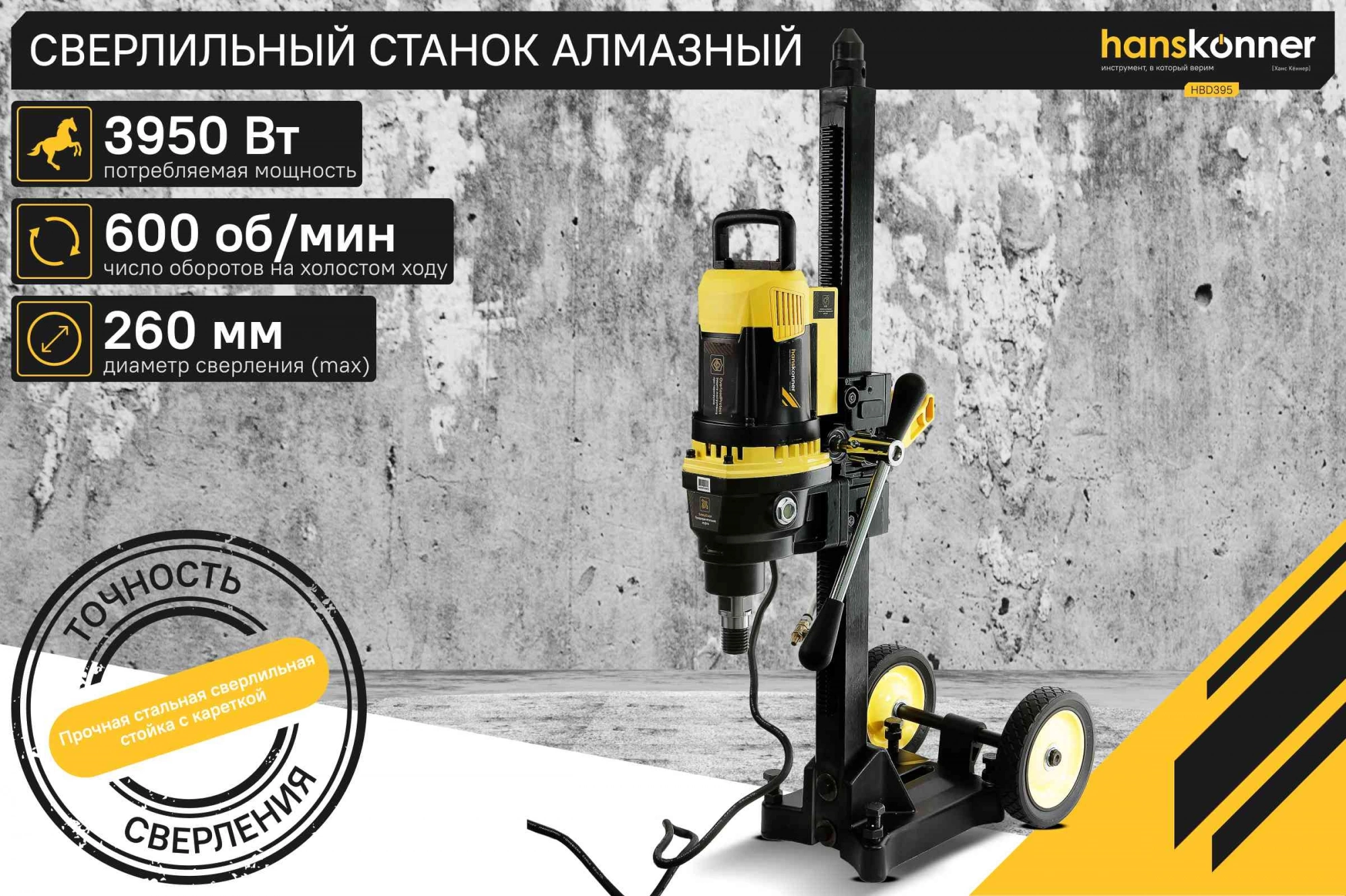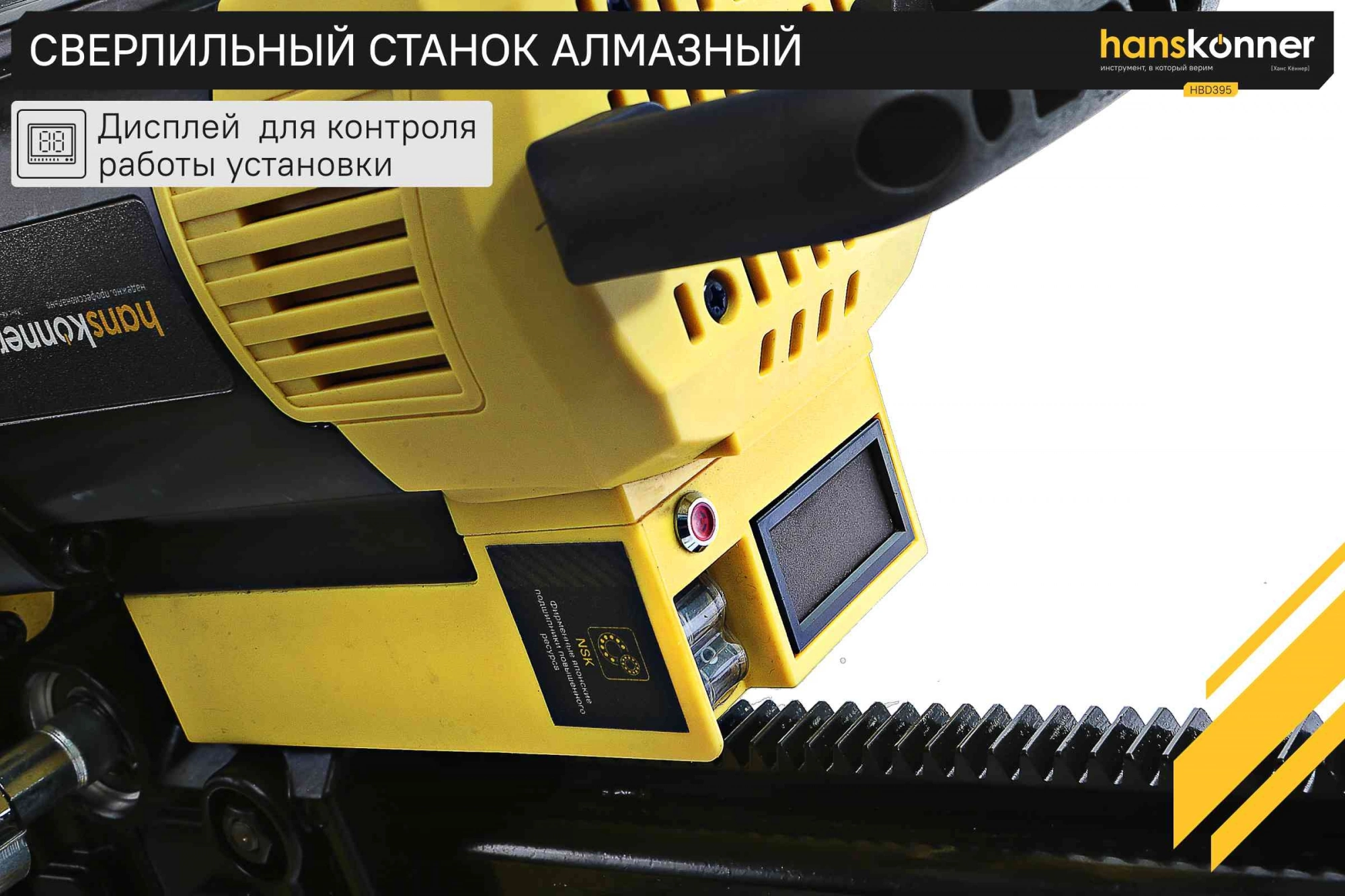 Станок алмазного сверления Hanskonner HBD395 — надежный и мощный электроинструмент для мокрого сверления алмазными коронками отверстий в таких материалах: бетон, железобетон, искусственный и натуральный камень, кирпич. Данная модель оснащена LCD дисплеем, что позволяет контролировать обороты и нагр