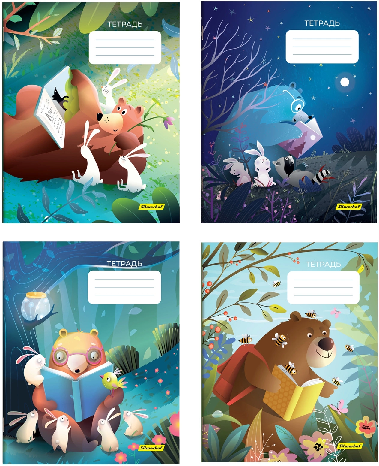 Набор тетрадей Silwerhof 18л. клет. A5 Лесные друзья 4диз. мел.карт. вод.лак скрепка (упак.:4шт)